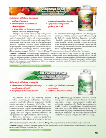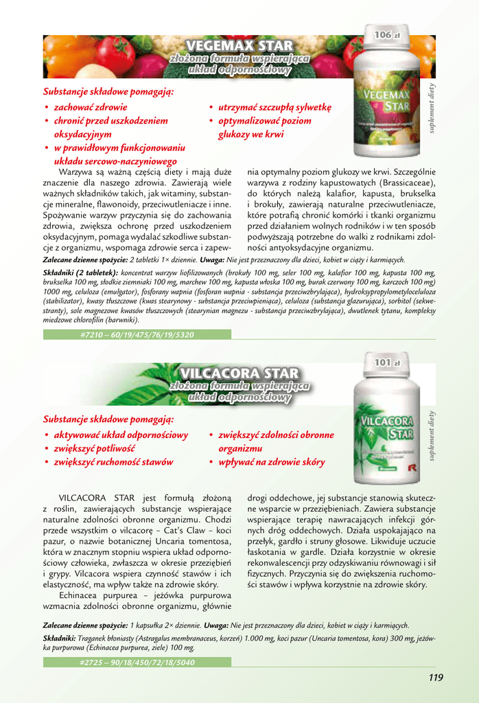 VEGEMAX STAR 106 zł suplement diety złożona formuła wspierająca układ odpornościowy Substancje składowe pomagają: • zachować zdrowie • chronić przed uszkodzeniem oksydacyjnym • w prawidłowym funkcjonowaniu układu sercowo-naczyniowego • utrzymać szczupłą sylwetkę • optymalizować poziom glukozy we krwi Warzywa są ważną częścią diety i mają duże znaczenie dla naszego zdrowia. Zawierają wiele ważnych składników takich, jak witaminy, substancje mineralne, flawonoidy, przeciwutleniacze i inne. Spożywanie warzyw przyczynia się do zachowania zdrowia, zwiększa ochronę przed uszkodzeniem oksydacyjnym, pomaga wydalać szkodliwe substancje z organizmu, wspomaga zdrowie serca i zapew- nia optymalny poziom glukozy we krwi. Szczególnie warzywa z rodziny kapustowatych (Brassicaceae), do których należą kalafior, kapusta, brukselka i brokuły, zawierają naturalne przeciwutleniacze, które potrafią chronić komórki i tkanki organizmu przed działaniem wolnych rodników i w ten sposób podwyższają potrzebne do walki z rodnikami zdolności antyoksydacyjne organizmu. Zalecane dzienne spożycie: 2 tabletki 1× dziennie. Uwaga: Nie jest przeznaczony dla dzieci, kobiet w ciąży i karmiących. Składniki (2 tabletek): koncentrat warzyw liofilizowanych (brokuły 100 mg, seler 100 mg, kalafior 100 mg, kapusta 100 mg, brukselka 100 mg, słodkie ziemniaki 100 mg, marchew 100 mg, kapusta włoska 100 mg, burak czerwony 100 mg, karczoch 100 mg) 1000 mg, celuloza (emulgator), fosforany wapnia (fosforan wapnia - substancja przeciwzbrylająca), hydroksypropylometyloceluloza (stabilizator), kwasy tłuszczowe (kwas stearynowy - substancja przeciwpieniąca), celuloza (substancja glazurująca), sorbitol (sekwestranty), sole magnezowe kwasów tłuszczowych (stearynian magnezu - substancja przeciwzbrylająca), dwutlenek tytanu, kompleksy miedzowe chlorofilin (barwniki). #7210 – 60/19/475/76/19/5320 VILCACORA STAR 101 zł Substancje składowe pomagają: • aktywować układ odpornościowy • zwiększyć potliwość • zwiększyć ruchomość stawów • zwiększyć zdolności obronne organizmu • wpływać na zdrowie skóry VILCACORA STAR jest formułą złożoną z roślin, zawierających substancje wspierające naturalne zdolności obronne organizmu. Chodzi przede wszystkim o vilcacorę – Cat’s Claw – koci pazur, o nazwie botanicznej Uncaria tomentosa, która w znacznym stopniu wspiera układ odpornościowy człowieka, zwłaszcza w okresie przeziębień i grypy. Vilcacora wspiera czynność stawów i ich elastyczność, ma wpływ także na zdrowie skóry. Echinacea purpurea – jeżówka purpurowa wzmacnia zdolności obronne organizmu, głównie suplement diety złożona formuła wspierająca układ odpornościowy drogi oddechowe, jej substancje stanowią skuteczne wsparcie w przeziębieniach. Zawiera substancje wspierające terapię nawracających infekcji górnych dróg oddechowych. Działa uspokajająco na przełyk, gardło i struny głosowe. Likwiduje uczucie łaskotania w gardle. Działa korzystnie w okresie rekonwalescencji przy odzyskiwaniu równowagi i sił fizycznych. Przyczynia się do zwiększenia ruchomości stawów i wpływa korzystnie na zdrowie skóry. Zalecane dzienne spożycie: 1 kapsułka 2× dziennie. Uwaga: Nie jest przeznaczony dla dzieci, kobiet w ciąży i karmiących. Składniki: Traganek błoniasty (Astragalus membranaceus, korzeń) 1.000 mg, koci pazur (Uncaria tomentosa, kora) 300 mg, jeżówka purpurowa (Echinacea purpurea, ziele) 100 mg. #2725 – 90/18/450/72/18/5040 119