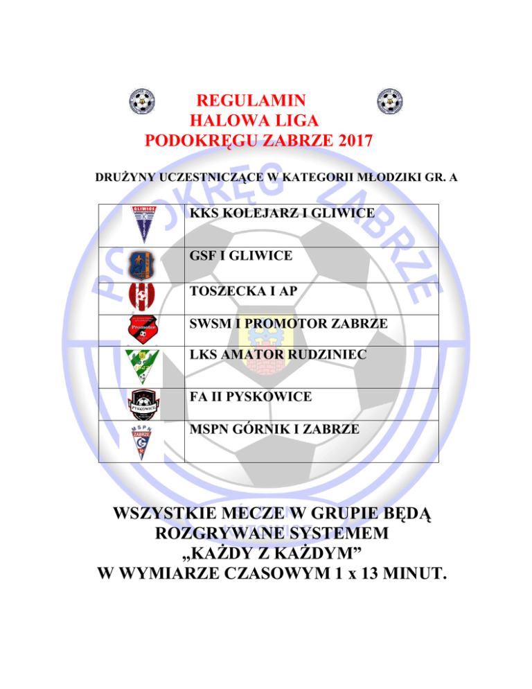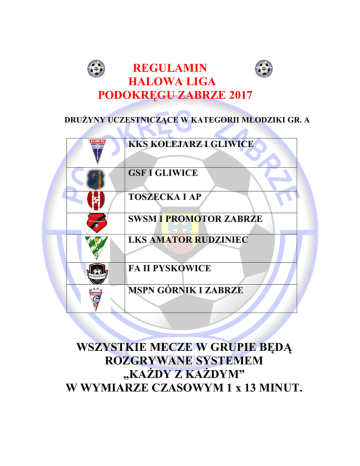 REGULAMIN HALOWA LIGA PODOKRĘGU ZABRZE 2017 DRUŻYNY UCZESTNICZĄCE W KATEGORII MŁODZIKI GR. A KKS KOLEJARZ I GLIWICE GSF I GLIWICE TOSZECKA I AP SWSM I PROMOTOR ZABRZE LKS AMATOR RUDZINIEC FA II PYSKOWICE MSPN GÓRNIK I ZABRZE WSZYSTKIE MECZE W GRUPIE BĘDĄ ROZGRYWANE SYSTEMEM „KAŻDY Z KAŻDYM” W WYMIARZE CZASOWYM 1 x 13 MINUT. REGULAMIN HALOWA LIGA PODOKRĘGU ZABRZE 2017 DRUŻYNY UCZESTNICZĄCE W KATEGORII MŁODZIKI GR. B FA I PYSKOWICE UKS MILENIUM GKS GWAREK I ORNONTOWICE LKS ORZEŁ I STANICA MKS I ZABORZE KKS KOLEJARZ II GLIWICE TOSZECKA II AP WSZYSTKIE MECZE W GRUPIE BĘDĄ ROZGRYWANE SYSTEMEM „KAŻDY Z KAŻDYM” W WYMIARZE CZASOWYM 1 x 13 MINUT. REGULAMIN HALOWA LIGA PODOKRĘGU ZABRZE 2017 DRUŻYNY UCZESTNICZĄCE W KATEGORII MŁODZIKI GR. C GKS GWAREK II ORNONTOWICE MKS SOŚNICOWICE LKS ORZEŁ II STANICA SWSM PROMOTOR II ZABRZE MSPN GÓRNIK II ZABRZE GSF II GLIWICE LKS NAPRZÓD PONISZOWICE WSZYSTKIE MECZE W GRUPIE BĘDĄ ROZGRYWANE SYSTEMEM „KAŻDY Z KAŻDYM” W WYMIARZE CZASOWYM 1 x 13 MINUT. REGULAMIN HALOWA LIGA PODOKRĘGU ZABRZE 2017 DRUŻYNY UCZESTNICZĄCE W KATEGORII MŁODZIKI GR. D LKS STRAŻAK MIKOŁÓW GSF III GLIWICE KS MOSiR SPARTA ZABRZE LKS POGOŃ ZIEMIĘCICE KS SOŚNICA GLIWICE MKS II ZABORZE LKS 35 GIERAŁTOWICE WSZYSTKIE MECZE W GRUPIE BĘDĄ ROZGRYWANE SYSTEMEM „KAŻDY Z KAŻDYM” W WYMIARZE CZASOWYM 1 x 13 MINUT. REGULAMIN HALOWA LIGA PODOKRĘGU ZABRZE 2017 1. Cel zawodów popularyzacja zdrowego trybu życia oraz gry w piłkę nożną na hali - futsal wyłonienie najlepszych drużyn młodzików w „HLPZ Śl. ZPN Podokręg Zabrze 2017” 2. Terminy zawodów i miejsce Halowa Liga w dniach: - Gr. A - 22.01.2017 r. w godzinach 13:30-19:00 hala sportowa przy ulicy Zamkowej 23 w Wielowsi - Gr. B - 29.01.2017 r. w godzinach 12:00-18:00 hala sportowa przy ulicy Gliwicka 32 w Pyskowicach - Gr. C - 25.02.2017 r. w godzinach 09:00-15:00 hala sportowa przy ulicy Zamkowej 23 w Wielowsi - Gr. D - 25.02.2017 r. w godzinach 10:00-16:00 hala sportowa przy ulicy Sikorskiego 130 w Gliwicach-Sośnicy Osoba kontaktowa Barbara Knebel – Tel. 501-857-917 3. Uczestnictwo a/ zasady udziału w rozgrywkach turniej organizowany jest dla drużyn piłkarskich występujących w różnych klasach rozgrywkowych drużyny mogą również składać się z dowolnie dobranych zawodników którzy wystąpią pod jedną wspólną nazwą w rozgrywkach mogą brać udział zawodnicy z roczników 2004 i 2005 b/ warunkiem uczestnictwa jest zgłoszenie zespołu maksymalnie 12 osobowego plus trener-opiekun (lista zgłoszeniowa drużyny jest taka sama podczas rozgrywek grupowych jak i podczas Wielkiego Finału) dokonanie opłaty startowej bezzwrotnej posiadanie przez cały czas trwania dowodu tożsamości posiadanie przez zawodników aktualnych badań lekarskich (odpowiedzialność spada na opiekuna drużyny) c/ przystąpienie drużyny do rozgrywek jest jednoznaczne z akceptacją niniejszego regulaminu REGULAMIN HALOWA LIGA PODOKRĘGU ZABRZE 2017 4. Sposób punktowania zwycięstwo – 3 pkt remis – 1 pkt porażka – 0 pkt 5. Dyskwalifikacje podejmuje organizator oraz sędzia prowadzący zawody na pisemny wniosek opiekuna drużyny biorącej udział w turnieju protesty przyjmowane są przez organizatora tylko podczas trwania turnieju w danym dniu przy składaniu wniosku wnioskodawca jest zobowiązany podać dane dotyczące zawodnika, co do którego wnosi się protest tj. imię , nazwisko, drużynę w której występował po zakończeniu turnieju wyniki nie podlegają weryfikacji 6. Nagrody i wyróżnienia Drużynowe – trzy najlepsze drużyny w turniej Nagrody indywidualne (najlepszy strzelec, najlepszy bramkarz i najlepszy zawodnik) 7. Postanowienia końcowe obowiązuje obuwie sportowe parking znajduje się przy hali i jest niestrzeżony wszyscy uczestnicy ubezpieczają się od następstw nieszczęśliwych wypadków we własnym zakresie; na żądanie organizatora należy je przedstawić pod rygorem nie dopuszczenia do gry organizator nie odpowiada za rzeczy osobiste i inne pozostawione na obiekcie sportowym rozstrzyganie spraw spornych oraz interpretacja niniejszego regulaminu należy do organizatora Skrócone przepisy gry 1. Zasady ogólne czas gry wynosi raz 12min., bez przerwy , czas odmierza zegar boiskowy lub osoba prowadząca zawody, który kończy grę syreną bądź sędzia gwizdkiem mierzący czas zatrzymuje zegar w trakcje meczu na wyraźne wskazanie przez sędziego głównego gra odbywa się na boisku o wymiarach 20 x 40 m bramka ma wymiary 3 x 2 m pole bramkowe wyznacza linia 6 m od piłki ręcznej REGULAMIN HALOWA LIGA PODOKRĘGU ZABRZE 2017 2. Zawodnicy: drużyna liczy z rezerwowymi max 12 zawodników w turnieju (w przypadku gdy klub-stowarzyszenie zgłosi więcej niż jedną drużynę rozgrywkach danej kategorii wiekowej lub w całych rozgrywkach HLPZ zawodnicy mogą być wpisani tylko do jednej drużyny) w grze bezpośrednio bierze udział 5 zawodników w tym bramkarz, ilość zmian w trakcie meczu dowolna, zmiany tzw. hokejowe w wyznaczonej od strony trybun od strony własnej ławki rezerwowych a. Rzuty: bramka jest uznana gdy piłka całym obwodem przejdzie za linię bramkową, rzut karny wykonuje się z linii 7 m., auty boczne wykonuje się nogą z linii boiska, aut bramkowy bramkarz wybija nogą lub ręką w obrębie całego boiska, za dotknięcie piłką konstrukcji dachu przyznaje się rzut autowy z boku bramkę można zdobyć bezpośrednio z rzutu wolnego bezpośredniego, rozpoczęcia gry, rzutu rożnego lub dowolnego strzału samobójczego, nie uznaje się bramki zdobytej bezpośrednio z autu bocznego i bramkowego oraz rzutu pośredniego sygnalizowanego przez sędziego przez podniesienie ręki, na wykonanie wszystkich tzw. stałych fragmentów gry drużyna ma 4 sekundy przy prawidłowym ustawieniu rywali. Po przekroczeniu czasu piłkę przejmuje drużyna przeciwna, odległość obrońcy od piłki podczas wykonywania rzutów i autów wynosi minimum 3 m (kara ostrzeż