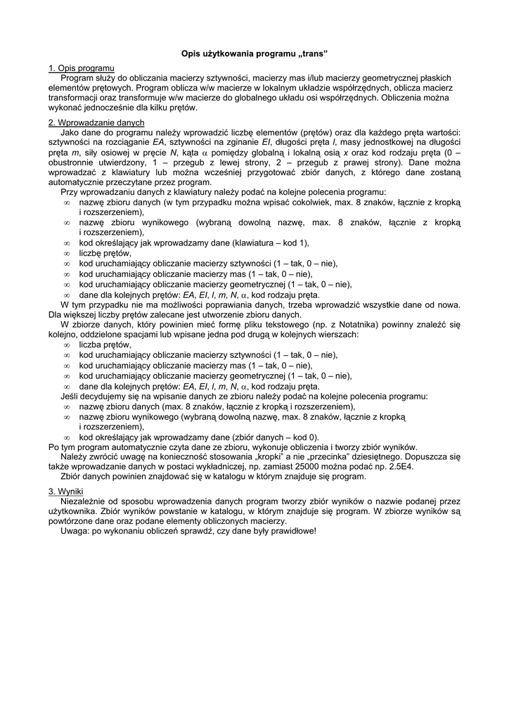 1. Opis programu Program słuŜy do obliczania macierzy sztywności, macierzy mas i/lub macierzy geometrycznej płaskich elementów prętowych. Program oblicza w/w macierze w lokalnym układzie współrzędnych, oblicza macierz transformacji oraz transformuje w/w macierze do globalnego układu osi współrzędnych. Obliczenia moŜna wykonać jednocześnie dla kilku prętów. 2. Wprowadzanie danych Jako dane do programu naleŜy wprowadzić liczbę elementów (prętów) oraz dla kaŜdego pręta wartości: sztywności na rozciąganie EA, sztywności na zginanie EI, długości pręta l, masy jednostkowej na długości pręta m, siły osiowej w pręcie N, kąta α pomiędzy globalną i lokalną osią x oraz kod rodzaju pręta (0 – obustronnie utwierdzony, 1 – przegub z lewej strony, 2 – przegub z prawej strony). Dane moŜna wprowadzać z klawiatury lub moŜna wcześniej przygotować zbiór danych, z którego dane zostaną automatycznie przeczytane przez program. Przy wprowadzaniu danych z klawiatury naleŜy podać na kolejne polecenia programu: • nazwę zbioru danych (w tym przypadku moŜna wpisać cokolwiek, max. 8 znaków, łącznie z kropką i rozszerzeniem), • nazwę zbioru wynikowego (wybraną dowolną nazwę, max. 8 znaków, łącznie z kropką i rozszerzeniem), • kod określający jak wprowadzamy dane (klawiatura – kod 1), • liczbę prętów, • kod uruchamiający obliczanie macierzy sztywności (1 – tak, 0 – nie), • kod uruchamiający obliczanie macierzy mas (1 – tak, 0 – nie), • kod uruchamiający obliczanie macierzy geometrycznej (1 – tak, 0 – nie), • dane dla kolejnych prętów: EA, EI, l, m, N, α, kod rodzaju pręta. W tym przypadku nie ma moŜliwości poprawiania danych, trzeba wprowadzić wszystkie dane od nowa. Dla większej liczby prętów zalecane jest utworzenie zbioru danych. W zbiorze danych, który powinien mieć formę pliku tekstowego (np. z Notatnika) powinny znaleźć się kolejno, oddzielone spacjami lub wpisane jedna pod drugą w kolejnych wierszach: • liczba prętów, • kod uruchamiający obliczanie macierzy sztywności (1 – tak, 0 – nie), • kod uruchamiający obliczanie macierzy mas (1 – tak, 0 – nie), • kod uruchamiający obliczanie macierzy geometrycznej (1 – tak, 0 – nie), • dane dla kolejnych prętów: EA, EI, l, m, N, α, kod rodzaju pręta. Jeśli decydujemy się na wpisanie danych ze zbioru naleŜy podać na kolejne polecenia programu: • nazwę zbioru danych (max. 8 znaków, łącznie z kropką i rozszerzeniem), • nazwę zbioru wynikowego (wybraną dowolną nazwę, max. 8 znaków, łącznie z kropką i rozszerzeniem), • kod określający jak wprowadzamy dane (zbiór danych – kod 0). Po tym program automatycznie czyta dane ze zbioru, wykonuje obliczenia i tworzy zbiór wyników. NaleŜy zwrócić uwagę na konieczność stosowania „kropki” a nie „przecinka” dziesiętnego. Dopuszcza się takŜe wprowadzanie danych w postaci wykładniczej, np. zamiast 25000 moŜna podać np. 2.5E4. Zbiór danych powinien znajdować się w katalogu w którym znajduje się program. 3. Wyniki NiezaleŜnie od sposobu wprowadzenia danych program tworzy zbiór wyników o nazwie podanej przez uŜytkownika. Zbiór wyników powstanie w katalogu, w którym znajduje się program. W zbiorze wyników są powtórzone dane oraz podane elementy obliczonych macierzy. Uwaga: po wykonaniu obliczeń sprawdź, czy dane były prawidłowe!