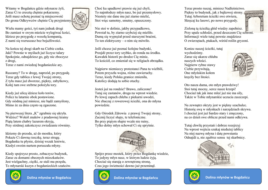 Witamy w Bogdańcu gdzie młynarze żyli, Zaraz Ci to zresztą chętnie pokarzemy. Jeśli masz ochotę poznać tą miejscowość Do grona Odkrywców chętnie Cię przyjmiemy. Choć ku upadkowi prawie się już chyli, To najmłodszy młyn nasz, bo już przemysłowy. Niestety nie dane mu już ziarno mielić, Stoi więc samotny, smutny, opuszczony. Teraz prosto ruszaj, miniesz Nadleśnictwo. Piękny to budynek, jak z bajkowej strony. Tutaj Arboretum ścieżki swe otwiera, Skręcaj ku lasowi, po nowe przygody. Wielu mamy gości, tyś nam jednak drogi Bo zamiast w swym mieście wylegiwać kości, Idziesz po przygodę z wesołą kompanią, Z nami się rozruszasz bez bojaźliwości. Nie stoi w dolinie, jakby przypadkowo, Powstał tu, by ziarno szybciej się mieliło. Dumą się wyprężał przed starszymi braćmi, To ten elektryczny – o nim się mówiło. Zieloną tą ścieżką głód wiedzy zapełnisz. Przy upale schłodzi, przed deszczem Cię schroni. Informacji wiele tutaj pewnie znajdziesz O zwierzętach, ptakach, wśród roślin gryzoni. Na końcu tej drogi skarb na Ciebie czeka. Jaki? Pewnie w myślach już liczysz talary Spokojnie, odnajdziesz go, gdy nie zboczysz z drogi, Teraz z nami zwiedzaj bogdanieckie ary. Jeśli chcesz już poznać kolejne budynki, Przejdź przez tory szybko, do ronda na środku. Kawałek historii po drodze Cię minie, To kościół, co zmieniał się w religiach obrządku. Koniec naszej ścieżki, tutaj wychodzimy. Zaraz się ukarze chluba naszych włości. Najpierw rybne stawy Ciebie przywitają, One młyńskim kołem kręciły bez litości. Ruszamy? To w drogę, naprzód, po przygodę. Teraz gdy tablica z lewej Twojej strony, Z tyłu masz już dworzec, piękny, zabytkowy, Kolej tam swe srebrne położyła tory. Najpierw niemieccy protestanci Pana tu wielbili, Potem przyszła wojna, różne zawieruchy. Teraz, kiedy Polska granice zmieniła, Katolicy dodają tu sobie otuchy. Kiedy już ulicą idziesz koło torów, Policz tu latarnie obok postawione. Gdy siódmą już miniesz, nie bądź zamyślony, Mimo że za dnia często są zgaszone. Jesteś już na rondzie? Brawo, zaliczone! Tutaj się zastanów, droga na wprost wiedzie. Po lewej zapach chleba z piekarni uwodzi, Nie zbaczaj z rowerowej ścieżki, ona do młyna powiedzie. Na pierwszej litera „K” zgrabnie się ukryła. Widzisz? Wokół znaków z pradawnej krainy Piątą latem chabry lazurem okryją, Przy siódmej zakończysz zwiedzanie równiny. Gdy Ośrodek Zdrowia z prawej Twojej strony, Zacznij liczyć słupy, te telefoniczne. Bo przy piątym słupie wcale nie ruiny, Tylko dolny młyn schował Ci się sprytnie. Idziemy do przodu, aż do mostku, który Pokaże Ci dawną rzeczkę, teraz strugę. Bogdanka tu płynie, dzisiaj wszak leniwie, Kiedyś swoim nurtem poruszała młyny. Kiedy spojrzysz prosto, zobaczysz budynek, Zaraz za domami obecnych mieszkańców. Jest wielgachny, ciężki, ze stali ma przęsła, To młynarski kuzyn z bogdanieckich szańców. Dolina młynów w Bogdańcu Oto nasza duma, oto młyn prawdziwy! Stoi tutaj mocny, serce nasze krzepi! Chociaż tak jak inne mleć już nie ma siły, Także w Tobie młynarskie uczucia zaszczepi. Na zewnątrz okryty jest w piękny szachulec. Historię swą w młynkach i narzędziach skrywa. I chociaż jest już bardzo stary i zmęczony, na co dzień swe oblicze przed nami odkrywa. Tutaj chwilę przystań i dobrze rozejrzyj Na wprost wejścia szukaj niedużej tablicy Na niej nazwę młyna i datę powstania Odnajdź a, nie zgubisz sensu tej skarbnicy. Spójrz przez mostek, który przez Bogdankę wiedzie, To jedyny młyn nasz, w którym ludzie żyją. Chociaż się starają o zewnętrzną stronę, Czas jego świetności dawno już przeminął. Dolina młynów w Bogdańcu Dolina młynów w Bogdańcu Czas już w drogę ruszać. Dalej! nie przystawaj! Musisz wyjść już z młyna, stawy pozostawić. Drogą wracasz główną, już nie idziesz lasem, Zaraz za domami z nami się pobawisz. Historia młynarstwa teraz już za Tobą. Pora wracać do miejsca, z któregoś wyruszył. Najpierw minąć rondo, a potem wzdłuż torów Dojdziesz do tablicy gdzie skarb Cię ogłuszy. Ile domków mijasz, ile ludzkich siedzib? Licz po lewej stronie, pierwszy jest leśnika. Pięć domostw przepięknych, teraz stare mury, Przystań tu, zagadka czeka dla każdego uczestnika. Już Ci się udało. Szybko wpisuj hasło! Teraz z kufra wyjmij dawną pieczęć zacną. Tu potwierdzisz przyjaźń, co na zawsze będzie Bogdańca w Twej pamięci kolory nie wyblakną. Teraz to zadanie trudne będzie bardzo. Gdy zobaczysz bramę, wśród drzew i zarośli, Nie idź dalej, lecz poszukaj wśród tej gęstwiny Młyna, co przez czas ma spróchniałe kości. Hasło: ____ _____ ____ Trudna to jest sprawa, kiedy wszystko rośnie. Liczbę „ 23” musisz szukać obok. Teraz liczysz kroki, po dziesięciu obrót, Z tyłu widzisz dach młyna, co układa się w ośmiobok. Średni młyn nad wodą mąki już nie miele. Zbyt długa historia odebrała siły. Dziś nad jego dachem brązem mech się ściele, Przestrzenią zarośnięty i zielenią przegniły. Czasem się usłyszy jak przebiegnie myszka, Nad nią sowa leci szukając ofiary. Zagubione zwierzę schowa się do dzieży, gdy gnane instynktem, biec już nie ma siły. Wśród trzech braci młynów, ten jest najuboższy, Choć wszystkich jednaka spotkała niedola. Tylko mała rzeczka szumem rozwesela, gdy wszystko powoli razem z młynem kona. Czas pokazał swoje - sterczą stare żerdzie. Już próchnem się sypią obolałe ściany. Nawet młyńskie koło, znak dawnej świetności, Jest już roztrzaskane i sfatygowane. ZWIEDZAJ I BAW SIĘ W KRAINIE SZLAKÓW TURYSTYCZNYCH Dolina młynów w Bogdańcu Gdzie to jest? Bogdaniec znajduje się w województwie lubuskim, powiat gorzowski. Bogdaniec położona jest przy drodze krajowej 132, na historycznym szlaku komunikacyjnym Berlin – Królewiec i jest oddalony o około 40 km od przejścia granicznego w Kos