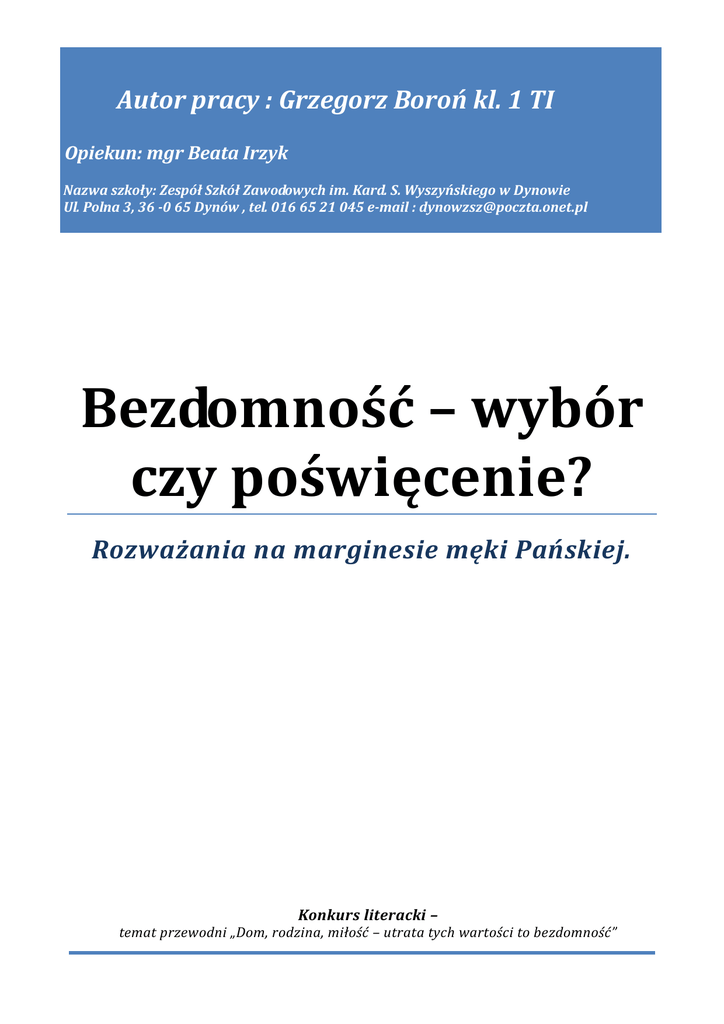 Autor pracy : Grzegorz Boroń kl. 1 TI Opiekun: mgr Beata Irzyk Nazwa szkoły: Zespół Szkół Zawodowych im. Kard. S. Wyszyńskiego w Dynowie Ul. Polna 3, 36 -0 65 Dynów , tel. 016 65 21 045 e-mail : [email protected] Bezdomność – wybór czy poświęcenie? Rozważania na marginesie męki Pańskiej. Konkurs literacki – temat przewodni „Dom, rodzina, miłość – utrata tych wartości to bezdomność” „Pewien człowiek umarł i trafił przed oblicze Stwórcy. Bóg długo przyglądał mu się w milczeniu i z niedowierzaniem. - Co ze mną będzie?- spytał z przerażeniem. - Przecież zasłużyłem na raj. Cierpiałem!-dodał z dumą. - Od kiedy to cierpienia są jakąś zasługą?- zdziwił się Stwórca. - Chodziłem w łachmanach, nosiłem włosiennicę! - uparcie twierdził człowiek. - Byłem głodny, jadłem tylko otręby i suchy groch, piłem stęchłą wodę, nie tknąłem żadnej kobiety... Pościłem i modliłem się przez całe życie... - I co z tego? - zapytał Stwórca.- Rozumiem, że cierpiałeś, ale w imię czego cierpiałeś? - Dla Twojej chwały - odparł człowiek. - No to niezłą mam chwałę... - zasmucił się Stwórca. - Uważasz, że głodzę ludzi, zmuszam ich do noszenia łachmanów i pozbawiam doczesnych radości, że odbieram im radość i szczęście? Człowiek długo milczał”. Ludzie w kościele zdziwili się słowami swojego wikarego. Jak to? Przecież cierpienie jest cnotą. Każdy łamał sobie głowę do czego młody ksiądz zmierzał. „- Co ze mną będzie? - zapytał cicho. - Powiadasz, że cierpiałeś? - odparł Stwórca. – Jak Ci to wytłumaczyć, żebyś zrozumiał... Był tu wczoraj pewien stolarz, który przez całe życie budował domy dla ludzi. Pracował w upał i w deszcz, czasem nie dojadał, czasem uderzał się młotkiem w palec i wówczas cierpiał, ale mimo to budował domy. Potem zaś odbierał swoje uczciwie zarobione pieniądze, bawił się, jadł i pił, opiekował się rodziną. A Ty? Wychodzi na to, że jedyne co robiłeś przez całe życie, to tłukłeś się w palec i przez to cierpiałeś. Stwórca zamilkł, a po chwili spytał: - A co z twoją rodziną, domem? Ksiądz kontynuował: Pojawia się nam teraz nieco inny obraz Boga niż ten, który przedstawia Biblia. Czy aby jest gorszy? Dlaczego nie możemy w pełni zaakceptować poświęcenia, jakim obdarzył nas Jezus w dzisiejszej Ewangelii. Czas, by popatrzeć na nią nie pod kątem męki, śmierci i uwolnienia od grzechu, ale wartości, które są nam bliskie. Miłość, rodzina i dom - utrata tych wartości przeplata się z okrutną męką, drogą krzyżową i śmiercią. Pora spojrzeć inaczej na Boga, nie jako wszechmogącego i wymagającego cierpienia, ale Boga miłosiernego i dobrego Ojca. Czy nasi ojcowie cieszą się widząc nas chorych? Czy dają nam nagrody za nieszczęście i przemoc? Nie, nasi ojcowie cieszą się z zapewnienia nam szczęścia, zdrowia, opieki i bezpieczeństwa. Bóg również woli widzieć człowieka szczęśliwego, człowieka budującego domy, czasami bawiącego się, zadowolonego. W „Liście do Koryntian” św. Pawła czytamy, że miłość jest cierpliwa, łaskawa, wybaczająca. Miłość i szczęście to nie droga na skróty. Właśnie w tym czasie bardziej powinniśmy się skupić na rozważaniu utraty miłości, rodziny i domu. Męka Pana Jezusa była niezwykłym poświęceniem. Jezus skazany na śmierć - w pierwszej stacji drogi krzyżowej, jaką dano nam było dziś przeżywać, następuje utrata wartości, jaką jest dom. W tym momencie „wali się” cały świat Jezusa. Dopełniają się słowa pisma, ale to nie skazanie na śmierć jest najgorszą rzeczą, jaka go spotyka podczas tej stacji. Jezus jako prawdziwy człowiek traci dotychczasowe mieszkanie. Nie ma już domu, do którego mógłby wrócić i zamieszkać. Nie ma już ogniska domowego, które może ogrzewać twarz zmęczonego Zbawiciela. W tej chwili Chrystus nie cierpi z powodu skazania, on wie, że najgorsze to jest utracić wartości, o które zabiegało się przez całe doczesne życie. Podczas kolejnych stacji drogi krzyżowej przeżywaliśmy ślady owej zbrodni, pozbawienia domu rodzinnego. Stacja dziesiąta - Jezus z szat obnażony. Król, który powinien nosić się w purpurę i aksamity zostaje obdarty i stoi w całym majestacie przed otaczającym go tłumem. Wcześniej nauczał, uzdrawiał, dziś słucha podniesionych głosów: UKRZYŻUJ. Własny lud wyparł się króla. Przed chwilą pocieszał niewiasty, teraz stoi - potężny, wzgardzony, Bóg w człowieczej postaci. Król, który utracił miłość swoich poddanych nie jest już prawdziwym królem. Oto dopełnia się godzina, gdy własny lud wyszydza i podżega do zbrodni. Gdzie się podziało owych dwunastu, co szli za nim? Któż go tak naprawdę miłował? Gdzie są te tłumy, które nauczał? W sercu Jezusa nastąpiła chwila zwątpienia. Utracił miłość ludzi, o których zabiegał. Nie pozostał już nikt, kto potrafiłby się poświęcić za niego. Utrata miłości boli bardziej niż rany. To nie wyzucie z szat sprawiło, że stał się nagi i bezbronny. Utracił miłość, dom, zmierza ku nieuchronnej śmierci. Drodzy Parafianie, Jezus widząc owe okropności, złośliwe traktowanie, gniewne okrzyki, nie przestaje iść dalej. On wie, gdzie zmierza i co potem nastąpi. Niewiarygodny ból rozrywa powoli Jego ciało. Zaczyna się dopełniać owa godzina. Za moment zostanie zapieczętowane nowe przymierze z Bogiem Ojcem. Nie tym Bogiem, który lubuje się w cierpieniach, ale tym miłosiernym i dobrym. Jezus wisi na krzyżu i jedynymi jego towarzyszami są Maryja - ukochana matka i Jan - ukochany uczeń. W tej podniosłej i patetycznej chwili, gdzie zaraz ma się wydarzyć coś, co na wieki przejdzie do historii, pada zdanie: „Oto matka Twoja” i „Oto syn Twój”. W tym czasie, gdy wielu ludzi ogląda ukrzyżowanie proroka, Chrystus ostatnim tchnieniem przekazuje swoją matk