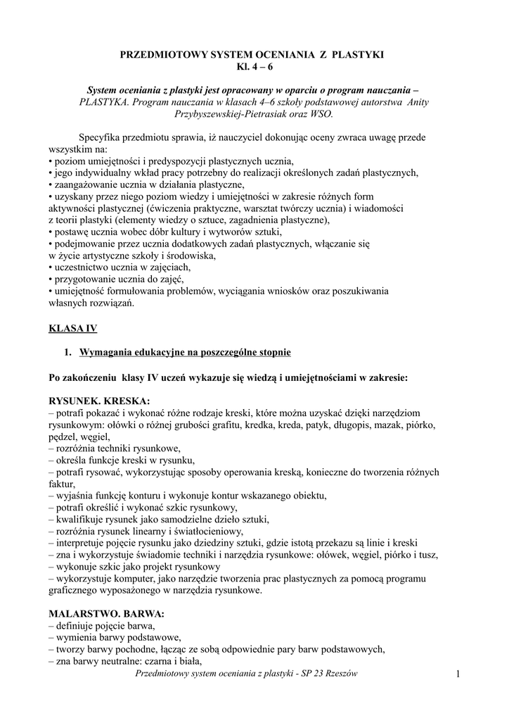 PRZEDMIOTOWY SYSTEM OCENIANIA Z PLASTYKI Kl. 4 – 6 System oceniania z plastyki jest opracowany w oparciu o program nauczania – PLASTYKA. Program nauczania w klasach 4–6 szkoły podstawowej autorstwa Anity Przybyszewskiej-Pietrasiak oraz WSO. Specyfika przedmiotu sprawia, iż nauczyciel dokonując oceny zwraca uwagę przede wszystkim na: • poziom umiejętności i predyspozycji plastycznych ucznia, • jego indywidualny wkład pracy potrzebny do realizacji określonych zadań plastycznych, • zaangażowanie ucznia w działania plastyczne, • uzyskany przez niego poziom wiedzy i umiejętności w zakresie różnych form aktywności plastycznej (ćwiczenia praktyczne, warsztat twórczy ucznia) i wiadomości z teorii plastyki (elementy wiedzy o sztuce, zagadnienia plastyczne), • postawę ucznia wobec dóbr kultury i wytworów sztuki, • podejmowanie przez ucznia dodatkowych zadań plastycznych, włączanie się w życie artystyczne szkoły i środowiska, • uczestnictwo ucznia w zajęciach, • przygotowanie ucznia do zajęć, • umiejętność formułowania problemów, wyciągania wniosków oraz poszukiwania własnych rozwiązań. KLASA IV 1. Wymagania edukacyjne na poszczególne stopnie Po zakończeniu klasy IV uczeń wykazuje się wiedzą i umiejętnościami w zakresie: RYSUNEK. KRESKA: – potrafi pokazać i wykonać różne rodzaje kreski, które można uzyskać dzięki narzędziom rysunkowym: ołówki o różnej grubości grafitu, kredka, kreda, patyk, długopis, mazak, piórko, pędzel, węgiel, – rozróżnia techniki rysunkowe, – określa funkcje kreski w rysunku, – potrafi rysować, wykorzystując sposoby operowania kreską, konieczne do tworzenia różnych faktur, – wyjaśnia funkcję konturu i wykonuje kontur wskazanego obiektu, – potrafi określić i wykonać szkic rysunkowy, – kwalifikuje rysunek jako samodzielne dzieło sztuki, – rozróżnia rysunek linearny i światłocieniowy, – interpretuje pojęcie rysunku jako dziedziny sztuki, gdzie istotą przekazu są linie i kreski – zna i wykorzystuje świadomie techniki i narzędzia rysunkowe: ołówek, węgiel, piórko i tusz, – wykonuje szkic jako projekt rysunkowy – wykorzystuje komputer, jako narzędzie tworzenia prac plastycznych za pomocą programu graficznego wyposażonego w narzędzia rysunkowe. MALARSTWO. BARWA: – definiuje pojęcie barwa, – wymienia barwy podstawowe, – tworzy barwy pochodne, łącząc ze sobą odpowiednie pary barw podstawowych, – zna barwy neutralne: czarna i biała, Przedmiotowy system oceniania z plastyki - SP 23 Rzeszów 1 – wskazuje barwy ciepłe, barwy zimne, – rozróżnia gamy barwne w dziełach plastycznych i potrafi je adekwatnie zastosować we własnej pracy, – zna pary barw kontrastowych, – wykonuje własne prace plastyczne, świadomie stosując wiedzę o barwach – wyjaśnia pojęcie malarstwa jako dziedziny sztuki, gdzie istotą przekazu jest głównie barwa, – rozpoznaje dzieła malarskie wykonane w technikach: akwarela, gwasz, malarstwo olejne, akryl – potrafi rozpoznać i stosować we własnym warsztacie pracy narzędzia malarza: sztalugę, paletę, pędzle, farby, papier, płótno, deskę, – wykonuje prace plastyczne w różnorodnych technikach malarskich. – wykorzystuje komputer jako narzędzie tworzenia prac plastycznych za pomocą programu graficznego wyposażonego w narzędzia malarskie i filtry. RZEŹBA. BRYŁA: – definiuje pojęcie bryły jako formy posiadającej trzy wymiary – wysokość, szerokość i głębię. – określa pojęcie rzeźby jako dzieła sztuki oglądanego w trzech wymiarach, – potrafi wyjaśnić funkcje rzeźby m.in. religijne, dekoracyjne, historyczne, – rozróżnia rodzaje rzeźb: posąg, pomnik, forma przestrzenna, – wymienia materiały i narzędzia rzeźbiarskie: glina, kamień, drewno, blacha, dłuto, – wykonuje kompozycje w przestrzeni: rzeźbę, formę przestrzenną. – definiuje pojęcie płaskorzeźby jako dzieła rzeźbiarskiego na płaszczyźnie, – rozpoznaje rodzaje płaskorzeźb: wypukłe i wgłębne, – zna funkcje płaskorzeźby: dekoracyjna, jako element związany z architekturą, – projektuje i wykonuje płaskorzeźbę. KONTRAST. GRAFIKA: – potrafi wymienić pary barw kontrastowych, – wyszukuje w otoczeniu i potrafi zdefiniować kontrast kształtów, – wykonuje prace plastyczne, świadomie stosując kontrasty barw lub form, – definiuje grafikę artystyczną jako dziedzinę sztuki i wie, na czym polega jej istota: wykonanie matrycy, drukowanie i powielanie, – rozróżnia techniki graficzne – wyjaśnia praktyczny charakter grafiki użytkowej i wymienia jej wytwory: wizytówki, zaproszenia, plakaty, znaczki pocztowe, opakowania, reklamy, ilustracje itp., – wykonuje pracę graficzną, – używa komputera jako narzędzia tworzenia druków użytkowych. KOMPOZYCJA. ARCHITEKTURA: – definiuje pojęcie kompozycji jako sposobu rozmieszczenia elementów na płaszczyźnie: linie, plamy barwne, w przestrzeni: bryły, obiekty, – rozpoznaje w dziełach sztuki i świadomie stosuje we własnych pracach plastycznych kompozycje rytmiczną i symetryczną. – określa architekturę jako dziedzinę sztuki uwzględniającą projektowanie, a następnie wznoszenie budowli, – potrafi rozpoznać typy architektury ze względu na funkcje: mieszkalna, sakralna, użyteczności publicznej, obronna, przemysłowa, – wymienia materiały budowlane: kamień, cegła, metal, beton, szkło, – zna zasady tworzenia dzieł architektury: estetyka, funkcjonalność, planowanie przestrzeni, – potrafi wskazać układy kompozycyjne stosowane w architekturze, – wie, jakie techniki stosuje architekt i próbuje z nich korzystać, tworząc własne projekty: rysunek, program komputerowy. Przedmiotowy system oceniania z plastyki - SP 23 Rzeszów 2 ZNAK PLASTYCZNY: – definiuje znak plastyczny jako informację, obraz pojęcia, – rozróżnia rodzaje znaków plastycznych: znaki informacyjne, ostr