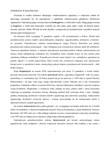 ZWIERZĘTA W KRAINIE EGO Zwierzęta to wielkie królestwo obejmujące wielokomórkowe organizmy w większości zdolne do aktywnego poruszania się. Są największym i najbardziej zróżnicowanym gatunkowo królestwem organizmów. Największą grupę zwierząt stanowią bezkręgowce, a wśród nich owady. Drugą grupą zwierząt są kręgowce, a wśród nich tradycyjnie wyróżnia się ryby, płazy, gady, ptaki i ssaki, do których należy również człowiek. Około 500 mln lat temu (kambr), występowali już przedstawiciele wszystkich znanych obecnie typów bezkręgowców. Na obszarze EGO występuje 51 gatunków ssaków z 89 stwierdzonych w Polsce. Wśród nich przedstawiciele sześciu rzędów: parzystokopytne, drapieżne, ząjącokształtne, nietoperze, owadożerne, gryzonie. Największym ssakiem zamieszkującym ostępy Puszczy Boreckiej jest jedyny przedstawiciel rodziny pustorogich – żubr. Populacja tych zwierząt liczy obecnie około 80 osobników. Typowym gatunkiem leśnym, a zarazem największym przedstawicielem rodziny jeleniowatych jest liczący około kilkadziesiąt osobników łoś. Kompleksy leśne zasiedla liczny na tym terenie jeleń szlachetny (kilkaset osobników). Pospolita jest również sarna (około 2 tys. osobników), spotykana na polach, łąkach i w strefie polno-leśnej. Duże zwarte lasy (zwłaszcza wilgotne) oraz zakrzaczone brzegi jezior w sąsiedztwie lasów zamieszkuje jedyny krajowy przedstawiciel świniowatych – dzik (kilka tysięcy). Rząd drapieżnych na terenie EGO reprezentowany jest przez 13 gatunków z trzech rodzin: psowate, łasicowate, kotowate. Do rodziny psowatych należy „największy drapieżnik" wilk, lis i jenot, pochodzący ze wschodniej Azji. W Polsce pojawił się po raz pierwszy w 1955 roku w rejonie Puszczy Białowieskiej i od tego czasu jego zasięg zdecydowanie wzrósł. Obecnie jest u nas zwierzęciem pospolitym. Populacja wilków na terenie EGO liczy obecnie kilkanaście osobników i powoli zwiększa swoją liczebność. Drapieżniki, a zwłaszcza wilki, polując na łosie, jelenie, dziki i sarny korzystnie wpływają na populacje zwierzyny łownej, eliminują spośród nich zwierzęta chore i stare. Zjadając padlinę zmniejszają możliwość wybuchu chorób i poprawiają stan zdrowotny populacji. Jednocześnie ograniczając liczebność zwierzyny płowej i czarnej, przyczyniają się do zmniejszania szkód w uprawach leśnych i polach uprawnych. Do rodziny kotowatych należy jeden gatunek - ryś, występujący już bardzo nielicznie, bo w liczbie około 10 osobników w dużych kompleksach leśnych: Puszczy Rominckiej, Lasach Skaliskich i Puszczy Boreckiej. Od 1993 roku ryś i wilk podlega ochronie na mocy rozporządzenia wojewody suwalskiego, a od 1995 roku ryś objęty jest na obszarze całego kraju ochroną gatunkową. Największym przedstawicielem rodziny łasicowatych jest borsuk zamieszkujący tereny pagórkowate, laski śródpolne i obrzeża większych obszarów leśnych. Dla rzadkiej u nas wydry i 1 norki amerykańskiej charakterystyczne są biotopy związane z wodą: doliny rzek, zarośnięte brzegi jezior i stawów. Na przestrzeni ostatnich kilkudziesięciu lat norka amerykańska (gatunek północnoamerykański sprowadzony do Europy jako zwierzę futerkowe) zajęła niszę ekologiczną rodzimej norki europejskiej. Znaczny wzrost liczebności tego gatunku jest jednym z głównych powodów zmniejszania się liczebności ptaków wodnych i wodno-błotnych. Gatunkiem silnie związanym ze środowiskiem leśnym jest kuna leśna, która zasiedla dziuple drzew, opuszczone gniazda dużych ptaków, stosy gałęzi i wykroty. Jej krewna, kuna domowa oraz tchórz zwyczajny są gatunkami synantropijnymi, tzn. żyją na terenach zamieszkałych przez człowieka. Zasiedlają strychy, zabudowania gospodarcze, parki, ogrody, ruiny i kamieniska. Zbliżone siedliska oraz doliny rzeczne, skraje lasów i stare parki zamieszkują – gronostaj i łasica łaska. Gatunki te w naszych warunkach klimatycznych, bieleją na czas zimy. Rząd zającokształtne jest reprezentowany przez dwa gatunki: zająca szaraka oraz nieco mniejszego od niego zająca bielaka - gatunek tundrowy związany z lasami, spotykany sporadycznie w Puszczy Rominckiej. W odróżnieniu od szaraka, bielak zasiedla zwarte tereny leśne i torfowiska. Rząd nietoperzy, w porównaniu z południową częścią kraju, jest na obszarze EGO stosunkowo ubogi, liczy tylko 12 gatunków. Większość nietoperzy zamieszkuje dziuple starych drzew, budki dla ptaków i strychy budynków. Przeważnie są gatunkami wędrownymi a na miejsca zimowania wybierają bunkry, piwnice czy studnie. Z puszczami i lasami EGO związane są: borowiec wielki, karlik malutki, karlik większy, mroczek pozłocisty. Pospolitymi gatunkami towarzyszącymi ludziom, występującymi na strychach domów są: mroczek późny, mroczek posrebrzany i gacek brunatny. Nad zbiornikami wodnymi i ciekami spotykany jest podczas polowania na owady: nocek łydkowłosy, nocek wąsatek, nocek rudy. Z rządu owadożernych na terenie EGO występuje 5 gatunków. Dość pospolity jest kret i jeż wschodni zasiedlający brzegi lasów liściastych i mieszanych o gęstym podszycie oraz ogrody i parki. Odżywia się owadami, ślimakami, dżdżownicami, płazami, gadami, młodymi ssakami i padliną. Pozostałe gatunki to przedstawiciele ryjówkowatych: ryjówka aksamitna i ryjówka malutka. Oba gatunki występują licznie na terenie całego obszaru, zasiedlając lasy, zarośla wśród łąk, stare parki i cmentarze. Zarośnięte brzegi wód, podmokłe łąki oraz olsy zamieszkuje rzęsorek rzeczek. Pokarm jego stanowią owady i drobne bezkręgowce, które uśmierca za pomocą jadu. Ze względu na duże znaczenie w zwalczaniu szkodników owadzich wszystkie ssaki owadożerne podobnie jak i nietoperze, podlegają ochronie prawnej. Gryzonie są najliczniej reprezentowanym rzędem ssaków. Na terenie EGO stwierdzono występowanie 16 gatunków. Z