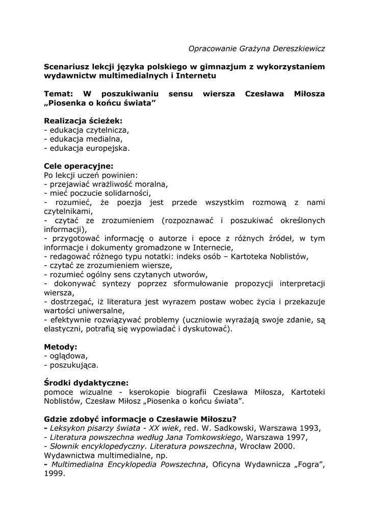 Opracowanie Grażyna Dereszkiewicz Scenariusz lekcji języka polskiego w gimnazjum z wykorzystaniem wydawnictw multimedialnych i Internetu Temat: W poszukiwaniu „Piosenka o końcu świata” sensu wiersza Czesława Miłosza Realizacja ścieżek: - edukacja czytelnicza, - edukacja medialna, - edukacja europejska. Cele operacyjne: Po lekcji uczeń powinien: - przejawiać wrażliwość moralna, - mieć poczucie solidarności, - rozumieć, że poezja jest przede wszystkim rozmową z nami czytelnikami, - czytać ze zrozumieniem (rozpoznawać i poszukiwać określonych informacji), - przygotować informację o autorze i epoce z różnych źródeł, w tym informacje i dokumenty gromadzone w Internecie, - redagować różnego typu notatki: indeks osób – Kartoteka Noblistów, - czytać ze zrozumieniem wiersze, - rozumieć ogólny sens czytanych utworów, - dokonywać syntezy poprzez sformułowanie propozycji interpretacji wiersza, - dostrzegać, iż literatura jest wyrazem postaw wobec życia i przekazuje wartości uniwersalne, - efektywnie rozwiązywać problemy (uczniowie wyrażają swoje zdanie, są elastyczni, potrafią się wypowiadać i dyskutować). Metody: - oglądowa, - poszukująca. Środki dydaktyczne: pomoce wizualne - kserokopie biografii Czesława Miłosza, Kartoteki Noblistów, Czesław Miłosz „Piosenka o końcu świata”. Gdzie zdobyć informacje o Czesławie Miłoszu? - Leksykon pisarzy świata - XX wiek, red. W. Sadkowski, Warszawa 1993, - Literatura powszechna według Jana Tomkowskiego, Warszawa 1997, - Słownik encyklopedyczny. Literatura powszechna, Wrocław 2000. Wydawnictwa multimedialne, np. - Multimedialna Encyklopedia Powszechna, Oficyna Wydawnicza „Fogra”, 1999. Internet, np. Wiem - Wielka Internetowa Encyklopedia Multimedialna, http://www.encyklopedia.pl Zadania dla ucznia Na podstawie materiałów zgromadzonych o Czesławie Miłoszu uzupełnij Kartotekę Noblistów. KARTOTEKA NOBLISTÓW ...................................... imię, nazwisko (ur. ...............) narodowość .......................... literatura ............................. Laureat Literackiej Nagrody Nobla w roku ...................... Tytuły: ..................... ..................... ..................... ..................... Postaw* PISARZ POETA DRAMATOPISARZ ESEISTA Notatki: .................................................................................................... Przebieg zajęć 1. Uczniowie otrzymują kserokopie wiersza Czesława Miłosza „Piosenka o końcu świata”. 2. Wysłuchanie recytacji wiersza Czesława Miłosza „Piosenka o końcu świata” Zapisanie tematu lekcji: W poszukiwaniu sensu wiersza Czesława Miłosza „Piosenka o końcu świata” 3. Praca w grupach: Przeczytajcie uważnie jeszcze raz „Piosenkę o końcu świata”. Przygotujcie krótką wypowiedź na temat wiersza. Pomocne będą pytania: - Kto mówi w wierszu? - Do kogo kierowane są słowa wiersza? - Wymień obrazy ukazane w wierszu. - Jaka jest wymowa tytułu? - Na czym polega sprzeczność w tytule wiersza? - Jaki jest sens moralny utworu? - Jakie są twoje wizje końca świata? Poszukajcie w wierszu słów najbardziej znaczących. Zacytujcie je. Jak rozumiecie ostatnie strofy wiersza? Wybierzcie osobę, która zaprezentuje wyniki waszej pracy. wykonania zadania przewidziany jest na 20 minut. 4. Prezentacje efektów pracy poszczególnych zespołów 5. Zapisanie wniosków-odpowiedzi na kolejne pytania Czas