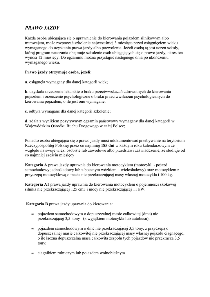 PRAWO JAZDY Każda osoba ubiegająca się o uprawnienie do kierowania pojazdem silnikowym albo tramwajem, może rozpocząć szkolenie najwcześniej 3 miesiące przed osiągnięciem wieku wymaganego do uzyskania prawa jazdy albo pozwolenia. Jeżeli osobą tą jest uczeń szkoły, której program nauczania obejmuje szkolenie osób ubiegających się o prawo jazdy, okres ten wynosi 12 miesięcy. Do egzaminu można przystąpić następnego dnia po ukończeniu wymaganego wieku. Prawo jazdy otrzymuje osoba, jeżeli: a. osiągnęła wymagany dla danej kategorii wiek; b. uzyskała orzeczenie lekarskie o braku przeciwwskazań zdrowotnych do kierowania pojazdem i orzeczenie psychologiczne o braku przeciwwskazań psychologicznych do kierowania pojazdem, o ile jest ono wymagane; c. odbyła wymagane dla danej kategorii szkolenie; d. zdała z wynikiem pozytywnym egzamin państwowy wymagany dla danej kategorii w Wojewódzkim Ośrodku Ruchu Drogowego w całej Polsce; Ponadto osoba ubiegająca się o prawo jazdy musi udokumentować przebywanie na terytorium Rzeczypospolitej Polskiej przez co najmniej 185 dni w każdym roku kalendarzowym ze względu na swoje więzi osobiste lub zawodowe albo przedstawi zaświadczenie, że studiuje od co najmniej sześciu miesięcy Kategoria A prawa jazdy uprawnia do kierowania motocyklem (motocykl - pojazd samochodowy jednośladowy lub z bocznym wózkiem – wielośladowy) oraz motocyklem z przyczepą motocyklową o masie nie przekraczającej masy własnej motocykla i 100 kg. Kategoria A1 prawa jazdy uprawnia do kierowania motocyklem o pojemności skokowej silnika nie przekraczającej 125 cm3 i mocy nie przekraczającej 11 kW. Kategoria B prawa jazdy uprawnia do kierowania: • pojazdem samochodowym o dopuszczalnej masie całkowitej (dmc) nie przekraczającej 3,5 tony (z wyjątkiem motocykla lub autobusu); • pojazdem samochodowym o dmc nie przekraczającej 3,5 tony, z przyczepą o dopuszczalnej masie całkowitej nie przekraczającej masy własnej pojazdu ciągnącego, o ile łączna dopuszczalna masa całkowita zespołu tych pojazdów nie przekracza 3,5 tony; • ciągnikiem rolniczym lub pojazdem wolnobieżnym Kategoria B+E. uprawnia do kierowania zespołem pojazdów składającym się z pojazdu określonego w kategorii B (dmc do 3,5 tony) oraz przyczepy, której rzeczywista masa całkowita nie przekracza rzeczywistej masy całkowitej pojazdu ciągnącego. Ponadto kategoria B+E uprawnia do kierowania ciągnikiem rolniczym z przyczepą (przyczepami) oraz pojazdem wolnobieżnym z przyczepą (przyczepami). Jednak zespół pojazdów nie może składać się z więcej niż trzech pojazdów. Kategoria B1 prawa jazdy uprawnia do kierowania trójkołowym lub czterokołowym pojazdem samochodowym o masie własnej nie przekraczającej 550 kg, z wyjątkiem motocykla. Kategoria C prawa jazdy uprawnia do kierowania pojazdem samochodowym o dopuszczalnej masie całkowitej przekraczającej 3,5 t, z wyjątkiem autobusu, a także ciągnikiem rolniczym lub pojazdem wolnobieżnym. Kategoria C+E prawa jazdy uprawnia do kierowania pojazdem samochodowym o dopuszczalnej masie całkowitej przekraczającej 3,5 t łącznie z przyczepą. Kategoria C1, uprawnia do kierowania pojazdem samochodowym o dopuszczalnej masie całkowitej przekraczającej 3,5 t i nie przekraczającej 7,5 t, z wyjątkiem autobusu, a także ciągnikiem rolniczym lub pojazdem wolnobieżnym. Kategoria D prawa jazdy uprawnia do kierowania autobusem, ciągnikiem rolniczym lub pojazdem wolnobieżnym. Kategoria D+E, prawa jazdy uprawnia do kierowania zespołem pojazdów składającym się z autobusu i przyczepy. Kategoria D1 uprawnia do kierowania autobusem przeznaczonym konstrukcyjnie do przewozu nie więcej niż 17 osób łącznie z kierowcą, a także ciągnikiem rolniczym lub pojazdem wolnobieżnym. Kategoria D1+E uprawnia do kierowania zespołem pojazdów o dopuszczalnej masie całkowitej nie przekraczającej 12 t, składającym się z pojazdu ciągnącego określonego w kategorii D1 i przyczepy o dopuszczalnej masie całkowitej nie przekraczającej masy własnej pojazdu ciągnącego. Prawo jazdy kategorii T uprawnia do kierowania ciągnikiem rolniczym z przyczepą (przyczepami) lub pojazdem wolnobieżnym z przyczepą (przyczepami). Osoba ubiegająca się o uprawnienia kategorii T musi mieć ukończone 16 lat. W przypadku przystępowania do egzaminu osoby, która nie ukończyła 18 roku życia, konieczna jest pisemna zgoda rodziców. Prawo jazdy, z wyjątkiem prawa jazdy kategorii T, uprawnia do kierowania określonym w nim pojazdem w ruchu międzynarodowym, chyba że władze danego państwa wymagają, aby kierowca posiadał międzynarodowe prawo jazdy. Na terytorium RP odpowiednim pojazdem może kierować osoba posiadająca ważne prawo jazdy wydane przez: państwo członkowskie Unii Europejskiej, Konfederację Szwajcarską lub państwo członkowskie EFTA (Europejskiego Porozumienia o Wolnym Handlu - stronę umowy o Europejskim Obszarze Gospodarczym) a) państwo będące stroną Konwencji o ruchu drogowym (Wiedeń, 8 listopad 1968 b) państwo nie wymienione w pkt 1 - którego wzór prawa jazdy jest zgodny z wzorem określonym w Konwencji (a)) - okresie 6 miesięcy od daty rozpoczęcia stałego lub czasowego pobytu, nie dłużej jednak niż przez okres ważności prawa jazdy MIĘDZYNARODOWE PRAWO JAZDY Jest wydawane za opłatą przez starostę, na podstawie ważnego krajowego prawa jazdy na okres 3 lat. Okres jego ważności nie może jednak przekraczać terminu ważności krajowego prawa jazdy. Opłata za wyrobienie międzynarodowego prawa jazdy wynosi 35,50 zł. ŚWIADECTWO KWALIFIKACJI ZAWODOWEJ Kierowca obowiązany jest uzyskać kwalifikację wstępną, odpowiednio do pojazdu, którym zamierza wykonywać przewóz drogowy, w zakresie bloków programowych określonych odpowiednio do kategorii prawa jazdy: C1, C1+E, C i C+E D1, D1+E, D i D+E 1. Kwalifikacja wstępna obejmuje zajęcia teoretyczne i praktyczne oraz testy kwalif