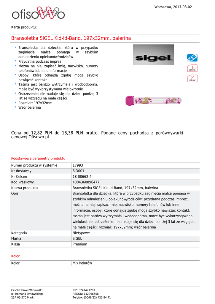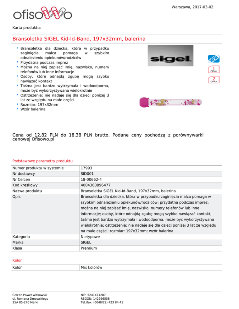 Warszawa, 2017-03-02 Karta produktu: Bransoletka SIGEL Kid-Id-Band, 197x32mm, balerina Bransoletka dla dziecka, która w przypadku zaginięcia malca pomaga w szybkim odnalezieniu opiekunów/rodziców Przydatna podczas imprez Można na niej zapisać imię, nazwisko, numery telefonów lub inne informacje Osoby, które odnajdą zgubę mogą szybko nawiązać kontakt Taśma jest bardzo wytrzymała i wodoodporna, może być wykorzystywana wielokrotnie Ostrzeżenie: nie nadaje się dla dzieci poniżej 3 lat ze względu na małe części Rozmiar: 197x32mm Wzór balerina Cena od 12,82 PLN do 18,38 PLN brutto. Podane ceny pochodzą z porównywarki cenowej Ofisowo.pl Podstawowe parametry produktu Numer produktu w systemie 17993 Nr dostawcy SID001 Nr Celcen 18-00662-4 Kod kreskowy 4004360896477 Nazwa produktu Bransoletka SIGEL Kid-Id-Band, 197x32mm, balerina Opis Bransoletka dla dziecka, która w przypadku zaginięcia malca pomaga w szybkim odnalezieniu opiekunów/rodziców; przydatna podczas imprez; można na niej zapisać imię, nazwisko, numery telefonów lub inne informacje; osoby, które odnajdą zgubę mogą szybko nawiązać kontakt; taśma jest bardzo wytrzymała i wodoodporna, może być wykorzystywana wielokrotnie; ostrzeżenie: nie nadaje się dla dzieci poniżej 3 lat ze względu na małe części; rozmiar: 197x32mm; wzór balerina Kategoria Nietypowe Marka SIGEL Klasa Premium Kolor Kolor Mix kolorów Celcen Paweł Witkowski ul. Romana Dmowskiego 25A 05-270 Marki NIP: 5241471287 REGON: 142996558 Tel./fax: (0048/22) 423 84 41 Warszawa, 2017-03-02 Karta katalogowa produktu cd. Bransoletka SIGEL Kid-Id-Band, 197x32mm, balerina Cecha Produkt Bransoletka Rodzaj B.d. Typ Wielokrotnego użytku W ofercie od 2013-10 Wymiary Rozmiar B.d. Szerokość (mm) 32 Wymiary (mm) 32x197 Wysokość (mm) B.d. Certyfikaty Hit Standard Ilość lat gwarancji 1 Nowy produkt w ofercie Standard Wspólny słownik zamówień CPV 22455100-5 Serdecznie zapraszamy do współpracy zespół. Ofisowo.pl Celcen Paweł Witkowski ul. Romana Dmowskiego 25A 05-270 Marki NIP: 5241471287 REGON: 142996558 Tel./fax: (0048/22) 423 84 41