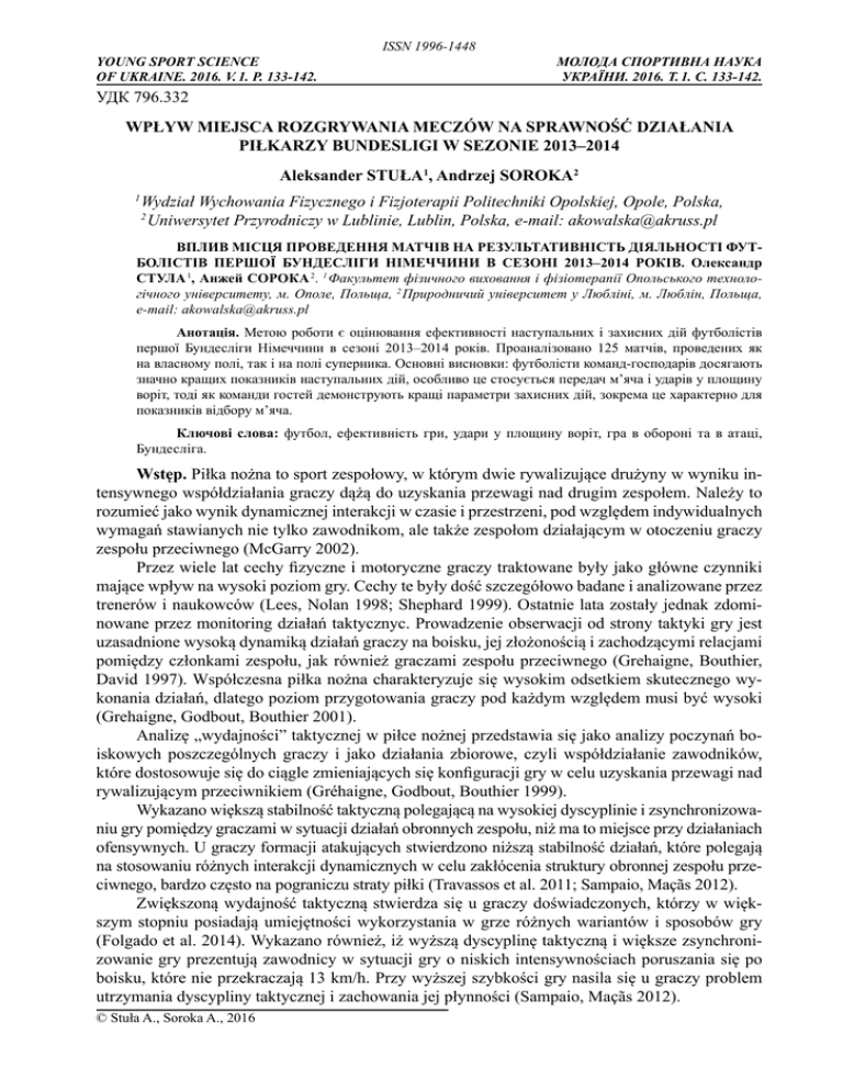 YOUNG SPORT SCIENCE OF UKRAINE. 2016. V. 1. Р. 133-142. ISSN 1996-1448 МОЛОДА СПОРТИВНА НАУКА УКРАЇНИ. 2016. Т. 1. С. 133-142. УДК 796.332 WPŁYW MIEJSCA ROZGRYWANIA MECZÓW NA SPRAWNOŚĆ DZIAŁANIA PIŁKARZY BUNDESLIGI W SEZONIE 2013–2014 Aleksander STUŁA 1, Andrzej SOROKA 2 Wydział Wychowania Fizycznego i Fizjoterapii Politechniki Opolskiej, Opole, Polska, Uniwersytet Przyrodniczy w Lublinie, Lublin, Polska, e‑mail: [email protected] 1 2 ВПЛИВ МІСЦЯ ПРОВЕДЕННЯ МАТЧІВ НА РЕЗУЛЬТАТИВНІСТЬ ДІЯЛЬНОСТІ ФУТБОЛІСТІВ ПЕРШОЇ БУНДЕСЛІГИ НІМЕЧЧИНИ В СЕЗОНІ 2013–2014 РОКІВ. Олександр СТУЛА 1, Анжей СОРОКА 2. 1 Факультет фізичного виховання і фізіотерапії Опольського техноло‑ гічного університету, м. Ополе, Польща, 2 Природничий університет у Любліні, м. Люблін, Польща, e‑mail: [email protected] Анотація. Метою роботи є оцінювання ефективності наступальних і захисних дій футболістів першої Бундесліги Німеччини в сезоні 2013–2014 років. Проаналізовано 125 матчів, проведених як на власному полі, так і на полі суперника. Основні висновки: футболісти команд-господарів досягають значно кращих показників наступальних дій, особливо це стосується передач м’яча і ударів у площину воріт, тоді як команди гостей демонструють кращі параметри захисних дій, зокрема це характерно для показників відбору м’яча. Ключові слова: футбол, ефективність гри, удари у площину воріт, гра в обороні та в атаці, Бундесліга. Wstęp. Piłka nożna to sport zespołowy, w którym dwie rywalizujące drużyny w wyniku intensywnego współdziałania graczy dążą do uzyskania przewagi nad drugim zespołem. Należy to rozumieć jako wynik dynamicznej interakcji w czasie i przestrzeni, pod względem indywidualnych wymagań stawianych nie tylko zawodnikom, ale także zespołom działającym w otoczeniu graczy zespołu przeciwnego (McGarry 2002). Przez wiele lat cechy fizyczne i motoryczne graczy traktowane były jako główne czynniki mające wpływ na wysoki poziom gry. Cechy te były dość szczegółowo badane i analizowane przez trenerów i naukowców (Lees, Nolan 1998; Shephard 1999). Ostatnie lata zostały jednak zdominowane przez monitoring działań taktycznyc. Prowadzenie obserwacji od strony taktyki gry jest uzasadnione wysoką dynamiką działań graczy na boisku, jej złożonością i zachodzącymi relacjami pomiędzy członkami zespołu, jak również graczami zespołu przeciwnego (Grehaigne, Bouthier, David 1997). Współczesna piłka nożna charakteryzuje się wysokim odsetkiem skutecznego wykonania działań, dlatego poziom przygotowania graczy pod każdym względem musi być wysoki (Grehaigne, Godbout, Bouthier 2001). Analizę „wydajności” taktycznej w piłce nożnej przedstawia się jako analizy poczynań boiskowych poszczególnych graczy i jako działania zbiorowe, czyli współdziałanie zawodników, które dostosowuje się do ciągle zmieniających się konfiguracji gry w celu uzyskania przewagi nad rywalizującym przeciwnikiem (Gréhaigne, Godbout, Bouthier 1999). Wykazano większą stabilność taktyczną polegającą na wysokiej dyscyplinie i zsynchronizowaniu gry pomiędzy graczami w sytuacji działań obronnych zespołu, niż ma to miejsce przy działaniach ofensywnych. U graczy formacji atakujących stwierdzono niższą stabilność działań, które polegają na stosowaniu różnych interakcji dynamicznych w celu zakłócenia struktury obronnej zespołu przeciwnego, bardzo często na pograniczu straty piłki (Travassos et al. 2011; Sampaio, Maçãs 2012). Zwiększoną wydajność taktyczną stwierdza się u graczy doświadczonych, którzy w większym stopniu posiadają umiejętności wykorzystania w grze różnych wariantów i sposobów gry (Folgado et al. 2014). Wykazano również, iż wyższą dyscyplinę taktyczną i większe zsynchronizowanie gry prezentują zawodnicy w sytuacji gry o niskich intensywnościach poruszania się po boisku, które nie przekraczają 13 km/h. Przy wyższej szybkości gry nasila się u graczy problem utrzymania dyscypliny taktycznej i zachowania jej płynności (Sampaio, Maçãs 2012). © Stuła A., Soroka A., 2016 134 Aleksander STUŁA, Andrzej SOROKA Pomimo trudności z oszacowaniem działań taktycznych, większych niż to ma miejsce przy analizach wydatku energetycznego czy elementów technicznych, umiejętności związane z taktycznym tworzeniem gry odgrywają bardzo ważną rolę jako wskaźniki efektywności. Przykładowo, przechwyty piłki drużyny przeciwnej i przejście do ataku szybkiego, analizowane od strony taktyki gry zespołu, są podstawowym zachowaniem graczy na boisku, zarówno od strony gry defensywnej, jak również ofensywnej (McGarry 2009). Należy więc monitorować te zachowania i to nie tylko w sytuacji posiadania piłki przez zespół, które to czynności są najczęściej podejmowane przez analityków z uwagi na łatwość rejestracji. Mówi się zwłaszcza o czynnościach wyuczonych w procesie treningu. Takie metodologiczne podejście pozwala na ocenę osiągniętych efektów gry. To dlatego stosowane modelowanie gry od jej strony taktycznej jest wykorzystywane w celu określania wzorców skuteczności gry zespołów najwyższej klasy sportowej (McGarry 