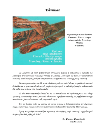 Wernisaż Wystawa prac studentów Kierunku Plastycznego Uniwersytetu Trzeciego Wieku w Sanoku Od czterech lat mam przyjemność prowadzić zajęcia z malarstwa i rysunku na Sanockim Uniwersytecie Trzeciego Wieku w Sanoku. Spotykam się tam ze wspaniałymi osobami, uzdolnionymi, pełnymi optymizmu i zaangażowania w swoją pracę twórczą. Zawsze poruszające są dla mnie słuchanie podczas zajęć słowa o spełnieniu marzeń dzieciństwa, o powrocie do dawnych pasji artystycznych, o radości płynącej z odkrywania dla siebie i na własną rękę świata sztuki. To dla mnie wspaniały dowód na to, że niezależnie od wybranej przez nas drogi życiowej, zawsze tkwi w nas potrzeba obcowania z pięknem i sztuką, że pogłębianie swojej wrażliwości jest zadaniem na całe, wspaniałe życie. Jest mi bardzo miło, że dzieląc się swoją wiedzą i doświadczeniem artystycznym mogę obserwować owoce twórczych zainteresowań studentów Kierunku Plastycznego. Życzę wszystkim uczestnikom wystawy nieustającej pasji twórczej, wyjątkowych inspiracji i wielu pięknych dzieł. Jan Szczepan Szczepkowski artysta malarz olej, płótno Mieszkam w Sanoku i jestem emerytką. Zawsze zachwycałam się pięknem natury, ale nigdy nie próbowałam tego piękna przenieść na płótno. Malować zaczęłam dopiero cztery lata temu. Lubię malować pejzaże. (Lucyna Ćwikła) olej, płótno Mieszkam w Sanoku. Z wykształcenia jestem ogrodnikiem i jam 60 lat. Od dzieciństwa interesowałam się malarstwem, rysunkiem, plastyką. Swoich sił odważyłam się spróbować w tej dziedzinie w 2010 roku, kiedy to zapisałam się na zajęcia ze sztuki przy UTW w Sanoku. Maluję pejzaże, martwą naturę, postacie farbami olejnymi na płycie i płótnie. Malowanie jest moim spełnieniem. (Halina Demniańczyk-Szpyrka) olej, płótno Mam 56 lat i jestem na emeryturze. Uczestniczę od roku w zajęciach z zakresu sztuki w UTW. Pierwsze kroki w malarstwie stawiałam 30 lat temu. Teraz, po tak długiej przerwie wracam do tego, co zawsze chciałam robić, czyli do malowania. (Halina Kapcia) olej, płótno Mieszkam w Sanoku. Z wykształcenia jestem ekonomistką, obecnie na emeryturze. Zawsze interesowało mnie malarstwo olejne. W 2008 roku sama zaczęłam malować na płótnie farbami olejnymi i akrylowymi pejzaże, martwą naturę, kwiaty. (Maria Kędzierska-Dżugan) olej, płótno Byłam księgową w Dziele Płac okręgowej Spółdzielni Mleczarskiej w Sanoku. Obecnie na I roku UTW uczę się sztuki malowania. Najchętniej maluję pejzaże i kwiaty. (Halina Kuśnierz) olej, płótno Mieszkam w Sanoku. Mój zawód wyuczony; inż. Chemik na Politechnice Rzeszowskiej. Jestem na emeryturze. Zawsze lubiłam rysować. W 2008 roku zapisałam się na UTW na kierunek plastyczny, żeby spróbować swoich sil i sprawdzić się, czy potrafię malować. Maluję na płótnie farbami olejnymi, a tematy to przede wszystkim martwa natura i kwiaty. Sprawia mi to wiele frajdy. (Anna Łakus) olej, płótno Mam 59 lat, jestem emerytką i od roku studentką UTW na kierunku Sztuka. W malarstwie stawiam pierwsze kroki i sprawia mi to dużą przyjemność. Chyba realizuję się w tej niezbędnej dotąd przeze mnie dziedzinie. Maluję farbami olejnymi pejzaże, kwiaty, portrety. (Anna Oryszczak) olej, płótno Urodziłam się i mieszkam w Sanoku. Maluję farbami olejnymi i suchymi pastelami; pejzaże, martwą naturę i kwiaty. Swoje zamiłowanie zaczęłam rozwijać w 2007 r. w sanockim BWA. Od 2009 r. doskonalę swoje umiejętności w Uniwersytecie Trzeciego Wieku w Sanoku. Malarstwo jest mają pasją, wyciszeniem, spełnieniem. (Małgorzata Patronik) olej, płótno Jestem absolwentem Wydziału Mechanicznego Politechniki Krakowskiej i emerytowanym pracownikiem „Autosanu” Sanok. W wolnych chwilach realizuję swoją pasję twórczą pędzlem na blejtramie. Szczególnie interesuję się malarstwem klasycznym (olej, pastel, akwarela). (Mieczysław Przystasz) olej, płótno Mam 58 lat i od roku uczęszczam na zajęcia UTW w zakresie sztuki. Malowani ento moje nowe hobby, rozrywka na emeryturze. Maluję farbami olejnymi na płótnie. Tematyka moich prac to pejzaże, kwiaty, portrety i martwa natura. (Teresa Szot) olej, płótno Jestem emerytką, maluję od trzech lat. Stosuję farby olejne i akrylowe. Przenoszą na płótno sfotografowane własnoręcznie pejzaże bieszczadzki oraz kompozycje kwiatowe. Maluję również ikony na kamykach zbieranych przeze mnie w Sanie. Swoje prace wystawiam w Galerii Sztuki w Synagodze w Lesku. (Łucja Wasińska) olej, płótno Zawsze lubiłam rysować, choć dopiero na emeryturze znalazłam czas na rozwijanie swoich zainteresowań. Sprawia mi to ogromną przyjemność. Wcześniej pochłaniała mnie praca polonisty. (Janina Wydrzyńska) olej, płótno Od czterech lat jestem emerytką a od dwóch uczęszczam na zajęcia w UTW. Próbuję swoich sił w malarstwie. Nigdy wcześniej tego nie robiłam. Maluję głównie pejzaże i kwiaty. Oszukuję własnego stylu, interpretacji i techniki. Malowanie daje mi wyciszenie wewnętrzne, oderwanie od rzeczywistości i zajęcie na emeryturze. (Anna Zgadzaj)
