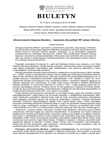 BIURO BADAŃ I ANALIZ BIULETYN Nr 13 (621) 26 stycznia 2010 © PISM Redakcja: Sławomir Dębski (redaktor naczelny), Łukasz Adamski, Mateusz Gniazdowski, Beata Górka-Winter, Leszek Jesień, Agnieszka Kondek (sekretarz redakcji), Łukasz Kulesa, Marek Madej, Ernest Wyciszkiewicz Uhonorowanie Stepana Bandery – wyzwania dla polityki RP wobec Ukrainy Łukasz Adamski Decyzja prezydenta Wiktora Juszczenki o pośmiertnym przyznaniu najwyższego ukraińskiego odznaczenia państwowego Stepanowi Banderze wywołuje na Ukrainie duże kontrowersje. Polska powinna rozważyć złożenie protestu, wskazując na jej potencjalnie negatywne konsekwencje dla stosunków dwustronnych. Należy także podejmować działania służące lepszemu zrozumieniu polskiej perspektywy historycznej przez ukraińskie elity oraz dążyć do tego, aby różnice w interpretacjach wspólnej przeszłości w jak najmniejszym stopniu wpływały na bieżące stosunki dwustronne. Prezydent Juszczenko 22 stycznia br. nadał tytuł Bohatera Ukrainy oraz związany z nim Order Państwa Stepanowi Banderze. Swoją decyzję uzasadnił „niezłomnością ducha” przywódcy radykalnego odłamu ukraińskich nacjonalistów, jego „bohaterstwem” oraz „ogromną ofiarnością” w walce o niepodległość i ukraińską ideę narodową. Decyzja prezydenta wzbudza wiele kontrowersji, zwłaszcza że nie jest pierwszą o takim charakterze – w 2007 r. nadał on tytuł Bohatera Ukrainy innemu działaczowi Organizacji Ukraińskich Nacjonalistów (OUN), Romanowi Szuchewyczowi, który jako dowódca UPA był współodpowiedzialny m.in. za czystkę etniczną w południowo-wschodnich województwach II RP. Bandera w latach 30. XX w. organizował zamachy terrorystyczne oraz morderstwa polskich i ukraińskich działaczy dążących do poprawy stosunków obu narodowości. W czasie wojny tworzył walczące w składzie Wehrmachtu oddziały ukraińskie. Po wkroczeniu Niemców do Lwowa w 1941 r. z jego inicjatywy doszło do proklamacji niepodległości Ukrainy. Ponieważ akt ten nie był uzgodniony z władzami III Rzeszy, Bandera trafił do obozu koncentracyjnego w Sachsenhausen. Dlatego też nie odpowiada bezpośrednio za czystki etniczne dokonane przez UPA, choć nigdy ich nie potępił. Postać Bandery jest pozytywnie postrzegana na zachodzie Ukrainy, gdzie jest symbolem działań niepodległościowych i gdzie kojarzy się go przede wszystkim z działalnością antysowiecką. Natomiast mieszkańcy pozostałych regionów kraju mają do niego stosunek przeważnie ambiwalentny bądź negatywny. Banderze zarzuca się szowinizm, kolaborację z nazistami i represje skierowane przeciwko Ukraińcom niepodzielających ideałów OUN. Często jednak osoby z silnie rozwiniętym poczuciem ukraińskiej tożsamości narodowej także w innych niż zachodnia Ukraina regionach kraju mają do niego umiarkowanie pozytywny stosunek. Ukraińscy historycy są podzieleni jeśli chodzi o ocenę Bandery oraz UPA, a w podręcznikach szkolnych zazwyczaj unika się ocen wartościujących. Ubolewanie z powodu dekretu Juszczenki wyraziła Partia Regionów, kierowana przez Wiktora Janukowycza, faworyta drugiej tury wyborów prezydenckich. W przyszłości nie można wykluczyć podjęcia przez nią prób anulowania decyzji Juszczenki, zwłaszcza że została ona podjęta z naruszeniem prawa – tytuł Bohatera Ukrainy można nadawać tylko obywatelom tego kraju, Bandera zaś był obywatelem Polski. Plany uhonorowania przywódcy nacjonalistów potępił także Serhij Tihipko, który w pierwszej turze wyborów zajął trzecie miejsce. Ostrzegł on zarazem, iż decyzja Juszczenki może negatywnie wpłynąć na stosunki z Polską i Rosją. Premier Julia Tymoszenko unika komentarzy. Sprawa jest dla niej niewygodna, gdyż rywalizuje z Janukowyczem o urząd prezydenta i dąży do uzyskania poparcia wyborców z różnych części kraju. Przyczyny uhonorowania Bandery i polityczne konsekwencje. Do uhonorowania Bandery Juszczenkę mogły skłonić korzyści wynikające z kalkulacji politycznych. Mimo porażki w pierwszej turze wyborów prezydenckich (5,4% głosów), nie zamierza on wycofać się z polityki i planuje stwo- 2127 Polski Instytut Spraw Międzynarodowych rzenie własnego bloku w wyborach do parlamentu. Jego elektorat skupia się w dawnej Galicji Wschodniej, gdzie prezydent ma poparcie ponad 25% mieszkańców. Decyzja prezydenta odpowiada zapewne jego osobistym przekonaniom i wpisuje się w podejmowane przez niego starania o pogłębienie, desowietyzację i derusyfikację pamięci historycznej ukraińskiego społeczeństwa. Juszczenko pragnął m.in. pojednać żołnierzy UPA i Armii Czerwonej oraz włączyć zachodnioukraińską tradycję walk o niepodległość w ogólnonarodową pamięć historyczną. Przede wszystkim jednak dążył do zwiększenia wiedzy o Wielkim Głodzie z lat 30. XX w. wierząc, że pamięć o nim zintegruje społeczeństwo ukraińskie, a także starał się o międzynarodowe uznanie tej tragedii jako ludobójstwa narodu ukraińskiego. Podkreślał również wysiłki Kozaków i działaczy ukraińskiego ruchu narodowego w celu zlikwidowania podległości ziem ukraińskich Rosji. Historycznych sporów z Polską starał się unikać. Juszczenko, podejmując decyzję o odznaczeniu Bandery, nie miał zapewne intencji wywołania napięć z Polską, ale zbagatelizował jej konsekwencje dla dalszego rozwoju wzajemnych stosunków. Sprawa obciąży relacje polsko-ukraińskie. Przede wszystkim pogorszy wizerunek Ukrainy wśród polskiej opinii publicznej – tym bardziej, że jest to kolejny incydent na tle historycznym, mocno komentowany przez media. Tylko w zeszłym roku dyrektor Służby Bezpieczeństwa Ukrainy porównał policję II RP do Gestapo i NKWD, grupa ukraińskich rowerzystów zorganizowała „rajd im. Bandery”, pragnąc odwiedzić m.in. terytorium RP, a ukraińscy historycy i intelektualiści oraz Rady Obwodowe Tarnopolska i Lwowska ostro krytykowali