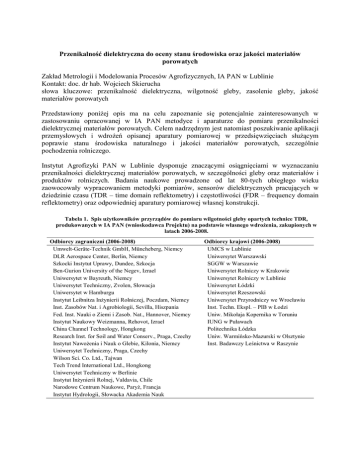 Przenikalność dielektryczna do oceny stanu środowiska oraz jakości materiałów porowatych Zakład Metrologii i Modelowania Procesów Agrofizycznych, IA PAN w Lublinie Kontakt: doc. dr hab. Wojciech Skierucha słowa kluczowe: przenikalność dielektryczna, wilgotność gleby, zasolenie gleby, jakość materiałów porowatych Przedstawiony poniżej opis ma na celu zapoznanie się potencjalnie zainteresowanych w zastosowaniu opracowanej w IA PAN metodyce i aparaturze do pomiaru przenikalności dielektrycznej materiałów porowatych. Celem nadrzędnym jest natomiast poszukiwanie aplikacji przemysłowych i wdrożeń opisanej aparatury pomiarowej w przedsięwzięciach służącym poprawie stanu środowiska naturalnego i jakości materiałów porowatych, szczególnie pochodzenia rolniczego. Instytut Agrofizyki PAN w Lublinie dysponuje znaczącymi osiągnięciami w wyznaczaniu przenikalności dielektrycznej materiałów porowatych, w szczególności gleby oraz materiałów i produktów rolniczych. Badania naukowe prowadzone od lat 80-tych ubiegłego wieku zaowocowały wypracowaniem metodyki pomiarów, sensorów dielektrycznych pracujących w dziedzinie czasu (TDR – time domain reflektometry) i częstotliwości (FDR – frequency domain reflektometry) oraz odpowiedniej aparatury pomiarowej własnej konstrukcji. Tabela 1. Spis użytkowników przyrządów do pomiaru wilgotności gleby opartych technice TDR, produkowanych w IA PAN (wnioskodawca Projektu) na podstawie własnego wdrożenia, zakupionych w latach 2006-2008. Odbiorcy zagraniczni (2006-2008) Umwelt-Geräte-Technik GmbH, Müncheberg, Niemcy DLR Aerospace Center, Berlin, Niemcy Szkocki Instytut Uprawy, Dundee, Szkocja Ben-Gurion University of the Negev, Izrael Uniwersytet w Bayreuth, Niemcy Uniwersytet Techniczny, Zvolen, Słowacja Uniwersytet w Hamburgu Instytut Leibnitza Inżynierii Rolniczej, Poczdam, Niemcy Inst. Zasobów Nat. i Agrobiologii, Sevilla, Hiszpania Fed. Inst. Nauki o Ziemi i Zasob. Nat., Hannover, Niemcy Instytut Naukowy Weizmanna, Rehovot, Izrael China Channel Technology, Hongkong Research Inst. for Soil and Water Conserv., Praga, Czechy Instytut Nawożenia i Nauk o Glebie, Kilonia, Niemcy Uniwersytet Techniczny, Praga, Czechy Wilson Sci. Co. Ltd., Tajwan Tech Trend International Ltd., Hongkong Uniwersytet Techniczny w Berlinie Instytut Inżynierii Rolnej, Valdavia, Chile Narodowe Centrum Naukowe, Paryż, Francja Instytut Hydrologii, Słowacka Akademia Nauk Odbiorcy krajowi (2006-2008) UMCS w Lublinie Uniwersytet Warszawski SGGW w Warszawie Uniwersytet Rolniczy w Krakowie Uniwersytet Rolniczy w Lublinie Uniwersytet Łódzki Uniwersytet Rzeszowski Uniwersytet Przyrodniczy we Wrocławiu Inst. Techn. Ekspl. – PIB w Łodzi Uniw. Mikołaja Kopernika w Toruniu IUNG w Puławach Politechnika Łódzka Uniw. Warmińsko-Mazurski w Olsztynie Inst. Badawczy Leśnictwa w Raszynie Rysunek 1. Ośmiokanałowy laboratoryjny i polowy miernik wilgotności (technika TDR), zasolenia i temperatury gleby opracowany i produkowany IA PAN Mierniki wilgotności materiałów porowatych, szczególnie gleby, wyprodukowane w IA PAN i opatentowane w kraju i za granicą (Rys. 1 i Rys. 2) znajdują szerokie zastosowanie w laboratoriach naukowych na całym świecie (Tabela 1). Oferowane sensory dielektryczne i przyrządy pomiarowe instalowane są również w polowych stacjach monitoringu wilgotności, temperatury i zasolenia gleby. Więcej informacji można znaleźć pod adresem http://easytest.ipan.lublin.pl Rysunek 2. Ręczny miernik wilgotności (technika TDR), zasolenia i temperatury gleby opracowany i produkowany IA PAN Przy pomocy opracowanych sensorów i mierników można szybko i dokładnie mierzyć dwa istotne parametry materiałów porowatych: ilości wody i soli w nich zawartych. Dodatkowo, pomiar tych wielkości można zautomatyzować, co umożliwia realizację zdalnego monitoringu wilgotności i zasolenia badanych obiektów. Dotychczas powszechnie stosowane suszarkowe metody pomiaru wilgotności materiałów porowatych są przestarzałe przez swoją czasochłonność oraz pracochłonność i nie spełniają wymagań narzuconych przez powszechną potrzebę automatyzacji. Mierzone parametry są ważne dla ochrony środowiska, rolnictwa i bezpieczeństwa w skali globalnej, ponieważ woda oprócz podstawowej roli utrzymania życia niesie również zagrożenie. Monitoring wilgotności gleby, śniegu, wałów przeciwpowodziowych może uchronić wielu z nas przed nieszczęściem jakie niosą za sobą lawiny błotne czy śnieżne oraz powodzie. Wiedza o bilansie wody w glebie umożliwi lepsze gospodarowanie tym deficytowym bogactwem naturalnym, umożliwi dokładniejsze prognozowanie pogody, wspomoże podejmowanie strategicznych decyzji inwestycyjnych. Wilgotność i zasolenie są ważnymi elementami oceny materiałów ziarnistych i proszkowych. Ziarno składowane w silosach nie może być zbyt wilgotne, ponieważ jako materiał biologiczny w warunkach dostępności wody zmienia się i to często jest przyczyną ogromnych strat materialnych. Dotyczy to również innych materiałów porowatych i produktów spożywczych pochodzenia biologicznego. W transporcie materiałów porowatych takich jak węgiel, cement, sproszkowane minerały używane w procesach technologicznych nie jesteśmy zainteresowani przemieszczaniem wody w nich zawartej, tylko substancji mającej wartość handlową. Zawartość wody i soli organicznych w materiałach i produktach pochodzenia rolniczego są podstawowymi elementami wpływającymi na ich jakość, która dalej przekłada się na ich wartość komercyjną. Większość defektów struktury materiałów biologicznych spowodowanych niewłaściwym przechowywaniem, transportem czy sposobem wytworzenia wpływa na zmianę proporcji objętościowych i stężenia roztworów wodnych w nich zawartych. Dzięki możliwości uzyskania widma częstotliwościowego przenikalności dielektrycznej materiałów porowatych możliwa jest 