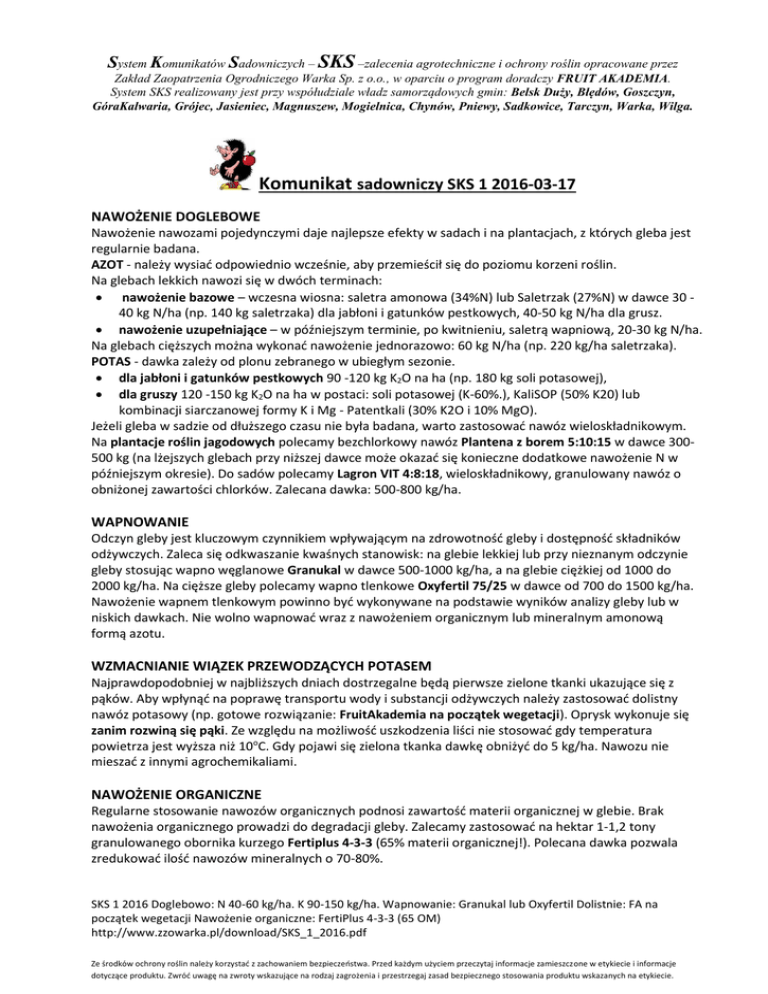 System Komunikatów Sadowniczych – SKS –zalecenia agrotechniczne i ochrony roślin opracowane przez Zakład Zaopatrzenia Ogrodniczego Warka Sp. z o.o., w oparciu o program doradczy FRUIT AKADEMIA. System SKS realizowany jest przy współudziale władz samorządowych gmin: Belsk Duży, Błędów, Goszczyn, GóraKalwaria, Grójec, Jasieniec, Magnuszew, Mogielnica, Chynów, Pniewy, Sadkowice, Tarczyn, Warka, Wilga. Komunikat sadowniczy SKS 1 2016-03-17 NAWOŻENIE DOGLEBOWE Nawożenie nawozami pojedynczymi daje najlepsze efekty w sadach i na plantacjach, z których gleba jest regularnie badana. AZOT - należy wysiać odpowiednio wcześnie, aby przemieścił się do poziomu korzeni roślin. Na glebach lekkich nawozi się w dwóch terminach: nawożenie bazowe – wczesna wiosna: saletra amonowa (34%N) lub Saletrzak (27%N) w dawce 30 40 kg N/ha (np. 140 kg saletrzaka) dla jabłoni i gatunków pestkowych, 40-50 kg N/ha dla grusz. nawożenie uzupełniające – w późniejszym terminie, po kwitnieniu, saletrą wapniową, 20-30 kg N/ha. Na glebach cięższych można wykonać nawożenie jednorazowo: 60 kg N/ha (np. 220 kg/ha saletrzaka). POTAS - dawka zależy od plonu zebranego w ubiegłym sezonie. dla jabłoni i gatunków pestkowych 90 -120 kg K2O na ha (np. 180 kg soli potasowej), dla gruszy 120 -150 kg K2O na ha w postaci: soli potasowej (K-60%.), KaliSOP (50% K20) lub kombinacji siarczanowej formy K i Mg - Patentkali (30% K2O i 10% MgO). Jeżeli gleba w sadzie od dłuższego czasu nie była badana, warto zastosować nawóz wieloskładnikowym. Na plantacje roślin jagodowych polecamy bezchlorkowy nawóz Plantena z borem 5:10:15 w dawce 300500 kg (na lżejszych glebach przy niższej dawce może okazać się konieczne dodatkowe nawożenie N w późniejszym okresie). Do sadów polecamy Lagron VIT 4:8:18, wieloskładnikowy, granulowany nawóz o obniżonej zawartości chlorków. Zalecana dawka: 500-800 kg/ha. WAPNOWANIE Odczyn gleby jest kluczowym czynnikiem wpływającym na zdrowotność gleby i dostępność składników odżywczych. Zaleca się odkwaszanie kwaśnych stanowisk: na glebie lekkiej lub przy nieznanym odczynie gleby stosując wapno węglanowe Granukal w dawce 500-1000 kg/ha, a na glebie ciężkiej od 1000 do 2000 kg/ha. Na cięższe gleby polecamy wapno tlenkowe Oxyfertil 75/25 w dawce od 700 do 1500 kg/ha. Nawożenie wapnem tlenkowym powinno być wykonywane na podstawie wyników analizy gleby lub w niskich dawkach. Nie wolno wapnować wraz z nawożeniem organicznym lub mineralnym amonową formą azotu. WZMACNIANIE WIĄZEK PRZEWODZĄCYCH POTASEM Najprawdopodobniej w najbliższych dniach dostrzegalne będą pierwsze zielone tkanki ukazujące się z pąków. Aby wpłynąć na poprawę transportu wody i substancji odżywczych należy zastosować dolistny nawóz potasowy (np. gotowe rozwiązanie: FruitAkademia na początek wegetacji). Oprysk wykonuje się zanim rozwiną się pąki. Ze względu na możliwość uszkodzenia liści nie stosować gdy temperatura powietrza jest wyższa niż 10oC. Gdy pojawi się zielona tkanka dawkę obniżyć do 5 kg/ha. Nawozu nie mieszać z innymi agrochemikaliami. NAWOŻENIE ORGANICZNE Regularne stosowanie nawozów organicznych podnosi zawartość materii organicznej w glebie. Brak nawożenia organicznego prowadzi do degradacji gleby. Zalecamy zastosować na hektar 1-1,2 tony granulowanego obornika kurzego Fertiplus 4-3-3 (65% materii organicznej!). Polecana dawka pozwala zredukować ilość nawozów mineralnych o 70-80%. SKS 1 2016 Doglebowo: N 40-60 kg/ha. K 90-150 kg/ha. Wapnowanie: Granukal lub Oxyfertil Dolistnie: FA na początek wegetacji Nawożenie organiczne: FertiPlus 4-3-3 (65 OM) http://www.zzowarka.pl/download/SKS_1_2016.pdf Ze środków ochrony roślin należy korzystać z zachowaniem bezpieczeństwa. Przed każdym użyciem przeczytaj informacje zamieszczone w etykiecie i informacje dotyczące produktu. Zwróć uwagę na zwroty wskazujące na rodzaj zagrożenia i przestrzegaj zasad bezpiecznego stosowania produktu wskazanych na etykiecie.