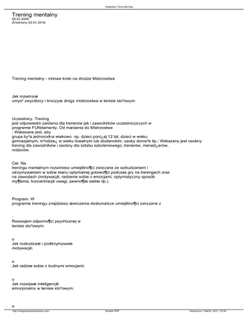 Integralny Tenis Sto³owy Trening mentalny 09.02.2006. Zmieniony 02.01.2016. Trening mentalny - milowe kroki na drodze Mistrzostwa Jak rozwin±æ umys³ zwyciêzcy i kroczyæ drog± mistrzostwa w tenisie sto³owym Uczestnicy. Trening jest odpowiedni zarówno dla trenerów jak i zawodników uczestnicz±cych w programie FUNdamenty. Od marzenia do Mistrzostwa ; Wskazane jest, aby grupa by³a jednorodna wiekowo np. dzieci poni¿ej 12 lat, dzieci w wieku gimnazjalnym, m³odzie¿ w wieku licealnym lub studenckim, osoby doros³e itp.; Wskazany jest osobny trening dla zawodników i osobny dla sztabu szkoleniowego, trenerów, mened¿erów, rodziców. Cel. Na treningu mentalnym rozwiniesz umiejêtno¶ci zwi±zane ze wzbudzaniem i utrzymywaniem w sobie stanu optymalnej gotowo¶ci podczas gry na treningach oraz na zawodach (motywacjê, radzenie sobie z emocjami, optymistyczny sposób my¶lenia, koncentracjê uwagi, pewno¶æ siebie itp.). Program. W programie treningu znajdziesz æwiczenia doskonal±ce umiejêtno¶ci zwi±zane z · Rozwojem odporno¶ci psychicznej w tenisie sto³owym: o Jak rozbudzaæ i podtrzymywaæ motywacjê; o Jak radziæ sobie z trudnymi emocjami; o Jak rozwijaæ inteligencjê emocjonaln± w tenisie sto³owym; o http://integralnytenisstolowy.com Kreator PDF Utworzono 1 March, 2017, 23:35 Integralny Tenis Sto³owy Jak kszta³towaæ pozytywn± (optymistyczn±) postawê; o Jak nauczyæ siê my¶lenia obrazami (wizualizacji); o Jak wzbudzaæ pozytywne emocje; o Jak wzbudzaæ wy¿sze stany psychiczne na treningu i zawodach; o Jak rozwijaæ umiejêtno¶æ koncentracji uwagi podczas gry; o Jak kszta³towaæ pewno¶æ siebie; · Rozwojem umiejêtno¶ci zwi±zanych z udzia³em w zawodach: o Jak przygotowaæ siê do zawodów; o Jak postêpowaæ podczas zawodów; o Co robiæ po zawodach, aby Ci da³y najwiêksze korzy¶ci; o Jak przygotowaæ siê do ka¿dego wyzwania w swoim ¿yciu. System treningu mentalnego Jerzego Grycana. Prezentowany tu system oparty jest na: Ponad 30-letnich poszukiwaniach jak szkol± siê mistrzowie ¶wiata w tenisie sto³owym. Wieloletnich studiach najlepszych praktyk w sporcie, edukacji, psychologii, psychoterapii, http://integralnytenisstolowy.com Kreator PDF Utworzono 1 March, 2017, 23:35 Integralny Tenis Sto³owy duchowo¶ci, organizacji i zarz±dzaniu, biznesie itp.. Wykorzystaniu wiedzy na temat najlepszych strategii szkoleniowych w czo³owych krajach w tenisie sto³owym i w sporcie (modelowaniu mistrzostwa). Integracji ró¿nych metod treningu umys³u terapii Gestalt, NLP, metody Silvy, Holosinc Solution, zen itp.. Ponad 30 letniej pracy szkoleniowej, która przynios³a setki medali na zawodach krajowych i miêdzynarodowych. Ponad 20 letnich do¶wiadczeniach pracy z Kadrami Narodowymi Polski i Australii w tenisie sto³owym. Wieloletnich badaniach procesu szkolenia z wykorzystaniem precyzyjnych metod monitorowania treningu, zawodów w tenisie stosowym umo¿liwiaj±cych okre¶lanie co dzia³a a co nie dzia³a. Formy treningu. Najbardziej polecany pe³ny 40-godzinny trening mo¿e przybraæ ró¿norodne formy: Trening grupowy: (1) 5-dniowe zgrupowanie, (2) 5 ca³odziennych (8-godzinnych) spotkañ, (3) cykl 4-godzinnych spotkañ lub (4) cykl cotygodniowych 1,5 godzinnych spotkañ; Zajêcia mog± odbywaæ siê u Ciebie w klubie lub okrêgu. Trening indywidualny w formie coachingu indywidualnego; np. (1) cykl 3 godzinnych spotkañ co 2 tygodnie, (2) cykl 6-godzinnych spotkañ raz w miesi±cu lub (3) 1,5-godzinnych cotygodniowych spotkañ. Indywidualne zajêcia mog± odbywaæ siê (ca³kowicie lub czê¶ciowo) w formie telekonferencji skype lub msn; Referencje. Poczytaj sobie o jednym z takich treningów: W Gdañsku W Miêdzyzdrojach Co powiedzieli o tym treningu mentalnym inni? Tomasz Krzeszewski (5-8 w Atenach 2004, 2-krotny olimpijczyk, wielokrotny medalista Mistrzostw Europy i Polski): Dziêki pracy z trenerem Jerzym Grycanem Zrozumia³em, ¿e nale¿y pracowaæ w równym stopniu nad sfer± fizyczn± jak i psychiczn±. W tym okresie nauczy³em siê byæ uwa¿nym i skoncentrowanym podczas ka¿dego treningu i http://integralnytenisstolowy.com Kreator PDF Utworzono 1 March, 2017, 23:35 Integralny Tenis Sto³owy zawodów. Nauczy³em siê kontrolowaæ w³asne emocje i przez to lepiej radzi³em sobie ze stresem podczas ka¿dego meczu. Stan psychiczny który przywo³ywa³em przed ka¿d± z gier pozwoli³ mi na osi±ganie sukcesów w sporcie. Anna Bednarska-Wnêk (trener): Kilka lat temu mia³am okazjê uczestniczyæ w kursie prowadzonym przez Jurka, a dotycz±cym treningu mentalnego. By³a to dla mnie najwarto¶ciowsza lekcja zwi±zana z szeroko pojêt± psychologi± sportu. To w czasie kursu nauczy³am siê, jak kontrolowaæ emocje, jak wchodziæ w stan optymalnej gotowo¶ci do gry, na czym siê koncentrowaæ. Potem t± wiedzê skutecznie wykorzystywa³am jako zawodniczka i trenerka (podopieczna zdoby³a mistrzostwo Polski juniorek).... Dyrektor Szkolenia w TTA (po 5-dniowym treningu mentalnym): Najbardziej znacz±ce wydarzenie w australijskim tenisie stosowym od 20 lat. Russell Lavale (3-krotny olimpijczyk, wielokrotny Mistrz Oceanii i Australii, menad¿er): Jurek Grycan nauczy³ mnie wiary w siebie i gry bez lêku podczas rywalizacji na arenie miêdzynarodowej. Trevor Brown (olimpijczyk, Mistrz Oceanii, psycholog): "Jeden specjalny moment, który pozostanie ze mn± na zawsze. Uczestniczy³em w turnieju z narodowym zespo³em w Wietnamie. (W turnieju bra³y udzia³ reprezentacje ponad 8 krajów Azji po³udniowo-wschodniej, miêdzy innymi dru¿yna prowincjonalna reprezentuj±ca Chiny). Jurek by³ trenerem i zagra³em decyduj±cy mecz fina³owy dla Australii przeciw reprezentacji Wietnamu. By³o oko³o 40 ° C, nie by³o ¿adnej klimatyzacji, oko³o 5000 szalej±cych widzów kibicuj±cych swojemu zespo³owi. Przy stanie 2:2 w meczu, 1-1 w setach i 20-20, zagra³em dwie najlepsze pi³ki i wygra³em decyduj±cy mecz. Koledzy z zespo³u i Jurek, wszyscy byli w uniesieniu. 