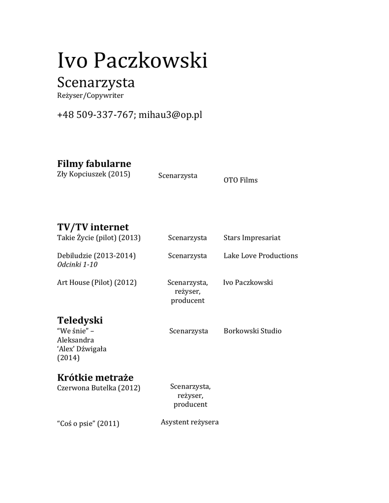 Ivo Paczkowski Scenarzysta Reżyser/Copywriter +48 509-337-767; [email protected] Filmy fabularne Zły Kopciuszek (2015) Scenarzysta OTO Films TV/TV internet Takie Życie (pilot) (2013) Scenarzysta Stars Impresariat Debiludzie (2013-2014) Odcinki 1-10 Scenarzysta Lake Love Productions Art House (Pilot) (2012) Scenarzysta, reżyser, producent Ivo Paczkowski Scenarzysta Borkowski Studio Teledyski “We śnie” – Aleksandra ‘Alex’ Dźwigała (2014) Krótkie metraże Czerwona Butelka (2012) “Coś o psie” (2011) Scenarzysta, reżyser, producent Asystent reżysera Nagrody/Nominacje Czerwona Butelka Finalista w 31. Koszaliński Festiwal kategorii Debiutów Filmowych „Młodzi i krótkometrażowej Film” Finalista w Festiwal Filmów kategorii Frapujących „frapująca fabuła” Finalista 11. Rybnickie Prezentacje Filmu Niezależnego „RePeNeFe 2012” Finalista w kategorii „Film niezależny” 59. OKFA Film Festiwal Finalista Festiwal Niezależnych Filmów Fabularnych i Horrorów 2013 w Bielawie Edukacja 2010 Studium Scenariuszowe Państwowa Wyższa Szkoła Filmowa, Telewizyjna I Teatralna w Łodzi + miesięczne warsztaty „Masterclass - Szkoła filmowania” w Warszawskiej Szkole Filmowej +48 509-337-767 [email protected] http://www.imdb.com/name/nm6616398/ Wyrażam zgodę na przetwarzanie moich danych osobowych zawartych w mojej ofercie pracy dla potrzeb niezbędnych do realizacji procesu rekrutacji (zgodnie z ustawą z dn. 29.08.97 roku o Ochronie Danych Osobowych Dz. Ust Nr 133 poz. 883)