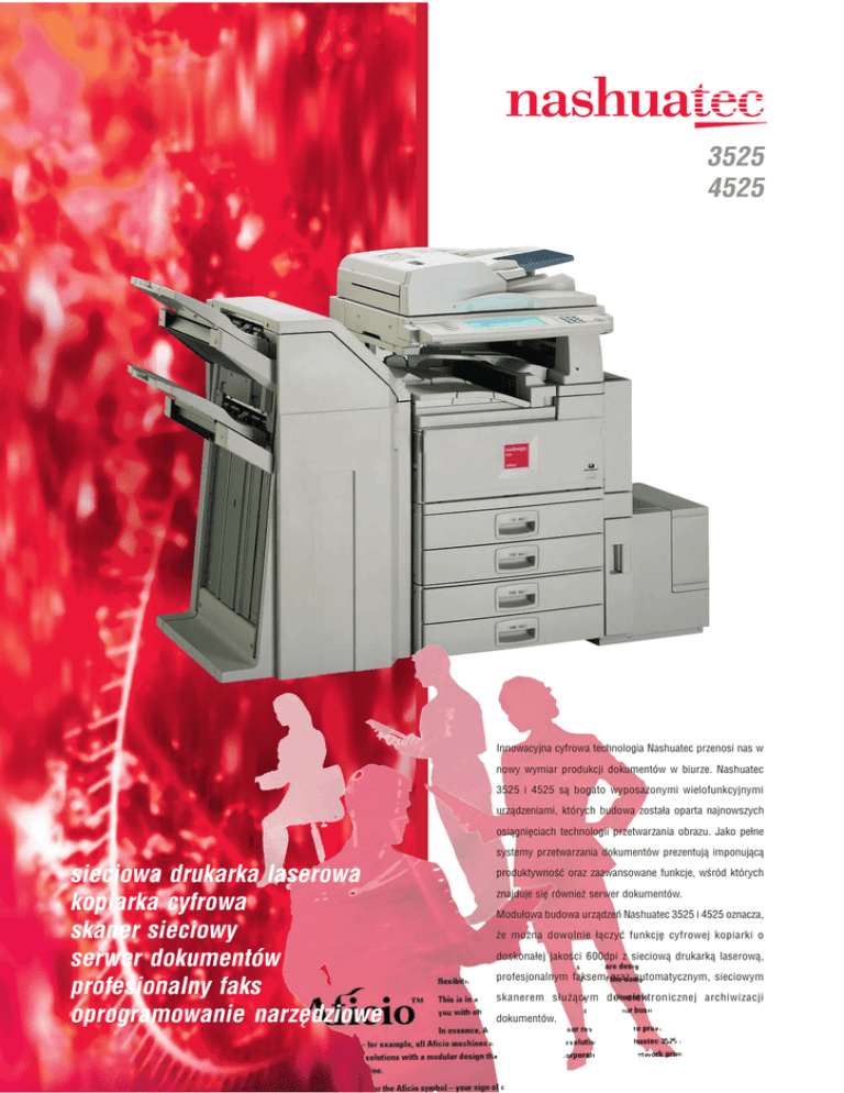 3525 4525 Innowacyjna cyfrowa technologia Nashuatec przenosi nas w nowy wymiar produkcji dokumentów w biurze. Nashuatec 3525 i 4525 s¹ bogato wyposa¿onymi wielofunkcyjnymi urz¹dzeniami, których budowa zosta³a oparta najnowszych osi¹gniêciach technologii przetwarzania obrazu. Jako pe³ne systemy przetwarzania dokumentów prezentuj¹ imponuj¹c¹ sieciowa drukarka laserowa kopiarka cyfrowa skaner sieciowy serwer dokumentów profesjonalny faks oprogramowanie narzêdziowe produktywnoæ oraz zaawansowane funkcje, wród których znajduje siê równie¿ serwer dokumentów. Modu³owa budowa urz¹dzeñ Nashuatec 3525 i 4525 oznacza, ¿e mo¿na dowolnie ³¹czyæ funkcjê cyfrowej kopiarki o doskona³ej jakoci 600dpi z sieciow¹ drukark¹ laserow¹, profesjonalnym faksem oraz automatycznym, sieciowym skanerem s³u¿¹cym do elektronicznej archiwizacji dokumentów. Cyfrowy system zarz¹ KOPIARKA WYJ¥TKOWA JAKOÆ CYFROWYCH KOPII Obydwa urz¹dzenia kopiuj¹ dokumenty zachowuj¹c doskona³¹ jakoæ 600dpi. Pracuj¹ na formatach papieru do A3 oraz tworz¹ kopie dwustronne z jedno- i dwustronnych orygina³ów. Specjalne tryby kopiowania zapewniaj¹ t¹ sama wysok¹ jakoæ przy odwzorowywaniu tekstu, fotografii oraz pó³tonów. Cyfrowa technologia dodatkowo pozwala na zastosowanie efektownych narzêdzi takich jak np. specjalna ok³adka lub znak wodny. SZYBKIE, CI¥G£E KOPIOWANIE Pojedyncze kopie jak i te¿ du¿e nak³ady s¹ kopiowane szybko i efektywnie dziêki krótkiemu czasowi pierwszej kopii i du¿ej szybkoci pracy. Urz¹dzenia 3525 i 4525 kopiuj¹ dokumenty formatu A4 z szybkoci¹ odpowiednio 35 i 45 stron na minutê. Bardzo du¿a pojemnoæ papieru i automatyczne prze³¹czanie pomiêdzy kasetami umo¿liwia uzupe³nianie papieru bez przerywania pracy urz¹dzenia. FAKS Wewnêtrzny, opcjonalny modu³ faksu stanowi znakomite rozwi¹zanie komunikacyjne znacznie przewy¿szaj¹ce standardowe urz¹dzenia faksowe. Do jego wyj¹tkowych zalet nale¿y bardzo szybkie skanowanie i szybkoæ transmisji znacznie redukuj¹ce koszt po³¹czeñ. Ponadto faks korzysta ze wszystkich zalet urz¹dzenia wielofunkcyjnego, a dodatkowo mo¿e czerpaæ korzyci technologii ISDN i faksu PC. WYJ¥TKOWE PAPIERU OPCJE WYKOÑCZANIA Dziêki funkcji elektronicznego sortowania ka¿dy komplet drukowanych czy kopiowanych dokumentów jest automatycznie zbierany i dostarczany w ca³oci. Szeroka gama opcji wykoñczania papieru rozszerza produktywnoæ i u¿ytecznoæ urz¹dzeñ. Dostêpny jest finiszer na 1000 arkuszy, finiszer z dodatkowymi tacami odbiorczymi, zszywaczem oraz dziurkaczem. SERWER DOKUMENTÓW Wyj¹tkow¹ zalet¹ urz¹dzenia Nashuatec jest wewnêtrzny Serwer Dokumentów - nie spotykany w tradycyjnych urz¹dzeniach wielofunkcyjnych. Serwer pozwala na wygodne przechowywanie w pamiêci urz¹dzenia do 3000 stron najczêciej u¿ywanych dokumentów, takich jak np. cenniki, formularze itp. Serwer jest obs³ugiwany w sposób intuicyjny bezporednio z pulpitu sterowania urz¹dzenia dziêki przejrzystemu panelowi LCD. Rozwi¹ Dope³niaj¹c mo¿liwoci urz¹dzeñ 3525 i 4525, Nashuatec oferuje pe³n¹ gamê programowych systemów zarz¹dzania dokumentami stworzonych w celu pe³nego zintegrowania urz¹dzeñ Nashuatec z istniej¹cym systemem komunikacyjnym. Programy te optymalizuj¹ zarz¹dzanie dokumentami i informacj¹ w ¹dzania dokumentami DRUKARKA DRUKOWANIE W SIECI Ta u¿yteczna opcja przekszta³ca urz¹dzenia w wysokonak³adow¹ drukarkê laserow¹, a z dodatkow¹ kart¹ sieciow¹ Ethernet w drukarkê sieciow¹. Urz¹dzenia 3525 i 4525 osi¹gaj¹ rewelacyjn¹ szybkoæ druku odpowiednio 35 i 45 stron na minutê. Drukuj¹ z rzeczywist¹ rozdzielczoci¹ 600dpi na ró¿norodnych nonikach w formatach do A3. Dodatkowe funkcje jak sortowanie, wykoñczanie papieru czy funkcje serwera dokumentów mog¹ byæ uruchamiane bezporednio z naszego stanowiska pracy. SMARTNETMONITOR SmartNetMonitor jest sieciowym programem narzêdziowym s³u¿¹cym do monitorowania i zarz¹dzania urz¹dzeniami 3525 i 4525 oraz innymi, sieciowymi urz¹dzeniami Nashuatec. SmartNetMonitor umo¿liwia uzyskanie informacji o obci¹¿eniu poszczególnych urz¹dzeñ, dziêki czemu mo¿liwa jest optymalizacja i równomierne roz³o¿enie drukowanych nak³adów. Program s³u¿y zarówno administratorowi sieci jak i poszczególnym u¿ytkownikom dostarczaj¹c niezbêdne informacje i pomagaj¹c w zarz¹dzaniu posiadanymi urz¹dzeniami. SKANER Produktywny, monochromatyczny skaner sieciowy jest kolejn¹ opcj¹ spe³niaj¹c¹ zaawansowane potrzeby. Skanuje dokumenty korzystaj¹c z automatycznego podajnika dokumentów z szybkoci¹ 52 stron na minutê zachowuj¹c znakomit¹ rozdzielczoæ 600dpi i 256 odcieni szaroci. Do³¹czone oprogramowanie narzêdziowe ScanRouter mo¿liwa u¿ytkownikowi skanowanie dokumentów na urz¹dzeniu oraz ich dystrybucjê w sieci komputerowej. Skaner wraz oprogramowaniem stanowi zintegrowany system podnosz¹cy jakoæ komunikacji i zarz¹dzania dokumentami w biurze. ZARZ¥DZANIE DOKUMENTAMI DeskTop Binder jest zintegrowanym programem narzêdziowym s³u¿¹cym do ¹zania firmie. Nasi dowiadczeni konsultanci, profesjonalny serwis i wsparcie techniczne w po³¹czeniu z zaawansowanymi technologiczne urz¹dzeniami i oprogramowaniem stanowi¹ uszyte na miarê rozwi¹zania dla biur podnosz¹ce efektywnoæ i obni¿aj¹ce koszty dzia³alnoci. DOTYKOWY PANEL STEROWANIA zarz¹dzania dokumentami pochodz¹cymi z ró¿nych róde³ i znajduj¹cych siê w ró¿nych miejscach. Stanowi pomost ³¹cz¹cy wiat Urz¹dzenia Nashuatec 3525 i 4525 zosta³y zaprojektowane pod k¹tem ³atwej obs³ugi. Wszystkie innowacyjne funkcje od tych papierowych dokumentów ze wiatem elektronicznej komunikacji. DeskTop Binder równie¿ umo¿liwia w ³atwy podstawowych do zaawansowanych s¹ ³atwe do u¿ycia. Trzeba jedynie postêpowaæ zgodnie z komunikatami wywietlanymi na sposób ogl¹danie, zarz¹dzanie i powielanie dokumentów przechowywanych w Serwerze Dokumentów urz¹dzeñ 3525 i 4