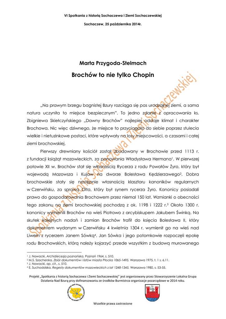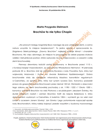 VI Spotkania z historią Sochaczewa i Ziemi Sochaczewskiej Sochaczew, 25 października 2014r. Marta Przygoda-Stelmach Brochów to nie tylko Chopin „Na prawym brzegu bagnistej Bzury rozciąga się pas urodzajnej ziemi, a sama natura uczyniła to miejsce bezpiecznym”. To jedno zdanie z opracowania ks. Zbigniewa Skiełczyńskiego „Dawny Brochów” najlepiej oddaje klimat i charakter Brochowa. Nic więc dziwnego, że miejsce to przyciągało do siebie poprzez stulecia wielkie i nietuzinkowe postaci, które wpływały na losy miejscowości, a czasami i całej ziemi brochowskiej. Pierwszy drewniany kościół został zbudowany w Brochowie przed 1113 r. z fundacji książąt mazowieckich, za panowania Władysława Hermana1. W pierwszej połowie XII w. Brochów stał się własnością Rycerza z rodu Powałów Żyro, który był wojewodą Mazowsza i Kujaw na dworze Bolesława Kędzierzawego2. Dobra brochowskie stały się następnie własnością klasztoru kanoników regularnych w Czerwińsku, za sprawą Olta, który był synem rycerza Żyro. Kanonicy posiadali prawo do gospodarowania Brochowem przez niemal 150 lat. Wzmianki o obecności tego zakonu na ziemi brochowskiej pochodzą z ok. 1198 i 1222 r.3 Około 1300 r. kanonicy wymienili Brochów na wieś Piotrowo z arcybiskupem Jakubem Świnką. Na skutek kolejnych nadań i zamian Brochów trafił do księcia Bolesława II, który dokumentem wydanym w Czerwińsku 4 kwietnia 1304 r. wymienił go na wieś nad Liwem z rycerzem Janem Sówką4. Jan Sówka i jego potomkowie rozpoczęli epokę rodu Brochowskich, którą należy kojarzyć przede wszystkim z budową murowanego J. Nowacki, Archidiecezja poznańska, Poznań 1964, s. 510. M.S. Szacherska, Zbiór dokumentów i listów miasta Płocka 1065-1495, Warszawa 1975, t. 1 s. 6,11. 3 J. Nowacki, op. cit., s. 510. 4 E. Suchodolska, Regesty dokumentów mazowieckich z lat 1248-1345, Warszawa 1980, s. 53-55. 1 2 Projekt „Spotkania z historią Sochaczewa i Ziemi Sochaczewskiej” jest organizowany przez Stowarzyszenie Lokalna Grupa Działania Nad Bzurą przy dofinansowaniu ze środków Burmistrza organizacje pozarządowe w 2014 roku. Wszelkie prawa zastrzeżone VI Spotkania z historią Sochaczewa i Ziemi Sochaczewskiej Sochaczew, 25 października 2014r. kościoła w 1351r. i jego przebudową w latach 1551-1561 według projektu Jana Baptysty Wenecjanina5. W 1661 r. Brochów został ostatecznie przejęty przez Olbrachta Adriana Lasockiego, męża Agnieszki Brochowskiej6. Lasoccy administrowali dobrami nad Bzurą do lat trzydziestych XX w. Dzisiaj Brochów kojarzony jest przede wszystkim z rodziną Chopinów, którzy upodobali sobie Bazylikę brochowską i związali z nią najważniejsze uroczystości rodzinne, takie jak ślub Tekli Justyny Krzyżanowskiej i Mikołaja Chopina 28 czerwca 1806 r., chrzest Fryderyka Chopina 23 kwietnia 1810 r. i ślub siostry kompozytora Ludwiki Chopin z Józefem Kalasantym Jędrzejewiczem 22 listopada 1832 r. Brochów już na zawsze będzie związany z tą niezwykłą rodziną, która dała nie tylko Polsce, ale i całemu światu, jednego z najwybitniejszych muzyków w dziejach ludzkości. Należy również podkreślić, że Brochów zyskał na obecności Chopinów i stał się dzięki temu jeszcze bardziej znany i doceniany. Ale czy tylko Chopinowie zasługują na jedne z pierwszych miejsc w dziejach Brochowa? Na początek należałoby cofnąć się do XVII w., który przeszedł do historii, jako wiek wojen i był jednym z najtrudniejszych okresów w dziejach narodu polskiego. Żył wtedy jeden z najbardziej znanych, ale i też najbardziej niejednoznacznych przedstawicieli rodu Brochowskich – Adam Brochowski. Nasz bohater był synem Piotra Brochowskiego i Katarzyny Radziejowskiej herbu Junosza, a tym samym siostrzeńcem Hieronima Radziejowskiego, poplecznika króla szwedzkiego i jednego z inicjatorów zdrady szlachty polskiej pod Ujściem7. Urodził się ok. 1600 r., a zmarł w 1658 r. W Herbarzu Bonieckiego wymieniany jest jako pisarz ziemski zakroczymski (1632), chorąży sochaczewski (1647), poseł liwski na sejm elekcyjny (1648) i wreszcie kasztelan sochaczewski (1655)8. Rola, jaką przyszło mu odegrać w historii Najjaśniejszej Rzeczypospolitej podczas potopu szwedzkiego (1655-1660), jest do dzisiaj analizowana i poddawana pod dyskusję przez historyków. J. Bartoszewicz, Brochów, ,,Tygodnik Ilustrowany’’, 1860, nr 36, s. 329; M. Stefanowski, Na marginesie katalogu Archidiecezji Warszawskiej z roku 1935, „Studia Theologica Varsaviensia", R.30, 1992, nr 1, s. 220. 6 F. Mincer, Lasocki Olbracht Adrian(1631-1693), w: Polski Słownik Biograficzny, red. B. Leśnodorski, Wrocław 1992, t. 16, s. 544-545. 7 M. Markiewicz, Historia Polski 1492-1795, Kraków 2006, s. 524-527. 8 A.Boniecki, Herbarz polski : wiadomości historyczno-genealogiczne o rodach szlacheckich, Cz. 1 t. 2, Warszawa 1900, s. 123. 5 Projekt „Spotkania z historią Sochaczewa i Ziemi Sochaczewskiej” jest organizowany przez Stowarzyszenie Lokalna Grupa Działania Nad Bzurą przy dofinansowaniu ze środków Burmistrza organizacje pozarządowe w 2014 roku. Wszelkie prawa zastrzeżone VI Spotkania z historią Sochaczewa i Ziemi Sochaczewskiej Sochaczew, 25 października 2014r. Adam Brochowski, nazywany stronnikiem i przyjacielem Radziejowskiego, znalazł się w szeregach pospolitego ruszenia przy boku Jana Kazimierza. Monarcha obdarzył kasztelana sochaczewskiego niezwykła misją. Wysłał go 8 września 1655 r. spod Wolborza jako swego posła do Karola X Gustawa. 9 września 1655 r. Adam Brochowski wygłosił patetyczną mowę przed królem szwedzkim w imieniu króla Jana Kazimierza, kiedy ten wkraczał na Wawel9. Przy wejściu do katedry Adam Brochowski przywitał Karola Gustawa takimi oto słowami (fragment): „Dla wielu może wyda się to za późno, mnie się jednak zdaje, że dla tych ziem, tylą klęskami skołatanych, dla tych pokrewnych Królów, dla tych stron mordujących się wzaj