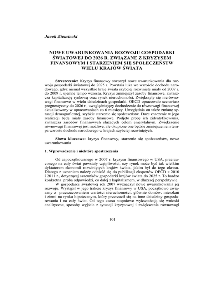 Jacek Ziemiecki NOWE UWARUNKOWANIA ROZWOJU GOSPODARKI ŚWIATOWEJ DO 2026 R. ZWIĄZANE Z KRYZYSEM FINANSOWYM I STARZENIEM SIĘ SPOŁECZEŃSTW WIELU KRAJÓW ŚWIATA Streszczenie: Kryzys finansowy stworzył nowe uwarunkowania dla rozwoju gospodarki światowej do 2025 r. Powstała luka we wzroście dochodu narodowego, gdyż niemal wszystkie kraje świata szybciej rozwinięte miały od 2007 r. do 2009 r. ujemne tempo wzrostu. Kryzys zmniejszył zasoby finansowe, zwłaszcza kapitalizację rynkową oraz rynek nieruchomości. Zwiększyły się nierównowagi finansowe w wielu dziedzinach gospodarki. OECD opracowało scenariusz prognostyczny do 2026 r., uwzględniający dochodzenie do równowagi finansowej aktualizowany w opracowaniach co 6 miesięcy. Uwzględnia on także zmianę sytuacji demograficznej, szybkie starzenie się społeczeństw. Duże znaczenie w jego realizacji będą miały zasoby finansowe. Podjęto próbę ich zidentyfikowania, zwłaszcza zasobów finansowych służących celom emerytalnym. Zwiększenie równowagi finansowej jest możliwe, ale okupione one będzie zmniejszeniem tempa wzrostu dochodu narodowego w krajach szybciej rozwiniętych. Słowa kluczowe: kryzys finansowy, starzenie się społeczeństw, nowe uwarunkowania 1. Wprowadzenie i niektóre spostrzeżenia Od zapoczątkowanego w 2007 r. kryzysu finansowego w USA, przerzuconego na cały świat powstały wątpliwości, czy rynek może być tak wielkim dyktatorem ekonomii rozwiniętych krajów świata, jakim był do tego okresu. Dlatego z uznaniem należy odnieść się do publikacji ekspertów OECD z 2010 i 2011 r., dotyczącej szacunków gospodarki krajów świata do 2025 r. To bardzo konkretna próba odpowiedzi, co dalej z kapitalizmem, w dłuższej perspektywie. W gospodarce światowej rok 2007 wyznaczył nowe uwarunkowania jej rozwoju. Wystąpił w jego trakcie kryzys finansowy w USA, początkowo związany z przeszacowaniem wartości nieruchomości, głównie domów, mieszkań i ziemi na rynku hipotecznym, który przerzucił się na inne dziedziny gospodarowania i na cały świat. Od tego czasu stopniowo wykształcają się wnioski analityczne, sposoby wyjścia z sytuacji kryzysowej i zwiększenia równowagi 101 MATERIAŁY NADESŁANE, POLEMIKI I DYSKUSJE finansowej na świecie, choć pozostało jeszcze wiele niewiadomych. Oto niektóre spostrzeżenia: 1. Rynek pozostanie regulatorem gospodarki, ale jego rola będzie podlegała zwiększonej sterowalności przez państwo, ściślejszej kontroli węzłowych wskaźników finansowych oraz wprowadzenia regulacji finansowych zmniejszających możliwości ponownego zarzewia kryzysowego gospodarki. 2. W trosce o wzrost gospodarczy oraz zapewnienie płynności finansowej, państwa krajów rozwiniętych przejęły część aktywów wielu złych banków i firm, emitując obligacje, które zwiększyły ich dług publiczny. W ten sposób przyspieszeniu uległ proces wychodzenia z kryzysu, a po okresie spadku dochodu narodowego nastąpił, jak dotąd, jego wzrost. 3. Dość powszechnie uważa się rok 2010 za fazę końcową kryzysu. Według wniosków z analiz statystycznych ekonomistów francuskich1, formułowanych na podstawie światowych kryzysów ekonomiczno-finansowych XX wieku, można wyróżnić różne fazy wyjścia z kryzysu. I tak: ceny nieruchomości wracają do poziomu wyjścia po 5 latach, kursy giełdy kapitałowej po 3 lub 4 latach, poprzednia stopa bezrobocia po 7 lub 8 latach, a wzrost produktu krajowego brutto po 1,9 roku. 4. Główną metodą osłabienia ostatniego kryzysu było niedopuszczenie do utraty płynności finansowej dla największych firm, głównie bankowofinansowych, poprzez wsparcie ich kapitałem państwowym banków centralnych, a także pobudzanie popytu, głównie wewnętrznego, krajowego. Przebiegało to trochę inaczej, niż w okresie Wielkiego Kryzysu z lat 19291933, gdy upadłości firm były zjawiskiem masowym wywołującym cały łańcuch innych upadłości, zwłaszcza firm produkcyjnych. Mimo względnego nadmiaru kapitału nastąpił więc w okresie 2007-2009 wzrost ilości pieniądza w gospodarce i wzrost długu publicznego, w wielu krajach świata. Profesor Attali określił to bardziej dosadnie: kryzys został wywołany przez popyt na zadłużone aktywa finansowe (subprime i inne) oraz ich lewarowanie. Ale przez to kryzys się szybciej kończy. A już w okresie wzrostu dochodu narodowego kraje rozwinięte chcą się stopniowo pozbywać nadmiernie rozrośniętego długu publicznego. Warte rozważenia jest, czy te poczynania będą miały wpływ na przyszłe tempo wzrostu dochodu narodowego. 5. W latach 2010 i 2011 wykształciły się trzy główne sposoby uzyskiwania wzrostu gospodarczego w okresie pokryzysowym. Pierwszy dotyczy takich krajów jak USA czy Japonia. Kraje te zapowiadają stosowanie wielkich dopłat i dotacji, które przez szereg najbliższych lat będą zwiększały dług publiczny. Drugi dotyczy krajów Unii Europejskiej, w których oddłużanie następuje niemal od razu, choć stopniowo w ciągu 3 najbliższych lat. A trzeci dotyczy w zasadzie krajów, w których rynek finansowy nie ma takiej wagi jak w krajach rozwiniętych, a w bilansie bieżącym płatniczym uzyskiwane są z reguły znaczne nadwyżki płatnicze. Kraje te postawiły na zwiększenie 1 Aglietta, Michel, Lipietz Alain, “A la recherche d’un modele de croissance”. W: Problemes Economiques 17.02.2010, str. 27-32. 102 MATERIAŁY NADESŁANE, POLEMIKI I DYSKUSJE 6. 7. 8. 9. roli rynku wewnętrznego we wzroście gospodarczym. Są nimi głównie państwa tzw. bloku BRIC (Brazylia Rosja, Indie, Chiny), choć Rosja w związku ze spadkiem popytu na ropę i gaz ziemny ma przejściowo znaczne kłopoty ze wzrostem gospodarczym. Należy do nich też po części Polska. Kraje rozwinięte Europy, które w związku z kryzysem zadłużyły się nadmiernie, a też i USA (w dalszych latach) wprowadzają fiskalizm podatkowy. Dotyczy opodatkowania dochodów, głównie 