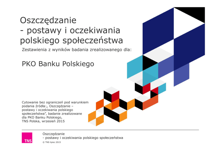 Oszczędzanie - postawy i oczekiwania polskiego społeczeństwa Zestawienia z wyników badania zrealizowanego dla: PKO Banku Polskiego Cytowanie bez ograniczeń pod warunkiem podania źródła:„ Oszczędzanie – postawy i oczekiwania polskiego społeczeństwa”, badanie zrealizowane dla PKO Banku Polskiego, TNS Polska, wrzesień 2015 Oszczędzanie - postawy i oczekiwania polskiego społeczeństwa © TNS lipiec 2015 1 Informacje o badaniu Oszczędzanie - postawy i oczekiwania polskiego społeczeństwa © TNS lipiec 2015 Informacje o badaniu Cele badania Dostarczenie konkretnych rekomendacji, które i zwyczajów Polaków względem oszczędzania. pomogą w poznaniu postaw Metodologia Pomiar ilościowy zrealizowano metodą wywiadów face-to-face (CAPI). Wielkość próby • Próba podstawowa: Osoby w wieku 18-55 lat, reprezentacja społeczeństwa (wiek; płeć, miejsce zamieszkania) N=411 • Booster: Nadreprezentacja osób z wyższym dochodem (dochód osobisty powyżej 5000 zł netto) N=200 + 24 Termin realizacji Badanie zrealizowano na terenie całej Polski w dniach 3 – 14.07.2015. Oszczędzanie - postawy i oczekiwania polskiego społeczeństwa © TNS lipiec 2015 3 2 Jak oszczędzają Polacy? Oszczędzanie - postawy i oczekiwania polskiego społeczeństwa © TNS lipiec 2015 Korzystanie z usług banków Czy korzysta Pan(i) z usług banków? GŁÓWNY BANK: 89% 98% Oszczędzanie - postawy i oczekiwania polskiego społeczeństwa © TNS lipiec 2015 Inny bank 1% 2% 1% 2% 1% 4% 4% 1% 1% 3% 3% 2% 2% 3% 7% 2% 5% 6% 6% 6% 7% 6% BANKI SPÓŁDZIELCZE 13% 10% 14% 12% N=411 1% 1% N=367 N=224 Nie 14% 13% 19% 25% N=220 ZAMOŻNI POLACY 5 Znane sposoby na lokowania oszczędności 99% 93% Konto osobiste 58% Lokata terminowa 41% 58% Rachunek oszczędnościowy Działka, nieruchomości Gotówka trzymana w domu Złoto, biżuteria Obligacje Skarbu Państwa Akcje spółek giełdowych Lokata z funduszem inwestycyjnym Program Systematycznego Oszczędzania IKE/ IKZE Antyki, dzieła sztuki Jednostki Funduszy Inwestycyjnych Inwestycje na własną/cudzą firmę Polisa inwestycyjna Trudno powiedzieć, nie znam żadnych 40% 36% 22% 22% 21% 15% 14% 19% 10% 14% 8% 16% 4% 13% 5% 13% 3% 9% 5% 13% 3% 12% 3% 12% 2% 1% 7% ZAMOŻNI N=224 POLACY N=411 Oszczędzanie - postawy i oczekiwania polskiego społeczeństwa © TNS lipiec 2015 6 Średni udział produktów w portfelu Polacy (N=374) Zamożni (N=220) 67,0% 46,5% Rachunek oszczędnościowy 6,6% 17,7% Gotówka trzymana w domu 6,6% 3,3% Lokata terminowa 3,0% 12,9% Działka, nieruchomości 1,7% 6,3% Jednostki Funduszy Inwestycyjnych 1,2% 1,7% Program Systematycznego Oszczędzania 0,7% 0,8% Akcje spółek giełdowych 0,5% 0,5% Złoto, biżuteria 0,4% 0,9% IKE/ IKZE 0,4% 1,2% Lokata z funduszem inwestycyjnym 0,3% 2,1% Obligacje Skarbu Państwa 0,3% 0,2% Polisa inwestycyjna 0,2% 0,9% Inwestycje na własną/cudzą firmę 0,1% 1,4% 0 0,2% 0,4% 0,1% Konto osobiste Antyki, dzieła sztuki Inne Oszczędzanie - postawy i oczekiwania polskiego społeczeństwa © TNS lipiec 2015 7 Kwota oszczędności MIESIĘCZNA KWOTA OSZCZĘDNOŚCI GOSPODARSTWA DOMOWEGO 35% 27% 30% 27% 101-200 zł 16% *nie wiem 9% 4% POLACY N=313 6% 13% Do 100 zł 10% ZAMOŻNI N=222 16% 8% *odmowa 201-500 zł Ponad 500 zł WSZYSTKIE OSZCZĘDNOŚCI GOSPODARSTWA DOMOWEGO 38% 27% 14% 12% 9% 8% 11% Do 1 000 zł Do 5 000 zł *nie wiem 34% ZAMOŻNI N=222 41% POLACY N=313 6% Do 10 000 zł Ponad 10 000 zł Oszczędzanie - postawy i oczekiwania polskiego społeczeństwa © TNS lipiec 2015 8 3 Jak Polacy mogliby oszczędzać? Oszczędzanie - postawy i oczekiwania polskiego społeczeństwa © TNS lipiec 2015 Wynik finansowy budżety gospodarstwa domowego Polacy (N=411) 16% Zamożni (N=224) 1% 13% 42% 42% 33% 9% 1% 44% Ledwo starcza mi od pierwszego do pierwszego Wszystko przeznaczam na bieżące potrzeby Z reguły przeznaczam wszystkie środki na bieżące potrzeby, ale od czasu do czasu udaje mi się coś zaoszczędzić Poza bieżącymi wydatkami regularnie odkładam pewną sumę pieniędzy odmowa *chodzi tu zarówno o produkty bankowe jak i niebankowe np. posiadanie nieruchomości, biżuterii, gotówki trzymanej w domu. Oszczędzanie - postawy i oczekiwania polskiego społeczeństwa © TNS lipiec 2015 10 Kwota oszczędności Możliwość zaoszczędzenia wskazanej kwoty w przypadku gdy odkładanie pieniędzy byłoby koniecznością Top 2 1000 PLN i więcej ZAMOŻNI 4% 15% 27% 67% 71% 59% 49% 33% 24% 500 PLN 300 PLN 29% 57% 14% 78% 24% 24% 25% 2% 1% 2% 50 PLN 5% 1% 2% 100 PLN 29% 23% 12% 33% 28% 7% 3% 2% 200 PLN 12% 6% 4% 12% 8% 300 PLN 500 PLN 1000 PLN i więcej 18% 11% 7% 7% 1% 3% 18% 12% POLACY 200 PLN 44% 88% 46% 71% 100 PLN 68% 50 PLN 30% 13% 25% 37% 67% 59% 22% 36% 92% 82% 7% 24% 5% 2% 6% 1% 2% 13% 25% 13% 5% 7% 1% 2% 50 PLN PLN 50 100 PLN 100 PLN 95% ZAMOŻNI (N=224) POLACY (N=411) 25% 29% 7% 9% 3% 2% 200 PLN 200 PLN nie wiem Raczej nie Zdecydowanie tak 27% 49% 21% 33% 24% 53% 39% 29% 12% 6% 10% 4% 300 PLN 300 PLN 23% 12% 12% 8% 15% 12% 65% 33% 28% 13% 12% 500 PLN 1000 PLN 500 PLN 1000 PLNi więcej i więcej Zdecydowanie nie Raczej tak Oszczędzanie - postawy i oczekiwania polskiego społeczeństwa © TNS lipiec 2015 11 Preferowane produkty GDZIE CHCIELIBY ULOKOWAĆ GDYBY POSIADALI OSZCZĘDNOŚCI* Z CZEGO ZREZYGOWALIBY ABY ODŁOŻYĆ PIENIĄDZE konto osobiste 42% kino / teatr / kultura 24% jedzenie, żywność 13% rachunek oszczędnościowy kosmetyki 13% przyjemności / rozrywka 3% akcje spółek giełdowych 3% kupowanie tańszych produktów 6% lokatę z funduszem inwestycyjnym dodatkowe zajęcia, hobby 2% nie wiem * Pytanie zadawane osobom, które wszystko wydają na bieżące potrzeby ZAMOŻNI N=31 8% 7% 16% 5% ograniczenie wydatków (ogólnie) 6% 4% restauracje 9% 2% inne 9% 8% nie wiem / trudno powiedzieć 9% 9% 13% nie mam z czego rezygnować 18% 10% 9% 2% 5% 1% 23% 13% 9% papierosy 9% inne 4% 10% 5% 5% 1% 6% nieruchomości 15% 13% samochód 6% trzymałabym gotówkę w domu 22% 20% ubrania 13% lokatę terminową 33% 
