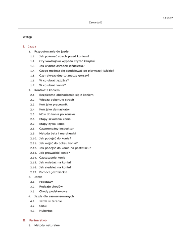 141337 Zawartość Wstęp I. Jazda 1. Przygotowanie do jazdy 1.1. Jak pokonać strach przed koniem? 1.2. Czy kowbojowi wypada czytać książki? 1.3. Jak wybrać ośrodek jeździecki? 1.4. Czego możesz się spodziewać po pierwszej jeździe? 1.5. Czy rekreacyjny to znaczy gorszy? 1.6. W co ubrać jeźdźca? 1.7. W co ubrać konia? 2. Kontakt z koniem 2.1. Bezpieczne obchodzenie się z koniem 2.2. Wiedza pokonuje strach 2.3. Koń jako pracownik 2.4. Koń jako demaskator 2.5. Mów do konia po końsku 2.6. Etapy szkolenia konia 2.7. Etapy życia konia 2.8. Czworonożny instruktor 2.9. Metoda bata i marchewki 2.10. Jak podejść do konia? 2.11. Jak wejść do boksu konia? 2.12. Jak podejść do konia na pastwisku? 2.13. Jak prowadzić konia? 2.14. Czyszczenie konia 2.15. Jak wsiadać na konia? 2.16. Jak siedzieć na koniu? 2.17. Pomoce jeździeckie 3. 3.1. Podstawy 3.2. Rodzaje chodów 3.3. Chody podstawowe 4. II. Jazda Jazda dla zaawansowanych 4.1. Jazda w terenie 4.2. Skoki 4.3. Hubertus Partnerstwo 5. Metody naturalne 5.1. Kto był pierwszy - koń czy człowiek? 5.2. Czy metody naturalne to coś nowego? 5.3. Koń, jaki jest, każdy widzi 6. 6.1. Dlaczego konie mają tak różne charaktery? 6.2. Koń matematyk - typ lewopółkulowy 6.3. Koń artysta - typ prawopółkulowy 6.4. Co na sercu, to na widelcu - koń ekstrawertyk 6.5. Cicha woda brzegi rwie - koń introwertyk 7. III. Charakter konia Siedem zabaw 7.1. Halo, tu Ziemia! 7.2. Zabawa w zaprzyjaźnianie 7.3. Zabawa w jeża 7.4. Zabawa w prowadzenie 7.5. Zabawa w jo-jo 7.6. Zabawa w okrążanie 7.7. Zabawa w chody boczne 7.8. Zabawa w przeciskanie Koń 8. Własny koń? 8.1. Gdy zaczynasz węszyć, czując zapach konia 8.2. Jak przekonać rodzinę do zakupu konia? 8.3. Co należy rozważyć przed kupnem konia? 9. Rasy, maści i odmiany 9.1. Trzy grupy koni 9.2. Konie gorącokrwiste 9.3. Konie zimnokrwiste 9.4. Kuce 9.5. Maści koni 9.6. Odmiany 9.7. Oznaczenia ras 10. Jak działa koń? 10.1. Dlaczego trzeba znać budowę konia? 10.2. Narządy zmysłów 10.3. Budowa ciała 10.4. Budowa kopyta 10.5. Układ pokarmowy 11. Pańskie oko konia tuczy 11.1. Potrzeba ruchu 11.2. Końskie apartamenty 11.3. Konstrukcja pomieszczeń 11.4. Pojenie i karmienie 12. Gdy z jednym koniem kłopotów za mało 12.1. Po czym poznać hodowcę? 12.2. Na czym polega hodowla koni? 12.3. Ile trwa wyhodowanie konia? 12.4. Czy wiesz, na co się decydujesz? 12.5. Przygotowanie do krycia 12.6. 11 miesięcy z życia końskiego płodu 12.7. Jak przygotować się do porodu? 12.8. Co świadczy o zbliżającym się porodzie? 12.9. Etapy porodu 12.10. Instrukcja obsługi źrebaka 13. Końskie zdrowie 13.1. W zdrowym ciele zdrowy duch 13.2. Mierniki zdrowia konia 13.3. Jak być zdrowym i bogatym? 13.4. Zdrowy jak koń 13.5. Choroby skóry 13.6. Choroby kopyt 13.7. Układ kostny 13.8. Ścięgna i więzadła 13.9. Mięśnie 13.10. Układ pokarmowy 13.11. Układ oddechowy 13.12. Narowy 13.13. Nałogi 13.14. Trujące rośliny 13.15. Pasożyty Dodatki: A. Słownik terminów jeździeckich B. Przysłowia o koniach i jeźdźcach C. Minisłownik hipologiczny angielsko-polski D. Przykłady odmian na głowie E. Przykłady odmian na nogach