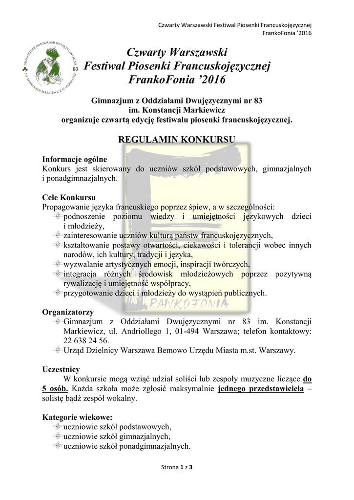 Czwarty Warszawski Festiwal Piosenki Francuskojęzycznej FrankoFonia ’2016 Czwarty Warszawski Festiwal Piosenki Francuskojęzycznej FrankoFonia ’2016 Gimnazjum z Oddziałami Dwujęzycznymi nr 83 im. Konstancji Markiewicz organizuje czwartą edycję festiwalu piosenki francuskojęzycznej. REGULAMIN KONKURSU Informacje ogólne Konkurs jest skierowany do uczniów szkół podstawowych, gimnazjalnych i ponadgimnazjalnych. Cele Konkursu Propagowanie języka francuskiego poprzez śpiew, a w szczególności: podnoszenie poziomu wiedzy i umiejętności językowych dzieci i młodzieży, zainteresowanie uczniów kulturą państw francuskojęzycznych, kształtowanie postawy otwartości, ciekawości i tolerancji wobec innych narodów, ich kultury, tradycji i języka, wyzwalanie artystycznych emocji, inspiracji twórczych, integracja różnych środowisk młodzieżowych poprzez pozytywną rywalizację i umiejętność współpracy, przygotowanie dzieci i młodzieży do wystąpień publicznych. Organizatorzy Gimnazjum z Oddziałami Dwujęzycznymi nr 83 im. Konstancji Markiewicz, ul. Andriollego 1, 01-494 Warszawa; telefon kontaktowy: 22 638 24 56. Urząd Dzielnicy Warszawa Bemowo Urzędu Miasta m.st. Warszawy. Uczestnicy W konkursie mogą wziąć udział soliści lub zespoły muzyczne liczące do 5 osób. Każda szkoła może zgłosić maksymalnie jednego przedstawiciela – solistę bądź zespół wokalny. Kategorie wiekowe: uczniowie szkół podstawowych, uczniowie szkół gimnazjalnych, uczniowie szkół ponadgimnazjalnych. Strona 1 z 3 Czwarty Warszawski Festiwal Piosenki Francuskojęzycznej FrankoFonia ’2016 Eliminacje Każdy wykonawca biorący udział w konkursie prezentuje tylko jeden utwór w języku francuskim. Uczniowie szkół podstawowych przygotowują utwór w języku francuskim bądź w dowolnym tłumaczeniu na język polski. Tematyka, gatunek i rodzaj piosenek dowolny – mile widziane utwory współczesne. Prezentacja nie może przekraczać 5 minut. Uczestnicy zobowiązani są do zgłaszania się do konkursu z własnym podkładem muzycznym – wersją instrumentalną (plik audio bądź MP3). Podkłady muzyczne należy nagrać na płytę CD, PEN-DRIVE (lub przesłać drogą elektroniczną na adres e-mailowy: [email protected]), podpisać imieniem, nazwiskiem oraz nazwą szkoły i przesłać / dostarczyć organizatorowi w obowiązującym terminie zgłoszeń. Organizatorzy zapewniają tylko sprzęt nagłaśniający w postaci mikrofonów. Szczegółowy harmonogram przesłuchań konkursowych będzie zamieszczony do dnia 6 maja 2016 r. na stronie internetowej organizatora: www.markiewicz.edu.pl Zgłoszenia Warunkiem uczestnictwa w konkursie jest czytelne i kompletne wypełnienie karty zgłoszenia i przesłanie jej / dostarczenie wraz z nośnikiem podkładu instrumentalnego (plik audio bądź MP3) oraz zgodą na przetwarzanie i przechowywanie danych osobowych na adres organizatora: Gimnazjum z Oddziałami Dwujęzycznymi nr 83 im. Konstancji Markiewicz, ul. Andriollego 1, 01-494 Warszawa, z dopiskiem „Czwarty Warszawski Festiwal Piosenki Francuskojęzycznej – FrankoFonia ’2016”. Kompletne zgłoszenia należy składać do organizatora w nieprzekraczalnym terminie do dnia 29 kwietnia 2016 roku (decyduje data wpłynięcia zgłoszenia do organizatora). Kolejność występowania uczestników zostanie ustalona przez organizatorów odpowiednio do kategorii wiekowej. Organizator ma prawo do korekty kolejności występowania w trakcie trwania konkursu. Informacje o planowanym harmonogramie występów zostaną zamieszczone na stronie internetowej organizatora (www.markiewicz.edu.pl). Najpóźniej 30 minut przed rozpoczęciem występu należy zgłosić się do Recepcji festiwalu. Koszty przejazdu, pobytu i ubezpieczenia pokrywają uczestnicy. Uczestnictwo w konkursie jest bezpłatne. Organizatorzy informują, że po terminie zgłoszeń nie można zmienić repertuaru wykonywanego podczas przesłuchania utworu. Strona 2 z 3 Czwarty Warszawski Festiwal Piosenki Francuskojęzycznej FrankoFonia ’2016 Konkurs i Komisja Konkursowa. Jury zostanie wyłonione przez Organizatorów Konkursu. W skład Jury wejdą osoby kompetentne w dziedzinie języka francuskiego oraz muzyki. Oceniane będą: walory głosowe i muzykalność, poprawność językowa i dykcja, interpretacja utworu, ogólny wyraz artystyczny. Jury będzie dokonywało oceny zgodnie z powyższymi kryteriami. Końcowa ocena występu jest sumą ocen jurorów. Obrady jury są tajne, a jego decyzje ostateczne i nieodwołalne. Decyzją Jury Konkursu najlepszy uczestnik może zostać uhonorowany nagrodą Grand Prix. W pozostałych przypadkach przewidziane są wyróżnienia, a także nagrody rzeczowe. Wszyscy uczestnicy konkursu otrzymają dyplomy uczestnictwa i drobne upominki. Terminy Przesłuchania konkursowe „Czwartego Warszawskiego Festiwalu Piosenki Francuskojęzycznej – FrankoFonia ’2016” odbędą się w piątek – 13 maja 2016 roku, a uroczysty koncert wraz z wręczeniem nagród, wyróżnień i dyplomów odbędzie się 4 czerwca 2016 roku (sobota) w godzinach popołudniowych w Amfiteatrze, w Parku Górczewska (wjazd od ul. Ranigisa). Wyniki przesłuchań konkursowych będą podane do wiadomości dopiero podczas Koncertu Galowego. Wobec powyższego, wszyscy wykonawcy powinni być przygotowani do wykonania konkursowej piosenki. Strona 3 z 3