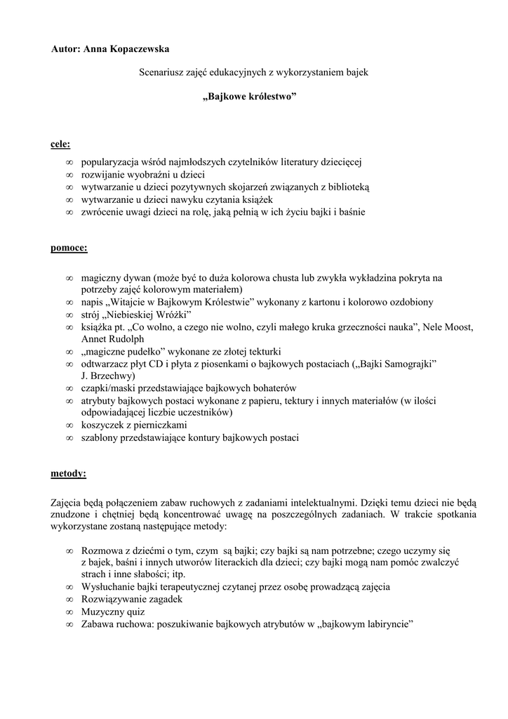 Autor: Anna Kopaczewska Scenariusz zajęć edukacyjnych z wykorzystaniem bajek „Bajkowe królestwo” cele: • • • • • popularyzacja wśród najmłodszych czytelników literatury dziecięcej rozwijanie wyobraźni u dzieci wytwarzanie u dzieci pozytywnych skojarzeń związanych z biblioteką wytwarzanie u dzieci nawyku czytania ksiąŜek zwrócenie uwagi dzieci na rolę, jaką pełnią w ich Ŝyciu bajki i baśnie pomoce: • • • • • • • • • • magiczny dywan (moŜe być to duŜa kolorowa chusta lub zwykła wykładzina pokryta na potrzeby zajęć kolorowym materiałem) napis „Witajcie w Bajkowym Królestwie” wykonany z kartonu i kolorowo ozdobiony strój „Niebieskiej WróŜki” ksiąŜka pt. „Co wolno, a czego nie wolno, czyli małego kruka grzeczności nauka”, Nele Moost, Annet Rudolph „magiczne pudełko” wykonane ze złotej tekturki odtwarzacz płyt CD i płyta z piosenkami o bajkowych postaciach („Bajki Samograjki” J. Brzechwy) czapki/maski przedstawiające bajkowych bohaterów atrybuty bajkowych postaci wykonane z papieru, tektury i innych materiałów (w ilości odpowiadającej liczbie uczestników) koszyczek z pierniczkami szablony przedstawiające kontury bajkowych postaci metody: Zajęcia będą połączeniem zabaw ruchowych z zadaniami intelektualnymi. Dzięki temu dzieci nie będą znudzone i chętniej będą koncentrować uwagę na poszczególnych zadaniach. W trakcie spotkania wykorzystane zostaną następujące metody: • • • • • Rozmowa z dziećmi o tym, czym są bajki; czy bajki są nam potrzebne; czego uczymy się z bajek, baśni i innych utworów literackich dla dzieci; czy bajki mogą nam pomóc zwalczyć strach i inne słabości; itp. Wysłuchanie bajki terapeutycznej czytanej przez osobę prowadzącą zajęcia Rozwiązywanie zagadek Muzyczny quiz Zabawa ruchowa: poszukiwanie bajkowych atrybutów w „bajkowym labiryncie” w trakcie zajęć (poprzez zagadki, quiz muzyczny, bajkowy labirynt oraz szablony rozdane dzieciom) wykorzystana zostanie znajomość następujących utworów literackich: H.CH. Andersen- Calineczka, Brzydkie kaczątko, Królowa Śniegu, Mała Syrenka, Dziewczynka z zapałkami Jan Brzechwa- wiersze: Kaczka-dziwaczka, Entliczek-pentliczek, Tańcowała igła z nitką, Siedmiomilowe buty, Carlo Collodi- Pinokio, J. i W. Grimm- Czerwony Kapturek, Jaś i Małgosia, Królewna ŚnieŜka i 7 krasnoludków, Kopciuszek, Rybak i złota rybka, Śpiąca Królewna E.T.A Hoffmann - Dziadek do Orzechów Czesław Janczarski- Miś Uszatek Kornel Makuszyński - Przygody Koziołka Matołka, Alan A. Milne - Kubuś Puchatek, Charles Perrault- Kot w butach, Julian Tuwim- wiersze: Lokomotywa, Słoń Trąbalski, Okulary czas trwania zajęć: ok. 1. godz. Przebieg zajęć: W spotkaniu weźmie udział grupa 7-latków (ok. 15-20 osób) uczniów I klasy z jednej z iławskich szkół podstawowych. Zajęcia odbędą się w Miejskiej Bibliotece Publicznej w Iławie, w Oddziale Dla Dzieci, co ma szczególne znaczenie. Dzieci powinny bowiem od najmłodszych lat utoŜsamiać bibliotekę z miejscem przyjemnym i interesującym; z miejscem, gdzie mogą odnaleźć upragnione ksiąŜki, ale takŜe bawić się i wypoczywać. Spotkanie zaplanowano w taki sposób, by wspomnieć moŜliwie jak największą ilość baśni i bajek. Ponadto w trakcie spotkania dzieci zapoznają się z bajką terapeutyczną i odświeŜą pamięć o kilku wierszach J. Brzechwy. Dzięki temu poznają róŜne formy dziecięcej literatury. Po wejściu do biblioteki dzieci powita napis „Witamy w Bajkowym Królestwie”, co pozwoli im przenieść się mentalnie do świata bajek i fantazji. Dzieci przejdą do Oddziału Dla Dzieci, gdzie przywita je „Niebieska WróŜka” (osoba prowadząca zajęcia będzie przebrana w niebieski kostium wróŜki). Dzieci zostaną poproszone o zajęcie miejsc na „zaczarowanym dywanie”, który za chwilkę przeniesie je do Krainy Fantazji. Zanim jednak to się stanie, WróŜka zainicjuje rozmowę z dziećmi na temat roli bajek w naszym Ŝyciu. Dzieci będą odpowiadały na pytania o to, czy bajki i inne utwory literackie są nam w ogóle potrzebne; czy uczymy się czegoś od bajkowych postaci; czy bajki będą nam przydatne w dorosłym Ŝyciu; czy dorośli czytają bajki; jakie cechy charakteru mają bohaterowie ulubionych ksiąŜek; itp. (czas trwania: ok. 10 min.) Po takim wstępie dzieci razem z WróŜką przeniosą się do Krainy Fantazji. Aby dostać się do niej, muszą usiąść lub połoŜyć się wygodnie na „zaczarowanym dywanie” i zamknąć oczy. Niebieska WróŜka zaczyna czytać im bajkę terapeutyczną pt. „Co wolno, a czego nie wolno, czyli małego kruka grzeczności nauka” autorstwa Nele Moost i Annet Rudolph. KsiąŜka jest zabawna a przy tym ma wydźwięk edukacyjny. Uczy uŜywania form grzecznościowych. (czas trwania: ok. 15 min.). Następnie, aby sprawdzić, czy dzieci zrozumiały czytaną bajkę, wróŜka porozmawia z nimi chwilkę o morałach wynikających z opowieści. Poza tym dzieci będą musiały rozwiązać kilka zagadek nawiązujących do porad zawartych w opowiadaniu. WróŜka wybierze spośród zgłaszających się dzieci jedno, które wylosuje z magicznego pudełka jedną karteczkę z zagadką. Wszystkie dzieci wspólnie zgadują odpowiedź, aŜ trafią na poprawną. WróŜka wybierze wówczas kolejną chętną osobę, która wylosuje kolejną zagadkę. KaŜda odgadnięta odpowiedź będzie nagradzana przez WróŜkę brawami. W zaleŜności od zainteresowania dzieci, czynność tę moŜna powtórzyć kilka razy. (czas trwania: ok. 10 min.). Przykłady zagadek: 1. Jak się nazywa ta sztuka, której zająć próbował nauczyć kruka? (savoir-vivre) 2. Magiczne słowo, które wypowiedzieć trzeba, gdy się od kogoś poŜyczyć coś zamierza (proszę) 3. Rację miał zając kruka pouczając, Ŝe tych słów uŜywać nie przystaje (przekleństwa) 4. Gdy kruk upragnione dostał prezenty, słowo 