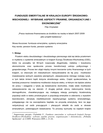 FUNDUSZE EMERYTALNE W KRAJACH EUROPY ŚRODKOWOWSCHODNIEJ - WYBRANE ASPEKTY PRAWNE, ORGANIZACYJNE I EKONOMICZNE1 Filip Chybalski „Praca naukowa finansowana ze środków na naukę w latach 2007-2009 jako projekt badawczy”. Słowa kluczowe: fundusze emerytalne, systemy emerytalne Key words: pension funds, pension systems 1. Wstęp Przełom wieku dwudziestego i dwudziestego pierwszego stał się także przełomem w myśleniu o systemie emerytalnym w krajach Europy Środkowo-Wschodniej (CEE), które na początku lat 90-tych rozpoczęły długotrwały, niełatwy i kosztowny ekonomicznie oraz społecznie proces transformacji ustroju politycznego i gospodarczego. Proces ten objął między innymi tworzenie rynku finansowego w tych krajach, co otworzyło ich mieszkańcom niewyobrażalne do tej pory możliwości inwestowania wolnych zasobów pieniężnych, ubezpieczania różnego rodzaju ryzyk, w tym także śmierci bądź dożycia określonego wieku. Część społeczeństwa, ta bardziej przezorna i świadoma możliwości dożycia wieku, w którym nie będzie zdolna do pracy i osiągania z tytułu jej świadczenia dochodów, miała wiele możliwości zabezpieczenia się na starość. Z drugiej jednak strony niekorzystne trendy demograficzne, charakteryzujące się malejącą relacją pomiędzy liczebnością populacji osób w wieku produkcyjnym a populacją emerytów w zderzeniu z wysokim bezrobociem, obnażyły nieefektywność repartycyjnego systemu emerytalnego, polegającego nie na oszczędzaniu kapitału na przyszłą emeryturę, lecz na jego redystrybucji od osób pracujących i płacących składki do osób w okresie emerytalnym, pobierających świadczenia. Te procesy wymusiły na rządach krajów 1 Sugerowany przypis: Chybalski F., Fundusze emerytalne w wybranych krajach Europy Środkowo-Wschodniej- wybrane aspekty prawne, organizacyjne i ekonomiczne, „Polityka Społeczna”, nr 2/2009, Warszawa 2009, s. 21-26. 1 Europy Środkowo-Wschodniej przeprowadzenie reform systemów emerytalnych, mających na celu znaczące oparcie tychże systemów na filarach kapitałowych. Mimo, iż każdy miał możliwość dobrowolnej akumulacji kapitału, uznano, iż należy stworzyć powszechność ubezpieczenia emerytalnego nie tylko w filarze repartycyjnym, lecz także w filarze kapitałowym. Stosowanie przymusu uczestnictwa w systemie zabezpieczenia społecznego wydaje się być oczywiste i wynika z następujących przesłanek (Golinowska 2002, s. 69-70): - zróżnicowanie preferencji w biografii ludzkiej, co wynika z większej skłonności młodych ludzi do ryzyka i niższej skłonności do oszczędzania na starość, - zróżnicowanie możliwości i preferencji oszczędzania na starość. Brak przymusu oszczędzania na starość sprawiałby, że część społeczeństwa nie uczestniczyłaby w zabezpieczaniu swej starości. Utrzymanie tej populacji w wieku poprodukcyjnym musiałaby wziąć na swe barki reszta społeczeństwa. Konieczność dywersyfikacji ryzyka niewypłacalności systemu emerytalnego („ruiny” systemu emerytalnego) w połączeniu z powyższymi przesłankami sprawia, iż połączenie w obowiązkowym systemie emerytalnym części repartycyjnej z częścią kapitałową wydaje się być najlepszym konstrukcyjnie rozwiązaniem. Stąd przełom stuleci można określić mianem początku ery funduszy emerytalnych w krajach Europy Środkowo-Wschodniej. Celem artykułu jest charakterystyka wybranych aspektów prawnych, organizacyjnych oraz ekonomicznych funkcjonowania funduszy emerytalnych w krajach CEE. 2. Konstrukcja zreformowanych systemów emerytalnych w krajach CEE Systemy emerytalne w krajach Europy CEE sprzed okresu reform można scharakteryzować jako systemy dwu-filarowe. Pierwszy filar, powszechny, był oparty na systemie repartycyjnym, natomiast drugi filar stanowiły wszelkie dobrowolne formy gromadzenia kapitału emerytalnego, tworzące nieformalny, niezinstytucjonalizowany i mało popularny system kapitałowy. Reformy systemów emerytalnych w naszym regionie Europy przebiegały w podobny sposób i ich wynikiem miało być powstanie systemu trzy-filarowego. I filar to nadal system repartycyjny, jednak w kilku przypadkach połączony ze zdefiniowaną składką, a nie, jak przed reformą, ze zdefiniowanym świadczeniem. II filar, kapitałowy, tworzony jest przez fundusze emerytalne, w których w większości, ale nie we wszystkich krajach CEE, członkostwo jest obowiązkowe. III filar, także kapitałowy, to dobrowolne, mniej lub bardziej 2 sformalizowane i zinstytucjonalizowane, formy gromadzenia kapitału emerytalnego. Mimo podobnych schematów reformy emerytalnej, stworzone konstrukcje trzyfilarowe różnią się między sobą (tab. 1). Tab.1. Konstrukcje systemów emerytalnych w wybranych krajach CEE Kraj Bułgaria Chorwacja Czechy Estonia I filar – repartycyjny System zdefiniowanego świadczenia System zdefiniowanej składki System zdefiniowanego świadczenia (od 2010 system zdefiniowanej składki) System zdefiniowanego świadczenia II filar Obowiązkowe fundusze emerytalne Obowiązkowe fundusze emerytalne brak Obowiązkowe fundusze emerytalne III filar Dobrowolne fundusze emerytalne, pracownicze programy emerytalne zarządzane przez towarzystwa emerytalne (klasyfikowane również jako IV filar) Dobrowolne plany emerytalne, oferowane przez fundusze emerytalne, związki zawodowe lub pracodawców Dobrowolne plany emerytalne zarządzane przez towarzystwa emerytalne Dobrowolne fundusze emerytalne lub ubezpieczenia emerytalne oferowane przez towarzystwa ubezpieczeń na życie Dobrowolne fundusze emerytalne lub konta emerytalne, zarządzane przez banki lub doradców inwestycyjnych (klasyfikowane również jako IV filar) Dobrowolne plany emerytalne zarządzane przez instytucje kredytowe, towarzystwa ubezpieczeń na życie, towarzystwa ubezpieczeń na życie. Węgry System zdefiniowanego świadczenia Obowiązkowe fundusze emerytalne Łotwa System zdefiniowanej składki Obowią