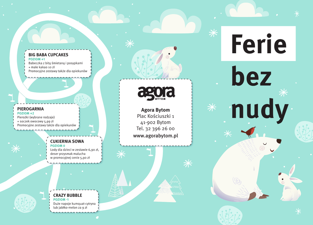 BIG BABA CUPCAKES POZIOM +1 Babeczka z bitą śmietaną i posypkami + małe kakao 10 zł Promocyjne zestawy także dla opiekunów PIEROGARNIA POZIOM +2 Pierożki (wybrane rodzaje) + soczek owocowy 5,99 zł Promocyjne zestawy także dla opiekunów CUKIERNIA SOWA POZIOM 0 Lody dla dzieci w zestawie 6,90 zł, deser przysmak malucha w promocyjnej cenie 5,90 zł CRAZY BUBBLE POZIOM -1 Duże napoje kumquat-cytryna lub jabłko-melon za 9 zł Agora Bytom Plac Kościuszki 1 41-902 Bytom Tel. 32 396 26 00 www.agorabytom.pl Ferie bez nudy W Agorze Bytom nie ma miejsca na nudę! Sprawdź, jak spędzić z nami ferie zimowe, korzystając z wyjątkowych promocji! KOLEJKA START! CINEMA CITY KLUB ODKRYWCÓW POZIOM +2 Bezpłatne zajęcia w każdą sobotę do końca marca, w godz. 12:00–17:00. Sprawdź harmonogram na www.agorabytom.pl POZIOM +2 Sprawdź repertuar na: www.cinema-city.pl Cena biletu dla dziecka na film 2D: 18 zł w tygodniu, 20 zł w weekend. Cena biletu dla dziecka na film 3D: 24 zł / 26 zł. W środy bilet dla każdego: 15 zł 2D / 21 zł 3D. Atrakcyjne ceny na barowe zestawy rodzinne! POZIOM +1 Zapraszamy wszystkie dzieci na bezpłatny przejazd kolejką kursującą na poziomie +1 w godzinach 10:00–18:00. Przystanek znajduje się przy salonie z zabawkami A KUKU. PIN-UP! CITY CLIMB BYTOM BAJTEL PLAC POZIOM +2 Bezpłatna, nowoczesna strefa zabawy dostępna dla dzieci 7 dni w tygodniu w godzinach otwarcia Galerii. Zachęcamy do korzystania z tradycyjnych atrakcji, takich jak ślizgawka, drabinki, bujaki i klasy. Do dyspozycji dzieci oddano również wielką tablicę do malowania kredą, stoliki do rysowania, a całość jest bezpieczna, dzięki miękkiej podłodze z piankowych płyt. POZIOM +1 Ścianka wspinaczkowa 15 zł / 30 min. Rezerwuj: 692 950 951 LASERHOUSE POZIOM +3 Zniżka dla grup – 12 zł / os. za 20 min. rozgrywkę Laser Tag (pon-pt do 15:00) Rezerwuj: 32 396 26 80 POZIOM +2 Kręgle od 39 zł za tor / godz. (max. 8 osób na torze) Bilard od 10 zł za stół / godz. Gry od 2 zł, m.in. cymbergaje, piłkarzyki, darty Rezerwuj: 32 396 29 70