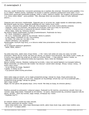 O zwierzętach 2 Dwa psy, pudel miniaturka i owczarek spotykają się w szpitalu dla zwierząt. Owczarek pyta pudełka: A ty tu co robisz?- Miałem pecha, nasikałem na dywan w salonie i państwo postanowili mnie uśpić. A ty?Zobaczyłem panią gdy pastowała podłogę, tyłek w niebo, żadnych majtek. Nie mogłem się powstrzymać!I co, teraz ciebie uśpią? - pyta pudelek.- Nie, dlaczego dziwi się owczarek, maja mi tylko spiłować pazury... Zajączka goni wkurzony niedźwiadek. Zajączek gna co sil przez las, nagle wpada na odsłonięta polanę. Na polanie opala się lisica. Zajączek podbiega do niej i ledwo żywy mówi: - Lisiczko, schowaj mnie gdzieś. Misio jak mnie dopadnie to ze mnie mokra plamka zostanie. - Zajączku, gdzie cię schowam. Na polanie ani krzaczka, tylko ja tu leżę na ręczniczku. - Lisiczko, a może ja bym ci wskoczył do dziurki miedzy nogi, co? - Wiesz zając, lubię cię. Schowaj się tam. Na polanę wpada niedźwiadek rzucając przekleństwami. Podchodzi do lisicy: - Ty, lisica, widziałaś tu zajączka? - No co ty, niedźwiedź, gdzie by się schował. Sama tu jestem. - A olać zająca. Podobasz mi się i cię przelecę. - Oj miśku, nie lubię cię i nie dam ci się. - Jestem silniejszy i cię zgwałcę! Niedźwiadek rozchylił nogi lisicy, a w dziurce widać dwa przerażone oczka. Zdziwiony mis pyta: - A co to? Na to zajączek piskliwym głosikiem: - AIDS, AIDS, AIDS!!! Są sobie dwa koty, jeden stary drugi młody. ;-) No i stary lubi sobie od czasu do czasu na kotki pochodzić. Młody tez by chciał, ale stary go zbywa, ze wpierw musi dorosnąć. Ale młody nudzi i nudzi, aż w końcu stary zgodził się wziąć go ze sobą na ruchanie kotek. ;-) Idą sobie po dachu i widza, ze niedaleko na balkonie seksowna kotka się wygrzewa. Stary mówi do młodego: - Rób to co ja. Bierze rozbieg i skacze. Niestety rozbieg był za krotki, i stary kot zawisł łapkami na krawędzi balkonu. Młody stwierdził, ze widocznie tak trzeba i tez skoczył i zawisł obok starego. Wiszą i wiszą i wiszą... W końcu stary mówi: - Ja już dłużej nie mogę. Spadam! I spada. A młody na to: - A ja jeszcze sobie trochę porucham. Idzie sobie zając po torach, aż tu nagle przejechał pociąg i obciął mu dupę. Dupa potoczyła się kilkanaście metrów dalej, na inne tory. Zajączek za nią pobiegł, schyla się i już ma ja podnieść gdy... przejechał drugi pociąg i obciął mu głowę. Jaki z tego morał? Nigdy nie trać głowy dla głupiej dupy. (inny morał: Nie lataj za dupą, bo stracisz głowę.) Myśliwy poszedł na polowanie i zobaczył zająca. Podszedł na 50 metrów, przymierzył, strzelił. Dym się rozwiał, zając dalej siedzi. Podszedł na 20 metrów - to samo. Zdenerwował się, przyłożył zającowi lufę do głowy, strzelił... Dym się rozwiał, zając wstaje, otrzepuje się i mówi: - Pojebało Cię??!! W rodzinie wilków urodził się mały wilczek. Tata wilk podchodzi do kołyski i mówi: - Jakie masz ładne oczy. Jaka masz błyszcząca sierść, jakie masz duże nogi, jakie masz wielkie uszy. - Oż ty kur*.*a zającu jeden. http://humor.urbanski.org - Humor i rozrywka Powered by Mambo Generated: 2 March, 2017, 01:35 Gospodarz kupił nowego koguta, który zaraz na podwórku chciał zrobić porządek i pokazać staremu kto tu jest panem. Stary kogut zaproponował: - OK, odejdę jeżeli wygrasz ze mną wyścigi naokoło studni, 50 okrążeń. - Nie ma sprawy, no to zaczynamy? - odrzekł młody. - Dobra, ale wiesz co ja znam teren, daje ci pół okrążenia forów. Młody kogut pewien zwycięstwa zaraz się rzucił do biegu i tak się gonią, ale odległość pozostaje ta sama. W pewnym momencie jakaś ręka chwyta młodego koguta za szyję, na pieniek odrąbuje głowę i słychać: - Q*.*a to już czwarty pedał w tym miesiącu. Przychodzi mrówka do krawca i mówi: - Jest nitka? - Jest! - Cale dwa cm proszę! - Zapakować??? - Nie! Powieszę się na miejscu! Siedzi zając i koń na gałęzi, na drzewie. Przechodzi krowa i tez chce sobie tak posiedzieć. Wdrapuje się na drzewo i mówi do zająca: - Ty zając, posuń się. A na to zając: - Nie mogę bo musiałbym konia zwalić. Jeż chciał bardzo iść na dziwki, ale się wstydził iść sam, wiec poprosił zająca (playboya), aby go zaprowadził do burdelu. Wiec idą aż tu nagle zając się wypieprzył na ziemie i mówi: - O q*.*a! A jeż, ze był prawie ślepy odpowiedział: - Dzień dobry! Mrówek ucieka z lasu i nagle na swej drodze spotyka leśniczego : - Co się stało? - pyta leśniczy - Ktoś zgwałcił słonicę. Wszyscy są podejrzani. Dzwonek do państwa słoni. Otwiera słoń, nikogo nie ma. Tuz po zamknięciu drzwi kolejny dzwonek. Słoń pomyślał, ze może się włącznik zepsuł. Otworzył drzwi, spojrzał, a na pstryczku siedzi mrówek i odzywa się grubym głosem: - Dobry wieczór, Czy jest słonica? - Nie ma. - To proszę przekazać, ze był Ryszard. Przylatuje mucha do WC Donald's i mówi: - Kupę proszę. - Z cebula? - Nie, bez cebuli. Po cebuli to z gęby śmierdzi Przebiega zając przez jezdnię, aż tu nagle się potknął. A jako, że zające maja 2 duże wystające zęby, to wbił się tymi zębami w asfalt. Próbuje cos na to poradzić i robi gwałtowne ruchy w dół i w górę, próbując się wydostać. Przechodzi w tym czasie obok bocian - zatrzymuje się i mówi...: http://humor.urbanski.org - Humor i rozrywka Powered by Mambo Generated: 2 March, 2017, 01:35 - Ty zając, Ty się tak nie śmiej, bo żeś nieźle przyp*.*. Mis, zajączek, wilk i lis grają w karty. Lis oszukuje. Po pewnym czasie niedźwiedź wstaje i mówi : - Ktoś tu oszukuje! Nie będę pokazywał palcem, ale jak strzelę w ten rudy pysk... Niedźwiedź miął w lesie sklep i wszystkie zwierzęta robiły u niego zakupy. Pewnego dnia przyszedł do niedźwiedzia zajączek i mówi: - Wiesz niedźwiedziu, chce otworzyć sobie sklep i przychodzę do ciebie spytać czy nie masz nic przeciwko. Niedźwie