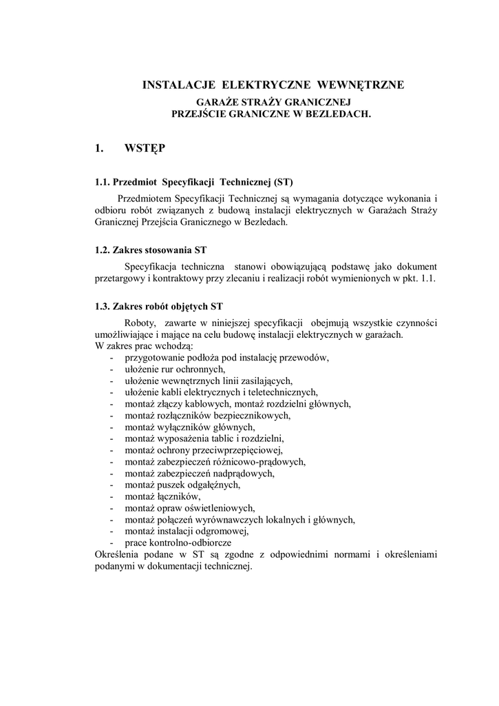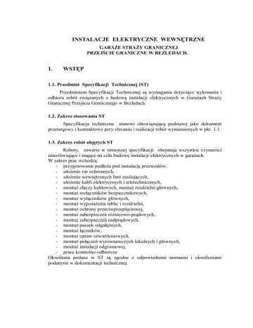 INSTALACJE ELEKTRYCZNE WEWNĘTRZNE GARAŻE STRAŻY GRANICZNEJ PRZEJŚCIE GRANICZNE W BEZLEDACH. 1. WSTĘP 1.1. Przedmiot Specyfikacji Technicznej (ST) Przedmiotem Specyfikacji Technicznej są wymagania dotyczące wykonania i odbioru robót związanych z budową instalacji elektrycznych w Garażach Straży Granicznej Przejścia Granicznego w Bezledach. 1.2. Zakres stosowania ST Specyfikacja techniczna stanowi obowiązującą podstawę jako dokument przetargowy i kontraktowy przy zlecaniu i realizacji robót wymienionych w pkt. 1.1. 1.3. Zakres robót objętych ST Roboty, zawarte w niniejszej specyfikacji obejmują wszystkie czynności umożliwiające i mające na celu budowę instalacji elektrycznych w garażach. W zakres prac wchodzą: - przygotowanie podłoża pod instalację przewodów, - ułożenie rur ochronnych, - ułożenie wewnętrznych linii zasilających, - ułożenie kabli elektrycznych i teletechnicznych, - montaż złączy kablowych, montaż rozdzielni głównych, - montaż rozłączników bezpiecznikowych, - montaż wyłączników głównych, - montaż wyposażenia tablic i rozdzielni, - montaż ochrony przeciwprzepięciowej, - montaż zabezpieczeń różnicowo-prądowych, - montaż zabezpieczeń nadprądowych, - montaż puszek odgałęźnych, - montaż łączników, - montaż opraw oświetleniowych, - montaż połączeń wyrównawczych lokalnych i głównych, - montaż instalacji odgromowej, - prace kontrolno-odbiorcze Określenia podane w ST są zgodne z odpowiednimi normami i określeniami podanymi w dokumentacji technicznej. 1.3.1. Roboty w zakresie wznoszenia kompletnych obiektów budowlanych : KOD CPV 5200000-9 - Roboty w zakresie : instalacji elektrycznych – KOD CPV 45310000-3 instalacje i oprawy elektryczne – KOD CPV 4531000-0 przewodów instal. elektr. – KOD CPV 45311100-1 instal. alarmowe i anteny – KOD CPV 45312000-0 oprawy elektr. – KOD CPV 45311200-2 inst. sprzętu oświetlenia i sygnalizacji – KOD CPV 45316000-5 inne instalacje elektr. – KOD CPV 45317000-2 instalowanie oświetlenia – KOD CPV 45312311-0 instalacyjne roboty elektr. – KOD CPV 45315100-9 instalowanie rozdzielni elektr. – KOD CPV 45315700-5 instalowanie transformatora elektr. – KOD CPV 45317200-4 instalowanie linii telefonicznych – KOD CPV 45314120-8. 1.4. Charakterystyka elementów objętych ST – zagadnienia ogólne Przyłącze – jest to linia elektroenergetyczna łącząca złącze (odbiorcę) z siecią zasilającą. Złącze – z jednej strony jest końcowym elementem sieci zasilającej, zaś z drugiej – początkiem instalacji obiektu budowlanego. Rozdzielnia główna – jest to element instalacji elektrycznej występujący w przypadku, gdy z jednego złącza zasilana jest więcej niż jedna linia zasilającą. W rozdzielnicy głównej usytuowane są zabezpieczenia poszczególnych wewnętrznych linii zasilających. Rozdzielnicę budynku umieszcza się zwykle w pobliżu złącza. Wewnętrzna linia zasilająca (WLZ) – jest to obwód zasilający tablice rozdzielcze (rozdzielnice), z których zasilane są instalacje odbiorcze. Obwód rozdzielczy – jest to obwód zasilający tablice rozdzielcze. W obiektach budowlanych rolę obwodów rozdzielczych pełnią wewnętrzne linie zasilające (WLZ). Obwód odbiorczy (obwód końcowy) – jest to obwód, do którego przyłączone są bezpośrednio odbiorniki energii elektrycznej lub gniazda wtyczkowe. Głównymi elementami obwodu instalacji elektrycznej są przewody (tory prądowe) umożliwiające przesyłanie energii elektrycznej, łączniki umożliwiające załączanie i wyłączanie oraz zabezpieczenia chroniące elementy obwodu przed skutkami zakłóceń. Kable – wyroby składające się z jednej lub większej liczby żył izolowanych, zaopatrzone w powłokę oraz ewentualnie – w zależności od warunków układania i eksploatacji w osłonę i pancerz. Kable przystosowane są do układania bezpośrednio w ziemi, w wodzie lub w kanałach podziemnych, albo też do zawieszania w powietrzu. Przewody – wyroby składające się z jednego lub kilku skręconych drutów albo jednej większej liczby żył izolowanych bez powłoki lub w zależności od warunków, w których mają być zastosowane – zaopatrzone w powłokę niemetalową. Linia kablowa – kabel wielożyłowy lub wiązka kabli jednożyłowych w układzie wielofazowym albo kilka kabli jedno lub wielożyłowych połączonych równolegle łącznie z osprzętem, ułożone na wspólnej trasie i łączące zaciski tych samych dwóch urządzeń elektrycznych jedno lub wielofazowych. Trasa kablowa – pas terenu w którym ułożone są jedna lub więcej linii kablowych. Napięcie znamionowe linii – napięcie międzyprzewodowe, na które linia kablowa została zbudowana. Osprzęt linii kablowej – zbiór elementów przeznaczonych do łączenia, rozgałęzienia lub zakończenia kabli. Przepust kablowy – konstrukcja o przekroju najczęściej okrągłym przeznaczona do ochrony kabla przed uszkodzeniami mechanicznymi, chemicznymi, i działaniem łuku elektrycznego. Dodatkowa ochrona przeciwporażeniowa – ochrona części przewodzących, dostępnych w wypadku pojawienia się na nich napięcia w warunkach zakłóceniowych. Bezpieczniki topikowe – zabezpieczają przed przetężeniami, przede wszystkim przed skutkami zwarć. Na działanie , parametry i jakość bezpiecznika wpływają wszystkie jego części składowe, ale decydujący wpływ mają: topik, gasiwo i korpus wkładki. 2. MATERIAŁY 2.1. Ogólne wymagania Ogólne wymagania dotyczące materiałów technicznej. podano w dokumentacji 2.2. Przewody elektroenergetyczne Typy przewodów stosować zgodnie z dokumentacją techniczną i specyfikacją dokumentacji technicznej. Do wykonania instalacji elektrycznych w budynkach stosować przewody izolowane do układania na stałe. Przewody wielożyłowe przy układaniu wtynkowym stosować w wykonaniu płaskim. Żyły przewodów wielożyłowych muszą posiadać różne