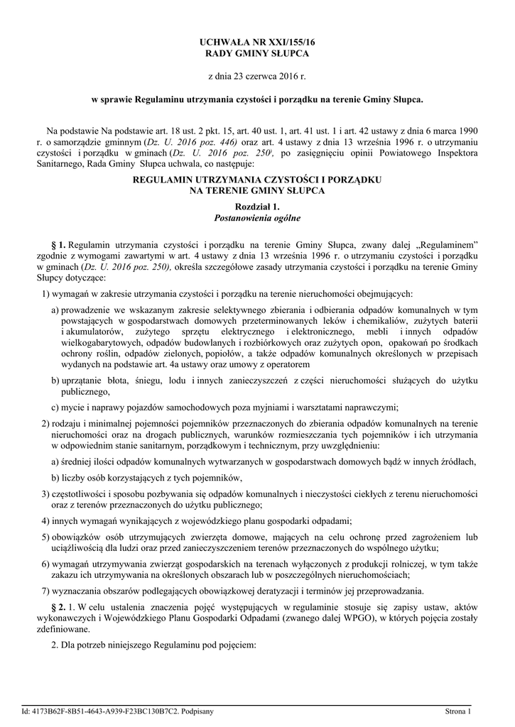 UCHWAŁA NR XXI/155/16 RADY GMINY SŁUPCA z dnia 23 czerwca 2016 r. w sprawie Regulaminu utrzymania czystości i porządku na terenie Gminy Słupca. Na podstawie Na podstawie art. 18 ust. 2 pkt. 15, art. 40 ust. 1, art. 41 ust. 1 i art. 42 ustawy z dnia 6 marca 1990 r. o samorządzie gminnym (Dz. U. 2016 poz. 446) oraz art. 4 ustawy z dnia 13 września 1996 r. o utrzymaniu czystości i porządku w gminach (Dz. U. 2016 poz. 250), po zasięgnięciu opinii Powiatowego Inspektora Sanitarnego, Rada Gminy Słupca uchwala, co następuje: REGULAMIN UTRZYMANIA CZYSTOŚCI I PORZĄDKU NA TERENIE GMINY SŁUPCA Rozdział 1. Postanowienia ogólne § 1. Regulamin utrzymania czystości i porządku na terenie Gminy Słupca, zwany dalej „Regulaminem” zgodnie z wymogami zawartymi w art. 4 ustawy z dnia 13 września 1996 r. o utrzymaniu czystości i porządku w gminach (Dz. U. 2016 poz. 250), określa szczegółowe zasady utrzymania czystości i porządku na terenie Gminy Słupcy dotyczące: 1) wymagań w zakresie utrzymania czystości i porządku na terenie nieruchomości obejmujących: a) prowadzenie we wskazanym zakresie selektywnego zbierania i odbierania odpadów komunalnych w tym powstających w gospodarstwach domowych przeterminowanych leków i chemikaliów, zużytych baterii i akumulatorów, zużytego sprzętu elektrycznego i elektronicznego, mebli i innych odpadów wielkogabarytowych, odpadów budowlanych i rozbiórkowych oraz zużytych opon, opakowań po środkach ochrony roślin, odpadów zielonych, popiołów, a także odpadów komunalnych określonych w przepisach wydanych na podstawie art. 4a ustawy oraz umowy z operatorem b) uprzątanie błota, śniegu, lodu i innych zanieczyszczeń z części nieruchomości służących do użytku publicznego, c) mycie i naprawy pojazdów samochodowych poza myjniami i warsztatami naprawczymi; 2) rodzaju i minimalnej pojemności pojemników przeznaczonych do zbierania odpadów komunalnych na terenie nieruchomości oraz na drogach publicznych, warunków rozmieszczania tych pojemników i ich utrzymania w odpowiednim stanie sanitarnym, porządkowym i technicznym, przy uwzględnieniu: a) średniej ilości odpadów komunalnych wytwarzanych w gospodarstwach domowych bądź w innych źródłach, b) liczby osób korzystających z tych pojemników, 3) częstotliwości i sposobu pozbywania się odpadów komunalnych i nieczystości ciekłych z terenu nieruchomości oraz z terenów przeznaczonych do użytku publicznego; 4) innych wymagań wynikających z wojewódzkiego planu gospodarki odpadami; 5) obowiązków osób utrzymujących zwierzęta domowe, mających na celu ochronę przed zagrożeniem lub uciążliwością dla ludzi oraz przed zanieczyszczeniem terenów przeznaczonych do wspólnego użytku; 6) wymagań utrzymywania zwierząt gospodarskich na terenach wyłączonych z produkcji rolniczej, w tym także zakazu ich utrzymywania na określonych obszarach lub w poszczególnych nieruchomościach; 7) wyznaczania obszarów podlegających obowiązkowej deratyzacji i terminów jej przeprowadzania. § 2. 1. W celu ustalenia znaczenia pojęć występujących w regulaminie stosuje się zapisy ustaw, aktów wykonawczych i Wojewódzkiego Planu Gospodarki Odpadami (zwanego dalej WPGO), w których pojęcia zostały zdefiniowane. 2. Dla potrzeb niniejszego Regulaminu pod pojęciem: Id: 4173B62F-8B51-4643-A939-F23BC130B7C2. Podpisany Strona 1 1) ustawa – należy przez to rozumieć ustawę z dnia 13 września 1996 roku o utrzymaniu czystości i porządku w gminach /tj. Dz. U. z 2016r. poz. 250/; 2) odpady wielkogabarytowe – należy przez to rozumieć jeden ze strumieni odpadów komunalnych wymienionych w art.4 ust.2 pkt 1 lit. a ustawy, charakteryzujący się tym, że jego składniki, ze względu na swoje rozmiary i masę, nie mogą być umieszczone w pojemnikach przeznaczonych do zbierania odpadów komunalnych; 3) umowy – należy przez to rozumieć umowę, o której mowa w art.6 ust.1 ustawy; 4) umowy operatorskiej – należy przez to rozumieć umowy na odbiór lub odbiór i zagospodarowanie odpadów komunalnych zawartą przez Gminę Słupca z przedsiębiorcą, który wygrał przetarg ogłoszony zgodnie z treścią art. 6d ust. 1 ustawy; 5) metody ustalania opłat– należy rozumieć przez nią jeden z przewidzianych w ustawie sposobów opłaty za gospodarowanie odpadami określony w art.6j ust.1 i 2 ustawy; 6) mobilny punkt selektywnego zbierania – pojazd zapewniający zbiórkę selektywnie zbieranych odpadów, 7) harmonogram – należy przez to rozumieć harmonogram odbioru odpadów komunalnych na terenie Gminy określający częstotliwość ich odbierania, o której mowa w art. 4 ust. 2 pkt 3) oraz art. 6r ust. 3 ustawy; 8) przedsiębiorca – należy przez to rozumieć podmiot realizujący zadania w zakresie opróżniania zbiorników bezodpływowych i transportu nieczystości ciekłych prowadzący działalność w zakresie wymienionym w art.7 ust. 1 ustawy, na którą konieczne jest uzyskanie zezwolenia, lub gminna jednostka, która zgodnie z art. 7 ust. 5 ustawy nie ma obowiązku uzyskania zezwolenia; 9) indywidualne konta rozliczeniowe – należy przez to rozumieć prowadzony przez Operatora rejestr właścicieli nieruchomości, w którym na bieżąco rejestrowana jest masa odpadów zmieszanych oraz wyselekcjonowanych i przekazanych operatorowi przez właścicieli nieruchomości; rejestr ten umożliwia realizację obowiązków, o których mowa w art. 6 ust. 4 i art. 6k ust.3 ustawy; 10) operator – rozumie się przez to przedsiębiorcę prowadzącego działalność na podstawie wpisu do rejestru działalności regulowanej (art.9c ustawy), który, zgodnie z zapisami art.6d ust.1 ustawy, na mocy wygranego przetargu podpisał z gminą umowę na odbiór lub odbiór i zagospodarowanie odpadów komunalnych; 11) sezon letni- należy przez to rozumieć okres od 1 maja do 30 września 12) sezon zimowy - należy przez to rozumieć okres od 1 października do 30 kwietn