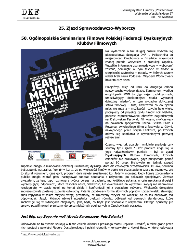 Dyskusyjny Klub Filmowy „Politechnika” Wybrzeże Wyspiańskiego 27 50-370 Wrocław 25. Zjazd Sprawozdawczo-Wyborczy i 50. Ogólnopolskie Seminarium Filmowe Polskiej Federacji Dyskusyjnych Klubów Filmowych Na wydarzenie o tak długiej nazwie wybrała się pięcioosobowa delegacja DKF- u Politechnika do miejscowości Czechowice – Dziedzice, większości znanej przede wszystkim z produkcji zapałek. Wszelkie informacje „sprawozdawczo – wyborcze” zostaną pominięte w tym tekście w trosce o cierpliwość czytelnika – obrady, w których czynny udział brali Paula Podolska i Wojciech Wodo trwały bowiem cały dzień. Przejdźmy, więc od razu do drugiego członu nazwy czechowickiego zjazdu. Seminarium, według encyklopedii PWN to „typ zajęć dydaktycznych, umożliwiający dokładniejsze studia wybranej dziedziny wiedzy”, w tym wypadku dotyczącej sztuki filmowej. I tutaj zastrzeżeń co do zjazdu mieć nie można - możliwości rozwoju było wiele, począwszy od projekcji cyklu filmów noir Melvilla, poprzez zaprezentowanie obrazów nagrodzonych na Krakowskim Festiwalu Filmowym, skończywszy na pokazach specjalnych Enena, Feliksa Falka i Rewersu, zwycięskiego filmu z festiwalu w Gdyni, nakręconego przez Borysa Lankosza, po których odbyły się spotkania z wymienionymi powyżej reżyserami. Czemu, więc tak uparcie i wnikliwie analizuje cały szumny tytuł zjazdu? Otóż problem kryje się w jego najważniejszym punkcie – był to zjazd Dyskusyjnych Klubów Filmowych, których członków nie brakowało, gdyż przyjechało ponoć ponad 90 grup. Brakowało mi jednak czegoś zupełnie innego, a mianowicie ciekawej i kulturalnej dyskusji, która dla czołowych przedstawicieli DKF-ów, powinna być zupełnie naturalna. Pomińmy już to, że po większości filmów w ogóle nie pozostawiono czasu na rozmowy, ale to akurat rozumiem, czas goni, program dnia należy zrealizować itp. Jedyny moment, kiedy licznie zgromadzona publika mogła zabrać głos, następował podczas spotkania z reżyserami po pokazach specjalnych. Zawsze uważałem, że tego typu rozmowa z twórcą polega na zadaniu, mu krótkiego pytania, w celu uzyskania długiej i wyczerpującej odpowiedzi, która zaspokoi naszą ciekawość, lub ewentualnie na wyrażeniu swojej nie nadmiernie rozciągniętej w czasie opinii na temat działa i konfrontacji jej z poglądami reżysera. Większość delegatów zaprezentowała postawę zupełnie odwrotną. Pytania przybierały formę słownych popisów i przechwałek, stawiając znak zapytania w takim miejscu swojej przemowy, że zmieszany reżyser nie wiedział, na co tak naprawdę ma odpowiadać. Język, którego używali uczestnicy dyskusji również odbiegał od pewnych standardów, które zachowuje się w sytuacjach oficjalnych, jaką bądź, co bądź jest spotkanie z reżyserem. Dlatego opuśćmy już sprawy pozafilmowe i przejdźmy do opisu niektórych obejrzanych w Czechowicach obrazów. Jest Bóg, czy Boga nie ma? (Bracia Karamazow, Petr Zelenka) Odpowiedzi na to pytanie szukają w filmie Zelenki aktorzy z praskiego teatru Dejvicke Divadlo1, a także grane przez nich postaci z powieści Fiodora Dostojewskiego i polski robotnik – konserwator z Nowej Huty, w której odbywają 1 http://www.dejvickedivadlo.cz/ www.dkf.pwr.wroc.pl www.dkf.bo.pl Dyskusyjny Klub Filmowy „Politechnika” Wybrzeże Wyspiańskiego 27 50-370 Wrocław się próby przedstawienia. Miejsce spektaklu nie zostało wybrane przypadkowo – Petr Zelenka podkreśla w wywiadach, że tak właśnie wyobraża sobie piekło – jako wielką, industrialną przestrzeń fabryki. Dodatkowego uroku, lub raczej przewrotności pytaniu o istnienie Boga dodaje historia Nowej Huty. Wisława Szymborska w wierszu „Na powitanie budowy socjalistycznego miasta” pisze tak o powstającym, nowohuckim kombinacie: Miasto socjalistyczne miasto dobrego losu. Bez przedmieść i bez zaułków.2 Ciężko jest powstrzymać się od niedokończenia tego fragmentu słowami „i bez Boga”, gdyż takim w planach Stalina miało być to opozycyjne do inteligenckiego Krakowa, robotnicze miasto. Tym marzeniom kres położyły protesty mieszkańców Nowej Huty, przeciw usunięciu z placu Teatralnego krzyża, podczas których wiele osób odniosło ciężkie obrażenia. Jaka więc odpowiedź oferują w Bracia Karamazow na pytanie jest Bóg, czy go nie ma? Otóż widz otrzymuje ich wiele, ale nie da się z nich wysnuć jednej, mocnej i przekonywującej odpowiedzi, takiej jak chociażby ta udzielona przez pijanego Marka Hłaskę, który krzyczał „Jeżeli Bóg istnieje to jest stara, dziadowska kurwa, przecież patrzył bez słowa na Oświęcim, na Hiroszimę, przecież widział jak mordowano miliony niewinnych ludzi.” Dzięki obrazowi Zelenki otrzymujemy coś innego niż odpowiedź na to podstawowe dla człowieka pytanie- możemy zobaczyć jak ludzie zachowują się na Ziemi pod wpływem ideologii ateistycznej i religii. Dowiemy się także co dzieję się z człowiekiem rozdartym między tymi dwiema skrajnymi siłami. A tak na marginesie… to również sporo się pośmiejemy, wzruszymy, a w szczególności jako Polscy widzowie możemy i się oburzyć, kiedy to jeden z aktorów pluje podczas spektaklu na ikonę z wizerunkiem Jana Pawła II. Później w przerwie, mówi „chcesz żeby mnie nigdy do Polski nie wpuścili!” Zelenka spokojnie komentuje3 ten kontrowersyjny moment, mówiąc, że nawet papieża nie powinno się traktować tak strasznie serio. Z pewnością sceny takie jak ta, sprawiają, że film ten nie jest kolejnym „politycznie poprawnym plakatem, który po kilku miesiącach traci sens” jakie w wywiadzie krytykuje odtwórca jednej z głównych ról – Polak Andrzej Mastalerz4. Prochowiec, kapelusz i papieros (cykl filmów Melvilla) Mężczyźni lojalni aż po śmierć, pewni siebie, zadziorni, otoczeni przez kobiety, którym najczęściej okazują wzgardę, a kiedy trzeba wymierzają i mocne policzki. Nie str