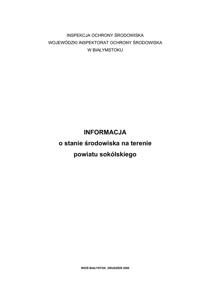 INSPEKCJA OCHRONY ŚRODOWISKA WOJEWÓDZKI INSPEKTORAT OCHRONY ŚRODOWISKA W BIAŁYMSTOKU INFORMACJA o stanie środowiska na terenie powiatu sokólskiego WIOŚ BIAŁYSTOK, GRUDZIEŃ 2006 spis treści 1 DZIAŁALNOŚĆ INSPEKCYJNO – KONTROLNA I BADAWCZA ...................................................3 1.1 1.2 2 POWIETRZE ..............................................................................................................................................4 2.1 2.2 2.3 3 ZAKRES DZIAŁALNOŚCI INSPEKCYJNO-KONTROLNEJ ............................................................................3 MONITORING ŚRODOWISKA ..................................................................................................................3 EMISJA..................................................................................................................................................4 IMISJA ...................................................................................................................................................6 WNIOSKI Z BADAŃ IMISJI ......................................................................................................................7 STAN CZYSTOŚCI WÓD POWIERZCHNIOWYCH...........................................................................7 3.1 3.2 3.3 3.4 3.5 BIEBRZA ............................................................................................................................................9 BRZOZÓWKA..................................................................................................................................10 RZEKA ŁOSOŚNA ................................................................................................................................11 SOKOŁDA............................................................................................................................................12 KRYNKA .............................................................................................................................................13 4 WODY PODZIEMNE ..............................................................................................................................14 5 GOSPODARKA ODPADAMI .................................................................................................................16 5.1 ODPADY NIEBEZPIECZNE ....................................................................................................................17 6 HAŁAS KOMUNIKACYJNY I PRZEMYSŁOWY ..............................................................................20 7 POLA ELEKTROMAGNETYCZNE .....................................................................................................21 8 OCHRONA ŚRODOWISKA PRZED AWARIAMI .............................................................................23 8.1 8.2 9 NIEBEZPIECZNE SUBSTANCJE CHEMICZNE W ZAKŁADACH PRZEMYSŁOWYCH .....................................23 TRANSPORT ........................................................................................................................................24 KONTROLE INTERWENCYJNE .........................................................................................................25 2 Informacja o stanie środowiska na terenie powiatu sokólskiego WIOŚ Białystok 1 Działalność inspekcyjno – kontrolna i badawcza Prawne podstawy funkcjonowania Inspekcji Ochrony Środowiska określono w ustawie z dnia 20 lipca 1991 r., która nałożyła na nią obowiązek: • kontrolowania przestrzegania przepisów prawa o ochronie środowiska przez podmioty gospodarcze, • prowadzenia badania stanu środowiska, • informowania społeczeństwa o wynikach tych badań. Cele działalności inspekcyjno – kontrolnej WIOŚ są corocznie ustalane w planach pracy, tworzonych na podstawie wytycznych Głównego Inspektoratu Ochrony Środowiska, analizy wyników dotychczasowej działalności, propozycji przekazanych przez Marszałka, Wojewodę oraz propozycji zgłaszanych przez organy samorządowe. 1.1 ZAKRES DZIAŁALNOŚCI INSPEKCYJNO-KONTROLNEJ Podstawowym celem kontroli jest wymuszenie na jednostkach organizacyjnych podejmowania działań, które w konsekwencji mają spowodować zmniejszenie ich negatywnego wpływu na środowisko. Inspekcja Ochrony Środowiska zgodnie z przysługującymi kompetencjami może zastosować różnego rodzaju środki dyscyplinujące, między innymi: • • wydać zarządzenia pokontrolne, wydać decyzję wyznaczającą termin usunięcia zaniedbań, a w przypadku stwierdzenia zagrożenia życia lub zdrowia a także znacznych szkód w środowisku, w porozumieniu z Wojewodą, wydać decyzję wstrzymującą działalność zakładu, • • wymierzyć karę pieniężną za naruszanie warunków korzystania ze środowiska, skierować wystąpienia do innych organów administracji państwowej, rządowej i samorządu terytorialnego z wnioskiem o podjęcie działań związanych z ich właściwością, • zastosować karę grzywny (mandat karny), • skierować wniosek do sądu i organów ścigania. W rejestrze obiektów kontrolowanych przez Wojewódzki Inspektorat Ochrony Środowiska w Białymstoku na terenie powiatu sokólskiego znajduje się 85 podmiotów i obiektów gospodarczych mających wpływ na stan środowiska. W okresie od stycznia 2006 r. przeprowadzono kontrole W 32 najbardziej uciążliwych podmiotach i obiektach. w przypadkach stwierdzanych przekroczeń wymierzono kary pieniężne za naruszenie warunków korzystania za środowiska. 1.2 MONITORING ŚRODOWISKA W ramach działalności badawczej główny zakres prac prowadzony jest w oparciu o Program Państwowego Monitoringu Środowiska (PMŚ), którego koordynatorem jest Główny Inspektorat Ochrony Środowiska w Warszawie. System PMŚ składa się z 3 głównych bloków zagadnień: jakość środowiska, emisja oraz oceny i prognozy. 3 Informacja o stanie środowiska na terenie powiatu sokólskiego WIO