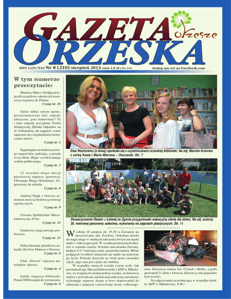 ISSN 1425-7610 Nr 8 (210) sierpień 2013 cena 1,6 zł z 8% VAT Szukaj nas też na Facebook.com W tym numerze przeczytacie: Mateusz Mika z dwójką przyjaciół szczęśliwie zakończyli rowerową wyprawę do Pekinu. Czytaj str. 16 Gdzie oddać zużyte opony, przeterminowane leki, odpady toksyczne, gruz budowlany? Te i inne odpady przyjmuje Punkt Selektywnej Zbiórki Odpadów na ul. Szklarskiej, ale najpierw warto zapoznać się z regulaminem dostarczania śmieci. Czytaj str. 2 Są pieniądze na budowę nowego targowiska, parkingu, a przede wszystkim długo oczekiwanego szaletu publicznego. Czytaj str. 3 Ewa Wachowicz (z lewej) spotkała się z czytelniczkami orzeskiej biblioteki. Na zdj. Mariola Kolonko z córką Kasią i Maria Mierzwa – Owczarek. Str. 7 22 września druga edycja prestiżowej imprezy sportowej: Ulicznego Biegu Orzeskiego. Zapraszamy do udziału. Czytaj str. 8 Andrzej Pająk z Orzesza cenionym znawcą i hodowcą zwierząt egzotycznych. Czytaj str. 9 Orzeska Spółdzielnia Mieszkaniowa ma 20 lat. Czytaj str. 12 Gardawice mają nowego proboszcza. Czytaj str. 11 Dalej zbieramy plastikowe nakrętki dla Gosi Makosz z Orzesza. Czytaj str. 6 Chór „Dzwon” zaprasza miłośników śpiewu. Czytaj str. 4 Zalało magazyn biblioteki. Ponad 1000 książek do wyrzucenia. Czytaj str. 8 Stowarzyszenie Razem = Łatwiej ze Zgonia przygotowało wakacyjną ofertę dla dzieci. Na zdj. autorzy 30. metrowej panoramy sołectwa, wykonanej na zajęciach plastycznych. Str. 11 W sobotę 10 sierpnia ok. 19.30 w Zawadzie na skrzyżowaniu ulic Żorskiej i Szkolnej doszło do tragicznego w skutkach zderzenia dwóch aut marki matiz i volkswagen golf. W wyniku poniesionych obrażeń w szpitalu zmarła 16.letnia mieszkanka Zawady, będąca w 6-7 miesiącu ciąży, pasażerka matiza. Mimo podjętych wysiłków lekarzom nie udało się uratować jej życia. Dziecko przyszło na świat przez cesarskie cięcie, jego stan jest ciężki ale stabilny. W wypadku rannych zostało osiem osób. Jak powiedział asp. Maciej Dobrowolski z KPP w Mikołowie, ze wstępnych ustaleń policji wynika, że kierowca matiza z powodu nie zachowania należytej ostrożności wykonując manewr skrętu w lewo doprowadził do zderzenia z jadącym z przeciwnej strony volkswage- nem. Kierowcą matiza był 19.latek z Bełku, a golfa prowadził 21.latek z Orzesza. Kierowcy obu pojazdów byli trzeźwi. Na zdjęciu matiz uczestniczący w wypadku (źródło: KPP w Mikołowie). /I.W./ Jest regulamin korzystania z PSZOK, czyli Punktu Selektywnej Zbiórki Odpadów Odpady selektywne które chcemy oddać poza terminem wywozu, drobny gruz, albo odpady toksyczne jak zużyte baterie, świetlówki, skoszoną trawę czy przeterminowane lekarstwa, będzie można oddawać do Punktu Selektywnej Zbiórki Odpadów, który gmina utworzyła na ul. Szklarskiej, w niedalekim sąsiedztwie huty szkła. Jednak by śmieci zostały od nas przyjęte, musimy je dostarczyć spakowane – w pojemniki, worki, reklamówki itp. Szczegóły znajdują się w regulaminie, który publikujemy poniżej. Ponadto, nie wolno przywozić ich poza godzi- nami pracy Punktu i podrzucać pod bramą wjazdową, jak zdarzało się w lipcu. Najbardziej bulwersujący był przypadek podrzucenia eternitu w godzinach nocnych. Jak wiadomo azbest wymaga składowania w miejscach specjalnie do tego przeznaczonych, a na pewno nie jest nim PSZOK. Na szczęście pobliski monitoring zarejestrował auto którym przywieziono trefne blachy, więc sprawcę ustalono i ukarano. PSZOK czynny jest: wtorek od 12:00 do 19:00, czwartek od 8:00 do 16:00, sobota od 8:00 do 15:00. Nielegalnie podrzucony eternit. Regulamin Punktu Selektywnej Zbiórki Odpadów w Orzeszu: 1. Regulamin określa zasady przyjmowania odpadów komunalnych przez Punkt Selektywnej Zbiórki Odpadów Komunalnych, zwany dalej „PSZOK”. 2. PSZOK czynny jest w dniach: wtorek od 12:00 do 19:00, czwartek od 8:00 do 16:00,sobota od 8:00 do 15:00. 3. PSZOK przyjmuje nieodpłatnie odpady komunalne wytworzone przez mieszkańców Miasta Orzesze w gospodarstwie domowym. 4. W PSZOK nie są przyjmowane odpady powstające w wyniku prowadzenia działalności gospodarczej. 5. PSZOK dla Miasta Orzesze zlokalizowany jest w Orzeszu przy ulicy Szklarskiej. 6. W PSZOK przyjmowane są następujące frakcje odpadów: • odpady wielkogabarytowe, • zużyty sprzęt elektryczny i elektroniczny, • zużyte baterie i akumulatory, • zużyte opony, (wytworzone w ramach gospodarstwa domowego), • opakowania metalowe, (wytworzone w ramach gospodarstwa domowego), • tworzywa sztuczne, • szkło i szyby okienne, • papier i makulaturę, • opakowania wielomateriałowe, • odpady remontowo-budowlane do 0,5 m3 jednorazowo, nie więcej niż 2 m3/ rok na osobę, • styropian, • bioodpady, • odpady zielone z pielęgnacji ogrodów, • odpady niebezpieczne umieszczone w szczelnych pojemnikach: 2 – chemikalia, rozpuszczalniki, kwasy, alkalia, odczynniki fotograficzne, przeterminowane leki, – Środki ochrony roślin I i II klasy toksyczności (bardzo toksyczne i toksyczne, np. herbicydy, insektycydy), opryski, nawozy itp.; – Lampy fluorescencyjne i inne odpady zawierające rtęć np.: termometry, świetlówki, żarówki energooszczędne itp; – Urządzenia zawierające freony np.: lodówki, zamrażarki, klimatyzatory itp; – Oleje i tłuszcze inne niż wymienione w ((20 01 25 )* np.: smary, przepracowane oleje za wyjątkiem spożywczych itp; – Farby, tłuszcze, farby drukarskie, kleje, lepiszcze i żywice zawierające substancje niebezpieczne; – Detergenty zawierające substancje niebezpieczne np.: środki czyszczące i dezynfekujące zawierające poniższe oznaczenia; – Baterie i akumulatory łącznie z bateriami i akumulatorami wymienionymi w (1606 01, 16 06 02, 16 06 03)* oraz niesortowane baterie i akumulatory zawierające te baterie np.: akumulatory samochodowe, baterie używane w gospodarstwach domowych, baterie z telefonów komórkowych; – 