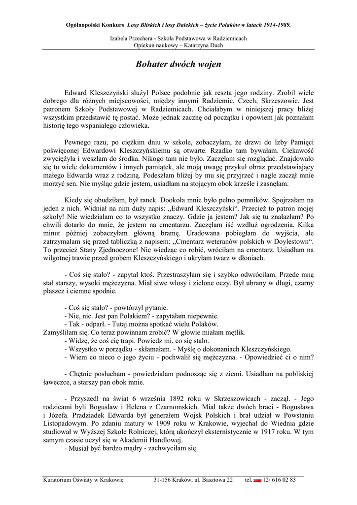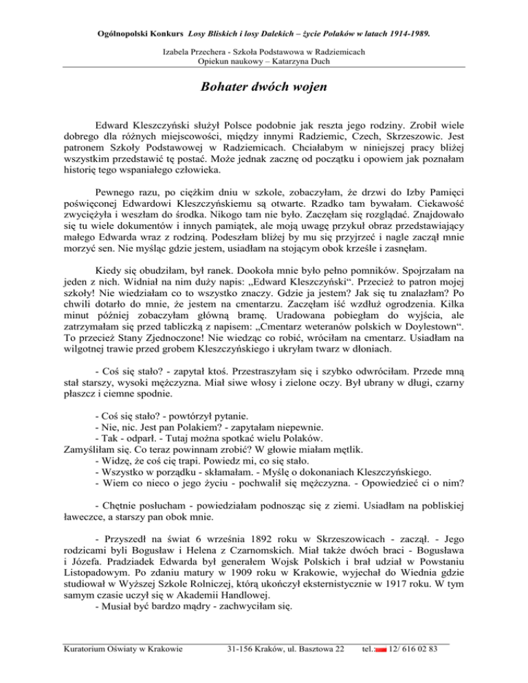 Ogólnopolski Konkurs Losy Bliskich i losy Dalekich – Ŝycie Polaków w latach 1914-1989. Izabela Przechera - Szkoła Podstawowa w Radziemicach Opiekun naukowy – Katarzyna Duch Bohater dwóch wojen Edward Kleszczyński słuŜył Polsce podobnie jak reszta jego rodziny. Zrobił wiele dobrego dla róŜnych miejscowości, między innymi Radziemic, Czech, Skrzeszowic. Jest patronem Szkoły Podstawowej w Radziemicach. Chciałabym w niniejszej pracy bliŜej wszystkim przedstawić tę postać. MoŜe jednak zacznę od początku i opowiem jak poznałam historię tego wspaniałego człowieka. Pewnego razu, po cięŜkim dniu w szkole, zobaczyłam, Ŝe drzwi do Izby Pamięci poświęconej Edwardowi Kleszczyńskiemu są otwarte. Rzadko tam bywałam. Ciekawość zwycięŜyła i weszłam do środka. Nikogo tam nie było. Zaczęłam się rozglądać. Znajdowało się tu wiele dokumentów i innych pamiątek, ale moją uwagę przykuł obraz przedstawiający małego Edwarda wraz z rodziną. Podeszłam bliŜej by mu się przyjrzeć i nagle zaczął mnie morzyć sen. Nie myśląc gdzie jestem, usiadłam na stojącym obok krześle i zasnęłam. Kiedy się obudziłam, był ranek. Dookoła mnie było pełno pomników. Spojrzałam na jeden z nich. Widniał na nim duŜy napis: „Edward Kleszczyński“. PrzecieŜ to patron mojej szkoły! Nie wiedziałam co to wszystko znaczy. Gdzie ja jestem? Jak się tu znalazłam? Po chwili dotarło do mnie, Ŝe jestem na cmentarzu. Zaczęłam iść wzdłuŜ ogrodzenia. Kilka minut później zobaczyłam główną bramę. Uradowana pobiegłam do wyjścia, ale zatrzymałam się przed tabliczką z napisem: „Cmentarz weteranów polskich w Doylestown“. To przecieŜ Stany Zjednoczone! Nie wiedząc co robić, wróciłam na cmentarz. Usiadłam na wilgotnej trawie przed grobem Kleszczyńskiego i ukryłam twarz w dłoniach. - Coś się stało? - zapytał ktoś. Przestraszyłam się i szybko odwróciłam. Przede mną stał starszy, wysoki męŜczyzna. Miał siwe włosy i zielone oczy. Był ubrany w długi, czarny płaszcz i ciemne spodnie. - Coś się stało? - powtórzył pytanie. - Nie, nic. Jest pan Polakiem? - zapytałam niepewnie. - Tak - odparł. - Tutaj moŜna spotkać wielu Polaków. Zamyśliłam się. Co teraz powinnam zrobić? W głowie miałam mętlik. - Widzę, Ŝe coś cię trapi. Powiedz mi, co się stało. - Wszystko w porządku - skłamałam. - Myślę o dokonaniach Kleszczyńskiego. - Wiem co nieco o jego Ŝyciu - pochwalił się męŜczyzna. - Opowiedzieć ci o nim? - Chętnie posłucham - powiedziałam podnosząc się z ziemi. Usiadłam na pobliskiej ławeczce, a starszy pan obok mnie. - Przyszedł na świat 6 września 1892 roku w Skrzeszowicach - zaczął. - Jego rodzicami byli Bogusław i Helena z Czarnomskich. Miał takŜe dwóch braci - Bogusława i Józefa. Pradziadek Edwarda był generałem Wojsk Polskich i brał udział w Powstaniu Listopadowym. Po zdaniu matury w 1909 roku w Krakowie, wyjechał do Wiednia gdzie studiował w WyŜszej Szkole Rolniczej, którą ukończył eksternistycznie w 1917 roku. W tym samym czasie uczył się w Akademii Handlowej. - Musiał być bardzo mądry - zachwyciłam się. Kuratorium Oświaty w Krakowie 31-156 Kraków, ul. Basztowa 22 tel.: 12/ 616 02 83 Ogólnopolski Konkurs Losy Bliskich i losy Dalekich – Ŝycie Polaków w latach 1914-1989. Izabela Przechera - Szkoła Podstawowa w Radziemicach Opiekun naukowy – Katarzyna Duch - Oczywiście - odrzekł. - Był doskonałym gospodarzem, ale takŜe patriotą. Jeszcze podczas nauki w sierpniu 1914 roku dołączył do pierwszego patrolu strzeleckiego Władysława Beliny – PraŜmowskiego. - Czy miał jakiś pseudonim? - zapytałam. - Zwany był „Dziki“, a takŜe „Miechowitą“. Pod tym pierwszym pseudonimem walczył w plutonie jazdy, który przekształcił się w szwadron i dywizjon, a jesienią 1915 roku w Pierwszy Pułk Ułanów Legionów Polskich. W 1916 roku awansował do stopnia porucznika. SłuŜył w tym pułku do lipca 1917 roku. - To aŜ 3 lata... Co było dalej? - zaciekawiłam się. - Widzę, Ŝe podoba ci się moja opowieść - zaśmiał się starszy pan - W tym samym roku został pojmany przez Austriaków i był więziony w Przemyślu. Po wyjściu na wolność działał na rzecz Polskiej Organizacji Wojskowej, w 1918 roku pomagał w akcji rozbrajania wojska i Ŝandarmerii austriackiej, następnie słuŜył w Wojsku Polskim, był współtwórcą Jedenastego Pułku Ułanów Legionowych. - Pewnie bardzo kochał ojczyznę. Tyle dobrego zrobił dla Polski - powiedziałam. - To dopiero początek jego długiej listy zasług - odrzekł męŜczyzna. - Wkrótce potem, 19 marca 1919 roku generał broni Tadeusz Rozwadowski nadał mu we Lwowie Dyplom Odznaki Honorowej „ORLĘTA“ za przyjście z odsieczą na czele szwadronu kawalerii, który zorganizował na terenie powiatu miechowskiego. Miesiąc później jako dowódca I szwadronu razem z całym Jedenastym Pułkiem bronił Wilno przed Bolszewikami, ale został zraniony na rynku Wileńskim. Od 1 do 14 września walczył o rzekę Dźwinę, a do 20 października przebywał na linii demarkacyjnej polsko - litewskiej. Od 15 maja 1920 roku walczył w miejscowościach: Głębokie, Przedbrodzie, Tyszki i Nowe Kruki, a takŜe w rejonie Kowalszczyzny. - Sporo pan wie na temat jego Ŝycia. Kim pan jest? - zdziwiłam się. - To niewaŜne. Mogę ci jeszcze duŜo opowiedzieć. - Bardzo chętnie posłucham - powiedziałam spoglądając w górę. Słońce było wysoko na niebie. - Następnie pułk walczył na froncie ukraińskim. Tam Kleszczyński wyróŜnił się w wielu walkach. Podczas potyczki pod Sieniawką, jako rotmistrz, objął dowodzenie nad pułkiem. Awansował do stopnia majora, ze starszeństwem od 1 czerwca 1919 roku. Dwa lata później przeszedł do rezerwy. Odtąd gospodarował w Radziemicach. W roku 1923 razem ze swymi braćmi załoŜył spółkę hodowli i uprawy roślin, która przyczyniła się do wzrostu świa