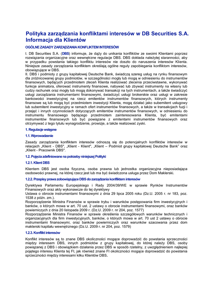Polityka zarządzania konfliktami interesów w DB Securities S.A. Informacja dla Klientów OGÓLNE ZASADY ZARZĄDZANIA KONFLIKTEM INTERESÓW I. DB Securities S.A. (DBS) informuje, że dąży do unikania konfliktów ze swoimi Klientami poprzez rozwiązania organizacyjne oraz wewnętrzne regulacje DBS. DBS dokłada należytej staranności, aby w przypadku powstania takiego konfliktu interesów nie doszło do naruszenia interesów Klienta. Niniejsze zasady zarządzania konfliktem określają ogólne reguły zapobiegania konfliktom interesów, obowiązujące w DBS. II. DBS i podmioty z grupy kapitałowej Deutsche Bank, świadczą szereg usług na rynku finansowym dla zróżnicowanej grupy podmiotów, w szczególności mogły lub mogą w odniesieniu do instrumentów finansowych, będących przedmiotem zleceń Klienta realizować zlecenia przeciwstawne, wykonywać funkcje animatora, oferować instrumenty finansowe, nabywać lub zbywać instrumenty na własny lub cudzy rachunek oraz mogły lub mogą dokonywać transakcji na tych instrumentach, a także świadczyć usługi zarządzania instrumentami finansowymi, świadczyć usługi brokerskie oraz usługi w zakresie bankowości inwestycyjnej na rzecz emitentów instrumentów finansowych, których instrumenty finansowe są lub mogą być przedmiotem inwestycji Klienta, mogą działać jako subemitent usługowy lub subemitent inwestycyjny w ramach ofert instrumentów finansowych, a także w transakcjach fuzji i przejęć i innych czynnościach dotyczących emitentów instrumentów finansowych, w odniesieniu do instrumentu finansowego będącego przedmiotem zainteresowania Klienta, być emitentami instrumentów finansowych lub być powiązane z emitentami instrumentów finansowych oraz otrzymywać z tego tytułu wynagrodzenie, prowizje, a także realizować zyski. 1. Regulacje wstępne 1.1. Wprowadzenie Zasady zarządzania konfliktem interesów odnoszą się do potencjalnych konfliktów interesów w relacjach „Klient - DBS", „Klient - Klient", „Klient – Podmiot grupy kapitałowej Deutsche Bank” oraz „Klient - Pracownik DBS". 1.2. Pojęcia zdefiniowane na potrzeby niniejszej Polityki 1.2.1. Klient DBS Klientem DBS jest osoba fizyczna, osoba prawna lub jednostka organizacyjna nieposiadająca osobowości prawnej, na której rzecz jest lub ma być świadczona usługa przez Dom Maklerski. 1.2.2. Przepisy prawa zobowiązujące DBS do zarządzania konfliktem interesów Dyrektywa Parlamentu Europejskiego i Rady 2004/39/WE w sprawie Rynków Instrumentów Finansowych oraz akty wykonawcze do tej dyrektywy Ustawa o obrocie instrumentami finansowymi z dnia 29 lipca 2005 roku (Dz.U. 2005 r. nr 183, poz. 1538 z późn. zm.). Rozporządzenie Ministra Finansów w sprawie trybu i warunków postępowania firm inwestycyjnych i banków, o których mowa w art. 70 ust. 2 ustawy o obrocie instrumentami finansowymi, oraz banków powierniczych z dnia 20 listopada 2009 r. (Dz.U. 2009 r. nr 204, poz. 1577) Rozporządzenie Ministra Finansów w sprawie określenia szczegółowych warunków technicznych i organizacyjnych dla firm inwestycyjnych, banków, o których mowa w art. 70 ust 2 ustawy o obrocie instrumentami finansowymi, oraz banków powierniczych oraz warunków szacowania przez dom maklerski kapitału wewnętrznego (Dz.U. 2009 r. nr 204, poz. 1579) 1.2.3. Konflikt interesów Konflikt interesów są to znane DBS okoliczności mogące doprowadzić do powstania sprzeczności między interesem DBS, innych podmiotów z grupy kapitałowej, do której należy DBS, osoby powiązanej z DBS i obowiązkiem działania przez DBS w sposób rzetelny, z uwzględnieniem najlepiej pojętego interesu Klienta tej FI, jak również znane FI okoliczności mogące doprowadzić do powstania sprzeczności między interesami kilku Klientów DBS. 1.3. Zarządzanie konfliktem interesów DBS realizuje zarządzanie konfliktem interesów w trzech etapach. Pierwszy etap zakłada generalne unikanie sytuacji mogących grozić potencjalnym konfliktem. Drugi etap to podejmowane przez DBS działania organizacyjne, które w sposób zinstytucjonalizowany zapobiegają powstawaniu konfliktu interesów. Jeżeli te dwa etapy nie pozwalają skutecznie wyeliminować ryzyka konfliktu interesów, trzecim etapem jest ujawnienie ryzyka w konkretnym przypadku konfliktu interesów Klientowi i uzależnienie dalszego działania DBS od decyzji Klienta. 2. Ogólne środki organizacyjne i wewnętrzne regulacje, służące do zapobiegania konfliktowi interesów W Domu Maklerskim obowiązują regulacje, które służą aktywnemu zarządzaniu konfliktami interesów. Do regulacji tych należą w szczególności: 1) Regulamin Organizacyjny DBS, określający zakres i podział kompetencji poszczególnych jednostek organizacyjnych DBS, 2) Regulamin kontroli przepływu informacji poufnych oraz stanowiących tajemnicę zawodową w DBS, 3) Regulamin inwestowania na własny rachunek przez pracowników, członków zarządu i rady nadzorczej DBS. 2.1. Wewnętrzne regulacje DBS wprowadził zasady, które na szczeblu organizacyjnym przeciwdziałają manipulacji oraz wykorzystaniu informacji poufnych. Środkiem organizacyjnym jest w szczególności stworzenie "chińskich murów", czyli barier informacyjnych, które uniemożliwiają niekontrolowany przepływ informacji pomiędzy poszczególnymi jednostkami organizacyjnymi lub pracownikami DBS, prowadzenie Listy Obserwacyjnej oraz Listy Restrykcyjnej. „Chińskimi murami” rozdzielone są poszczególne jednostki organizacyjne DBS wydzielone zgodnie z Regulaminem Organizacyjnym. Jeśli istnieje uzasadnione ryzyko powstania konfliktu interesów to „chińskie mury” tworzone są również, w związku z realizacją określonego projektu na rzecz Klienta, przez Członka Zarządu bądź Project Managera spośród pracowników DBS zaangażowanych w dany projekt. 2.2. Rekomendacje i analizy DBS podjął odpowiednie działania i środki organizacyjne, które służą przeciwdziałaniu