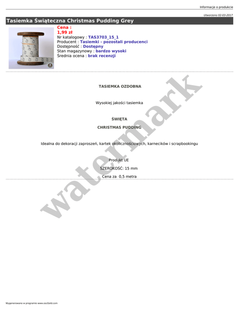 Informacje o produkcie Utworzono 02-03-2017 Tasiemka Świąteczna Christmas Pudding Grey Cena : 1,99 zł Nr katalogowy : TAS3703_15_1 Producent : Tasiemki - pozostali producenci Dostępność : Dostępny Stan magazynowy : bardzo wysoki Średnia ocena : brak recenzji er m ar k TASIEMKA OZDOBNA Wysokiej jakości tasiemka ŚWIĘTA CHRISTMAS PUDDING Idealna do dekoracji zaproszeń, kartek okolicznościowych, karnecików i scrapbookingu Produkt UE SZEROKOŚĆ: 15 mm w at Cena za 0,5 metra Wygenerowano w programie www.oscGold.com