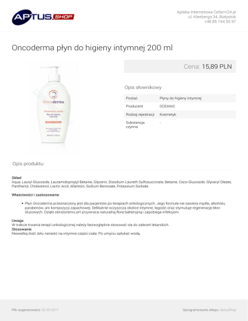 Apteka Internetowa Cefarm24.pl ul. Kleeberga 34, Białystok +48 85 744 55 97 Oncoderma płyn do higieny intymnej 200 ml Cena: 15,89 PLN Opis słownikowy Postać Płyny do higieny intymnej Producent OCEANIC Rodzaj rejestracji Kosmetyk Substancja czynna - Opis produktu Skład Aqua, Lauryl Glucoside, Lauramidopropyl Betaine, Glycerin, Disodium Laureth Sulfosuccinate, Betaine, Coco-Glucoside, Glyceryl Oleate, Panthenol, Cholesterol, Lactic Acid, Allantoin, Sodium Benzoate, Potassium Sorbate. Właściwości i zastosowanie Płyn Oncoderma przeznaczony jest dla pacjentów po terapiach onkologicznych. Jego formuła nie zawiera mydła, alkoholu, parabenów, ani kompozycji zapachowej. Delikatnie oczyszcza okolice intymne, łagodzi oraz stymuluje regenerację błon śluzowych. Dzięki obniżonemu pH przywraca naturalną florę bakteryjną i zapobiega infekcjom. Uwaga W trakcie trwania terapii onkologicznej należy bezwzględnie stosować się do zaleceń lekarskich. Stosowanie Niewielką ilość żelu nanieść na intymne części ciała. Po umyciu spłukać wodą. Plik wygenerowano: 02-03-2017 Powered by TCPDF (www.tcpdf.org) Oprogramowanie sklepu: AptusShop