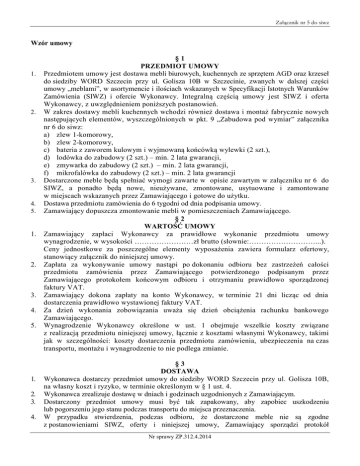 Załącznik nr 5 do siwz Wzór umowy 1. 2. 3. 4. 5. 1. 2. 3. 4. 5. 1. 2. 3. 4. §1 PRZEDMIOT UMOWY Przedmiotem umowy jest dostawa mebli biurowych, kuchennych ze sprzętem AGD oraz krzeseł do siedziby WORD Szczecin przy ul. Golisza 10B w Szczecinie, zwanych w dalszej części umowy „meblami”, w asortymencie i ilościach wskazanych w Specyfikacji Istotnych Warunków Zamówienia (SIWZ) i ofercie Wykonawcy. Integralną częścią umowy jest SIWZ i oferta Wykonawcy, z uwzględnieniem poniższych postanowień. W zakres dostawy mebli kuchennych wchodzi również dostawa i montaż fabrycznie nowych następujących elementów, wyszczególnionych w pkt. 9 „Zabudowa pod wymiar” załącznika nr 6 do siwz: a) zlew 1-komorowy, b) zlew 2-komorowy, c) bateria z zaworem kulowym i wyjmowaną końcówką wylewki (2 szt.), d) lodówka do zabudowy (2 szt.) – min. 2 lata gwarancji, e) zmywarka do zabudowy (2 szt.) – min. 2 lata gwarancji, f) mikrofalówka do zabudowy (2 szt.) – min. 2 lata gwarancji Dostarczone meble będą spełniać wymogi zawarte w opisie zawartym w załączniku nr 6 do SIWZ, a ponadto będą nowe, nieużywane, zmontowane, usytuowane i zamontowane w miejscach wskazanych przez Zamawiającego i gotowe do użytku. Dostawa przedmiotu zamówienia do 6 tygodni od dnia podpisania umowy. Zamawiający dopuszcza zmontowanie mebli w pomieszczeniach Zamawiającego. §2 WARTOŚĆ UMOWY Zamawiający zapłaci Wykonawcy za prawidłowe wykonanie przedmiotu umowy wynagrodzenie, w wysokości ……………………zł brutto (słownie:………………………...). Ceny jednostkowe za poszczególne elementy wyposażenia zawiera formularz ofertowy, stanowiący załącznik do niniejszej umowy. Zapłata za wykonywanie umowy nastąpi po dokonaniu odbioru bez zastrzeżeń całości przedmiotu zamówienia przez Zamawiającego potwierdzonego podpisanym przez Zamawiającego protokołem końcowym odbioru i otrzymaniu prawidłowo sporządzonej faktury VAT. Zamawiający dokona zapłaty na konto Wykonawcy, w terminie 21 dni licząc od dnia dostarczenia prawidłowo wystawionej faktury VAT. Za dzień wykonania zobowiązania uważa się dzień obciążenia rachunku bankowego Zamawiającego. Wynagrodzenie Wykonawcy określone w ust. 1 obejmuje wszelkie koszty związane z realizacją przedmiotu niniejszej umowy, łącznie z kosztami własnymi Wykonawcy, takimi jak w szczególności: koszty dostarczenia przedmiotu zamówienia, ubezpieczenia na czas transportu, montażu i wynagrodzenie to nie podlega zmianie. §3 DOSTAWA Wykonawca dostarczy przedmiot umowy do siedziby WORD Szczecin przy ul. Golisza 10B, na własny koszt i ryzyko, w terminie określonym w § 1 ust. 4. Wykonawca zrealizuje dostawę w dniach i godzinach uzgodnionych z Zamawiającym. Dostarczony przedmiot umowy musi być tak zapakowany, aby zapobiec uszkodzeniu lub pogorszeniu jego stanu podczas transportu do miejsca przeznaczenia. W przypadku stwierdzenia, podczas odbioru, że dostarczone meble nie są zgodne z postanowieniami SIWZ, oferty i niniejszej umowy, Zamawiający sporządzi protokół Nr sprawy ZP.312.4.2014 Załącznik nr 5 do siwz niezgodności. Wykonawca niezwłocznie dokona wymiany na własny koszt zakwestionowanych mebli biurowych na meble wolne od wad. 1. 2. 3. 4. 5. 6. 1. 2. 3. 4. 5. §4 GWARANCJA Meble i krzesła objęte są gwarancją na okres ……….. miesięcy zgodny ze złożoną ofertą, stanowiącą załącznik do umowy. Okres gwarancji liczy się od dnia podpisania protokołu odbioru całości przedmiotu umowy. Jeżeli w okresie gwarancji meble lub krzesła okażą się wadliwe, Wykonawca zobowiązuje się do ich naprawienia lub, gdy naprawa okaże się niemożliwa, do ich wymiany na nowe, wolne od wad. Okres gwarancji ulega automatycznemu przedłużeniu o okres naprawy, tj. czas liczony od zgłoszenia do usunięcia usterki. Transport mebli i krzeseł do miejsca lokalizacji serwisu i z powrotem, dostarczenie naprawionych lub nowych części mebli, krzeseł w okresie gwarancji odbywać się będzie na koszt i ryzyko Wykonawcy. W przypadku gdy Wykonawca nie wypełni warunków gwarancji lub wypełni je w sposób nienależyty, Zamawiający jest uprawniony do usunięcia wad w drodze naprawy na ryzyko i koszt Wykonawcy, zachowując przy tym inne uprawnienia przysługujące mu na podstawie niniejszej umowy. Za wady mebli i krzeseł Wykonawca ponosi także odpowiedzialność z tytułu rękojmi na zasadach określonych w kodeksie cywilnym, przy czym okres rękojmi wynosi 48 miesięcy licząc od dnia podpisania protokołu odbioru całości przedmiotu umowy. §5 KARY UMOWNE Ustala się odpowiedzialność Wykonawcy za niewykonanie lub nienależyte wykonanie umowy przez zapłatę kar pieniężnych: a) w przypadku niewykonania umowy przez Wykonawcę lub odstąpienia od umowy w całości lub w części przez Zamawiającego z przyczyn leżących po stronie Wykonawcy lub odstąpienie Wykonawcy od umowy bez winy Zamawiającego, Wykonawca zapłaci Zamawiającemu karę umowną w wysokości 10% wynagrodzenia netto za meble, których dotyczyć będzie niewykonanie lub odstąpienie od umowy; b) w przypadku stwierdzenia nienależytego wykonania umowy Wykonawca zapłaci Zamawiającemu karę umowną w wysokości 10% wynagrodzenia netto za meble, których dotyczyć będzie nienależyte wykonanie umowy; c) w przypadku niewykonania umowy w terminie, o którym mowa w § 1 ust. 4, lub nieusunięcia we wskazanym przez Zamawiającego terminie stwierdzonych wad lub niezgodności, Wykonawca zapłaci Zamawiającemu karę umowną, w wysokości 0,5% wynagrodzenia netto za przedmiot umowy, których dotyczyć będzie zwłoka, za każdy dzień zwłoki. Wykonawca wyraża zgodę na potrącanie kar umownych z wynagrodzenia przysługującego Wykonawcy w związku z realizacją niniejszej umowy. Niezależnie od naliczenia kar umownych, o których mowa w ust. 1, w przypadku nienależytego wykonania umowy Zamawiający ma prawo odmówić przyjęcia dostawy i odstąpi