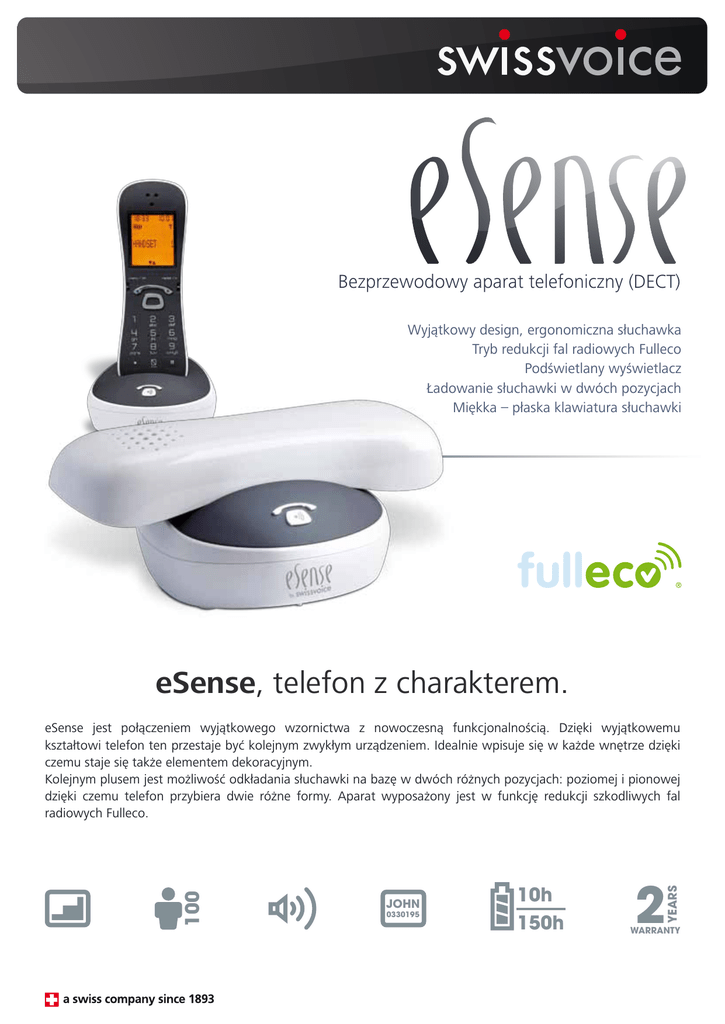 Bezprzewodowy aparat telefoniczny (DECT) Wyjątkowy design, ergonomiczna słuchawka Tryb redukcji fal radiowych Fulleco Podświetlany wyświetlacz Ładowanie słuchawki w dwóch pozycjach Miękka – płaska klawiatura słuchawki eSense, telefon z charakterem. JOHN 0330195 10h 150h 2 YEARS 100 eSense jest połączeniem wyjątkowego wzornictwa z nowoczesną funkcjonalnością. Dzięki wyjątkowemu kształtowi telefon ten przestaje być kolejnym zwykłym urządzeniem. Idealnie wpisuje się w każde wnętrze dzięki czemu staje się także elementem dekoracyjnym. Kolejnym plusem jest możliwość odkładania słuchawki na bazę w dwóch różnych pozycjach: poziomej i pionowej dzięki czemu telefon przybiera dwie różne formy. Aparat wyposażony jest w funkcję redukcji szkodliwych fal radiowych Fulleco. WARRANTY Bezprzewodowy aparat telefoniczny (DECT) Główne cechy Wyświetlacz Tryb głośnomówiący Fulleco monochromatyczny, podświetlany, 1.8 cala w słuchawce redukcja oddziaływania fal radiowych, zmniejszony pobór energii Cechy dodatkowe Alarm Głośność Melodie Blokada Dyskrecja Przyjmowanie połączenia Ładowanie Nazwy Przywołanie funkcja budzika i przypomnienia regulowana głośność rozmowy i trybu głośnomówiącego (5 poziomów) 10 melodii HiFi, możliwość wyciszenia i regulacji głośności zabezpieczenie klawiatury przed przypadkowym wciśnięciem możliwość wyciszenia mikrofonu poprzez podniesienie słuchawki z widełek lub poprzez klawisz dwa sposoby ładowania: poziomy i pionowy nadawanie własnych nazw słuchawkom klawisz przywołania słuchawki na bazie (funkcja lokalizacji) Książka telefoniczna i listy połączeń Książka telefoniczna CLIP/CNIP Ponowny wybór Czas połączeń Wybieranie Połączenia wewnętrzne Konferencja na 100 wpisów prezentacja numeru i nazwy dzwoniącego* lista ostatnio wybieranych numerów (10) czas trwania rozmowy widoczny na wyświetlaczu wprowadzanie numeru przed uzyskaniem sygnału między słuchawkami, przełączanie rozmów możliwość konferencji, 2 wewnętrzne – 1 zewnętrzny Dane sieciowe Typ sieci Tryb wybierania telefon przeznaczony na sieć analogową pulsowy i tonowy Dane techniczne Rozbudowa Energia Standard Akumulator Czas rozmów Zasięg Gwarancja do 5 słuchawek, do 4 baz niskie zużycie energii, funkcja Fulleco linie PSTN, DECT/GAP Lithium-ion (3.7 V, 550 mAh) do 10 godzin rozmowy, do 120 godzin czuwania na otwartej przestrzeni do 300 m, wewnątrz do 50 m 2 lata, różne języki Menu Dane logistyczne** Kod produktu eSense White FR eSense White CH eSense White EE eSense White DE eSense White HK/SG 20406256 20406257 20406286 20406258 20406259 Kolor Czarny/Biały Czarny/Biały Czarny/Biały Czarny/Biały Czarny/Biały EAN 7611425120841 7611425992561 7611425992585 7611425013310 7611425240051 Nazwa produktu eSense Opakowanie 10 szt./karton Wymiary opakowania 339 x 306 x 230 mm Wymiary produktu 200 x 144 x 63 mm * Jeżeli operator telefoniczny oferuje taką usługę ** Dostępność produktu w zależności od kraju Twój partner sprzedaży: swissvoice SA Chemin des Mûriers 1 CH-1170 Aubonne Tel : +41 21 821 39 39 Fax : +41 21 808 39 35 [email protected] www.swissvoice.net Zastrzegamy możliwość zmian / Dostępność produktu w zależności od kraju.