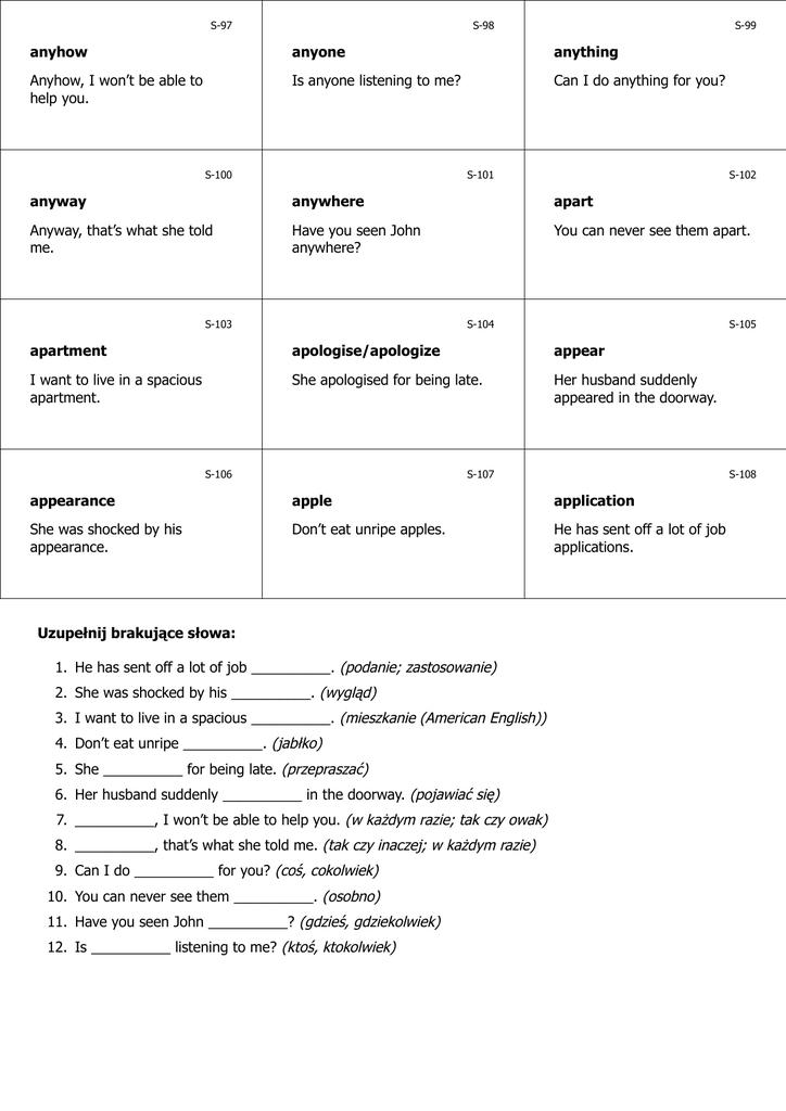S-97 S-98 S-99 anyhow anyone anything Anyhow, I won’t be able to help you. Is anyone listening to me? Can I do anything for you? S-100 S-101 S-102 anyway anywhere apart Anyway, that’s what she told me. Have you seen John anywhere? You can never see them apart. S-103 S-104 S-105 apartment apologise/apologize appear I want to live in a spacious apartment. She apologised for being late. Her husband suddenly appeared in the doorway. S-106 S-107 S-108 appearance apple application She was shocked by his appearance. Don’t eat unripe apples. He has sent off a lot of job applications. Uzupełnij brakujące słowa: 1. He has sent off a lot of job __________. (podanie; zastosowanie) 2. She was shocked by his __________. (wygląd) 3. I want to live in a spacious __________. (mieszkanie (American English)) 4. Don’t eat unripe __________. (jabłko) 5. She __________ for being late. (przepraszać) 6. Her husband suddenly __________ in the doorway. (pojawiać się) 7. __________, I won’t be able to help you. (w każdym razie; tak czy owak) 8. __________, that’s what she told me. (tak czy inaczej; w każdym razie) 9. Can I do __________ for you? (coś, cokolwiek) 10. You can never see them __________. (osobno) 11. Have you seen John __________? (gdzieś, gdziekolwiek) 12. Is __________ listening to me? (ktoś, ktokolwiek) S-99 S-98 coś, cokolwiek ktoś, ktokolwiek Czy mogę coś dla ciebie zrobić? Czy ktoś mnie słucha? S-97 w każdym razie; tak czy owak Tak czy owak, nie będę mógł ci pomóc. www.isel.edu.pl www.isel.edu.pl www.isel.edu.pl S-102 S-101 S-100 osobno gdzieś, gdziekolwiek Nigdy nie zobaczysz ich osobno. Widziałeś gdzieś Johna? tak czy inaczej; w każdym razie W każdym razie tak mi powiedziała. www.isel.edu.pl www.isel.edu.pl www.isel.edu.pl S-105 S-104 S-103 pojawiać się przepraszać Jej mąż nagle pojawił się w drzwiach. Przeprosiła za spóźnienie. mieszkanie (American English) Chcę mieszkać w przestronnym mieszkaniu. www.isel.edu.pl www.isel.edu.pl www.isel.edu.pl S-108 S-107 S-106 podanie; zastosowanie jabłko wygląd Wysłał wiele podań o pracę. Nie jedz niedojrzałych jabłek. Była zaszokowana jego wyglądem. www.isel.edu.pl Odpowiedzi: 1. applications 2. appearance 3. apartment 4. apples 5. apologised 6. appeared 7. Anyhow 8. Anyway 9. anything 10. apart 11. anywhere 12. anyone www.isel.edu.pl www.isel.edu.pl