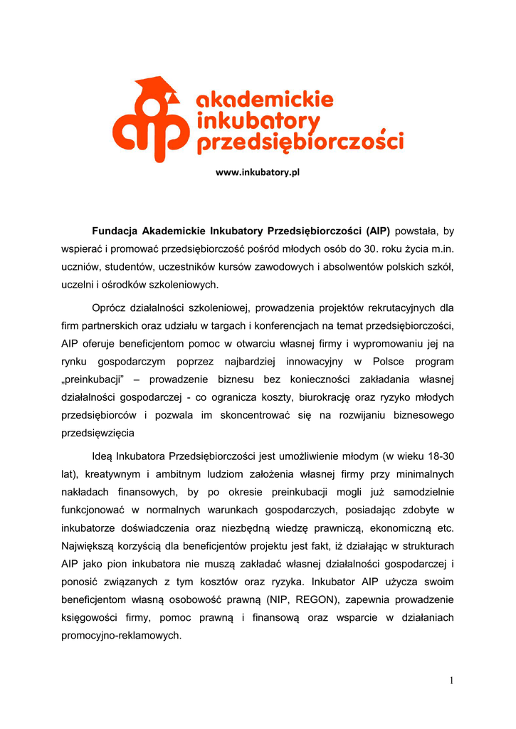 www.inkubatory.pl Fundacja Akademickie Inkubatory Przedsiębiorczości (AIP) powstała, by wspierać i promować przedsiębiorczość pośród młodych osób do 30. roku życia m.in. uczniów, studentów, uczestników kursów zawodowych i absolwentów polskich szkół, uczelni i ośrodków szkoleniowych. Oprócz działalności szkoleniowej, prowadzenia projektów rekrutacyjnych dla firm partnerskich oraz udziału w targach i konferencjach na temat przedsiębiorczości, AIP oferuje beneficjentom pomoc w otwarciu własnej firmy i wypromowaniu jej na rynku gospodarczym poprzez najbardziej innowacyjny w Polsce program „preinkubacji” – prowadzenie biznesu bez konieczności zakładania własnej działalności gospodarczej - co ogranicza koszty, biurokrację oraz ryzyko młodych przedsiębiorców i pozwala im skoncentrować się na rozwijaniu biznesowego przedsięwzięcia Ideą Inkubatora Przedsiębiorczości jest umożliwienie młodym (w wieku 18-30 lat), kreatywnym i ambitnym ludziom założenia własnej firmy przy minimalnych nakładach finansowych, by po okresie preinkubacji mogli już samodzielnie funkcjonować w normalnych warunkach gospodarczych, posiadając zdobyte w inkubatorze doświadczenia oraz niezbędną wiedzę prawniczą, ekonomiczną etc. Największą korzyścią dla beneficjentów projektu jest fakt, iż działając w strukturach AIP jako pion inkubatora nie muszą zakładać własnej działalności gospodarczej i ponosić związanych z tym kosztów oraz ryzyka. Inkubator AIP użycza swoim beneficjentom własną osobowość prawną (NIP, REGON), zapewnia prowadzenie księgowości firmy, pomoc prawną i finansową oraz wsparcie w działaniach promocyjno-reklamowych. 1 Zakres usług AIP 1. Działalność na zasadzie pionu w Inkubatorze Poprzez innowacyjne rozwiązania prawne, Fundacja AIP umożliwia młodym ludziom korzystanie ze swojej osobowości prawnej. Mogą oni założyć własną działalność, funkcjonującą formalnie jako komórka organizacji, a w rzeczywistości będącą ich samodzielnym przedsięwzięciem. Pozwala to młodemu przedsiębiorcy zaoszczędzić zarówno czas, związany z oczekiwaniem na założenie działalności gospodarczej jako podmiotu, jak również środki niezbędne do jej otwarcia. Ponadto osoba prowadząca firmę w ramach AIP nie figuruje w rejestrach jako osoba prowadząca indywidualną działalność gospodarczą, w związku z czym nie ma obowiązku opłacania składki ZUS dotyczącej przedsiębiorców oraz nie blokuje sobie możliwości korzystania z programów pomocowych, które zarezerwowane są dla osób nie prowadzących działalności przez pewien okres wstecz. Działanie w ramach AIP wpływa również na podniesienie wiarygodności osoby prowadzącej takie przedsięwzięcie – w sprawach biznesowych występuje w jej imieniu fundacja, która ma kilkadziesiąt oddziałów w całym kraju i obraca kilkunastoma milionami złotych rocznie. Działanie pod osobowością prawną AIP to podstawowy element zapewniający bezpieczeństwo działania młodym przedsiębiorcom – w sytuacji spornej (których w biznesie nie brakuje) osoba taka nie jest pozostawiona sama sobie, gdyż może liczyć na wsparcie fundacji. Do tej pory ponad 3000 osób skorzystało z możliwości działania jako pion Inkubatora. 2. Prowadzenie księgowości firmy Zakładając firmę w AIP, młody człowiek otrzymuje wsparcie w zakresie prowadzenia księgowości firmy. Wszystkie dokumenty księgowe, a jest ich prawie 9000 w każdym miesiącu, są weryfikowane (otrzymywane) i tworzone (wystawiane) przy pomocy pracowników Inkubatorów, a następnie przesyłane do Działu Finansowo-Księgowego AIP w celu zaksięgowania. AIP dba o to, by wszystkie dokumenty były sporządzone zgodnie z obowiązującymi zasadami oraz zaksięgowane i zgłoszone do odpowiednich urzędów w terminie. Dzięki temu młody przedsiębiorca może skupić się na testowaniu swojego pomysłu na biznes, bez ryzyka popełnienia błędu w rozliczeniach finansowych oraz obaw zetknięcia się z 2 biurokracją w urzędach. Działanie obsługi księgowej skonstruowane jest tak, by osoba prowadząca działalność w AIP mogła nauczyć się procedur i zasad związanych z obrotem dokumentami księgowymi od podstaw po wszelkie zagadnienia niezbędne do prowadzenia wybranej działalności. 3. Obsługa prawna, tworzenie oraz weryfikacja umów Aby zapewnić możliwość prowadzenia firmy bez ryzyka związanego z zawieraniem kontraktów, osoba prowadząca firmę w AIP otrzymuje w pakiecie również obsługę prawną. Ma do dyspozycji prawników z Działu Prawnego AIP. Może np. skorzystać z porady prawnej na temat prowadzenia działalności lub przesłać umowę do weryfikacji. Co miesiąc Biuro Prawne AIP udziela ok. 200 porad związanych z działalnością firm. Jest to drugi, obok działania pod osobowością prawną Fundacji AIP, element zapewniający bezpieczeństwo niedoświadczonym osobom, które chcą spróbować sił w biznesie. 4. Promocja w mediach AIP promuje swoje firmy poprzez media, zarówno lokalne, jak i ogólnopolskie. Co roku o AIP i działających w ramach fundacji firmach pojawia się kilka tysięcy informacji w mediach. Najlepsze z firm promowane są na największych portalach informacyjnych (WP, Onet, Interia, Gazeta.pl), w dziennikach, tygodnikach i miesięcznikach (Rzeczpospolita, Gazeta Wyborcza, Puls Biznesu, Wprost, Newsweek), stacjach radiowych i telewizjach regionalnych i ogólnopolskich (TV Biznes, TVN CNBC). 5. Pomoc w pozyskiwaniu funduszy na inwestycje Akademickie Inkubatory Przedsiębiorczości to nie tylko organizacja, dająca narzędzia do prowadzenia własnej firmy. To również gigantyczna sieć kontaktów w środowiskach biznesowych, do których ma dostęp zaczynający swoją działalność przedsiębiorca. Dzięki AIP, projekty mogą otrzymać wsparcie w pozyskiwaniu funduszy z organów państwowych, samorządowych, kredytów komercyjnych bądź w ramach programów operac