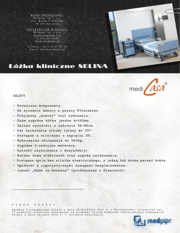 B i u r o p r o j e k t ow e : Medpipe Sp. z o.o. p l a c R o d ł a 8 ( PA Z I M ) 70-419 Szczecin Dy s t ry bu t o r w P o l s c e : Medpipe Sp. z o.o. Niemierzyńska 17a 71-441 szczecin www.medpipe.pl Telefon: +48 9 18 17 17 18 Email: [email protected] Łóżka kliniczne SELINA ZALETY - Drew nia ne komponenty. Na życzenie dekory z palety Pfleiderer. Przyjazny „domowy” styl wykona nia. Duże wygod ne kółka jezd ne d=150m m. Zmia na wysokości w za kresie 36-86cm. Kąt nachylenia strony tylnej do 70 o. Dostępne z silnika mi o napięciu 3V. Ma ksy malne obciążenie do 250kg. Wygod ne 4-sekcyjne materace. Łatwość czyszczenia i dezynfekcji. Bardzo duża stabilność oraz wygoda użytkowa nia. Dostępne opcje bez silnika elektrycznego, z jedną lub dwoma para mi boków. Zgod ność z rygorystyczny mi wy moga mi bezpieczeństwa. Ja kość „Made in Germa ny” (produkowa ne w Niemczech). ------------------------------------- W Y M Ó G P R A W N Y Z g o d n i e z w y m a g a n i a m i U s t a w y z d n i a 1 5 k w i e t n i a 2 0 1 1 r. o d z i a ł a l n o ś c i l e c z n i c z e j a r t . 17 p o d m io t y le c z n ic z e o b o w i ą z a n e s ą s t o s o w a ć w y r o b y m e d y c z n e o d p o w i a d ają c e w y m a g a n io m U s t a w y z d n i a 2 0 m a j a 2 0 1 0 r. o w y r o b a c h m e d y c z n y c h . W Y M Ó G P R A W N Y Z g o d n i e z w y m a g a n i a m i U s t a w y z d n i a 1 5 k w i e t n i a 2 0 1 1 r. o d z i a ł a l n o ś c i l e c z n i c z e j a r t . 17 p o d m io t y le c z n ic z e o b o w i ą z a n e s ą s t o s o w a ć w y r o b y m e d y c z n e o d p o w i a d ają c e w y m a g a n io m U s t a w y z d n i a 2 0 m a j a 2 0 1 0 r. o w y r o b a c h m e d y c z n y c h .