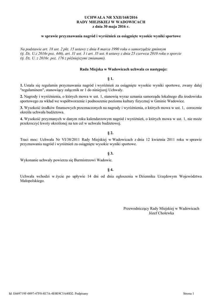 UCHWAŁA NR XXII/168/2016 RADY MIEJSKIEJ W WADOWICACH z dnia 30 maja 2016 r. w sprawie przyznawania nagród i wyróżnień za osiągnięte wysokie wyniki sportowe Na podstawie art. 18 ust. 2 pkt. 15 ustawy z dnia 8 marca 1990 roku o samorządzie gminnym (tj. Dz. U.z 2016r.poz. 446), art. 31 ust. 3 i art. 35 ust. 6 ustawy z dnia 25 czerwca 2010 roku o sporcie (tj. Dz. U. z 2016r. poz. 176 z późniejszymi zmianami). Rada Miejska w Wadowicach uchwala co następuje: § 1. 1. Ustala się regulamin przyznawania nagród i wyróżnień za osiągnięte wysokie wyniki sportowe, zwany dalej "regulaminem", stanowiący załącznik nr 1 do niniejszej Uchwały. 2. Nagrody i wyróżnienia, o których mowa w ust. 1, stanowią wyraz uznania samorządu lokalnego dla środowiska sportowego za wkład we współtworzenie i podnoszenie poziomu kultury fizycznej w Gminie Wadowice. 3. Wysokość środków finansowych przeznaczonych na nagrody i wyróżnienia, o których mowa w ust. 1, corocznie określa uchwała budżetowa. 4. Wysokość przyznanych w danym roku kalendarzowym nagród i wyróżnień, o których mowa w ust. 1, nie może przekroczyć kwoty określonej na ten cel w uchwale budżetowej. § 2. Traci moc: Uchwała Nr VI/38/2011 Rady Miejskiej w Wadowicach z dnia 12 kwietnia 2011 roku w sprawie przyznawania nagród i wyróżnień za osiągnięte wysokie wyniki sportowe. § 3. Wykonanie uchwały powierza się Burmistrzowi Wadowic. § 4. Uchwała wchodzi w życie po upływie 14 dni od dnia ogłoszenia w Dzienniku Urzędowym Województwa Małopolskiego. Przewodniczący Rady Miejskiej w Wadowicach Józef Cholewka Id: E669719F-0897-47F0-8E7A-4E0E9C5A40D2. Podpisany Strona 1 Załącznik Nr 1 do uchwały Nr XXII/168/2016 Rady Miejskiej w Wadowicach z dnia 30 maja 2016 r. Regulamin przyznawania nagród i wyróżnień za osiągnięte wysokie wyniki sportowe § 1. 1. Regulamin określa wysokość oraz zasady i tryb przyznawania nagród i wyróżnień za osiągnięte wysokie wyniki sportowe lub wyniki sportowe o niewymiernym charakterze. 2. Za osiągnięcie wysokich wyników sportowych przyjmuje się w szczególności: 1) uzyskanie miejsc medalowych i punktowych we współzawodnictwie międzynarodowym i krajowym, 2) ustanowienie rekordu Polski, Europy, świata, 3) udział w reprezentacji Polski, 4) awans do wyższej ligi/klasy rozgrywkowej. 3. Za osiągnięcie wyników sportowych o niewymiernym charakterze uważa się niezwykle rzadkie dokonania sportowe, jak np. samotny rejs żeglarski dookoła świata, zdobycie trudnego szczytu górskiego czy jaskini lub inne podobne. § 2. Osiągnięcia sportowe muszą być potwierdzone przez właściwy związek sportowy lub organizację zajmującą się daną dyscypliną. § 3. Zawodnik, aby otrzymać nagrodę lub wyróżnienie, musi posiadać wysokie wyniki sportowe lub wyniki sportowe o niewymiernym charakterze oraz: a) być zawodnikiem reprezentującym barwy Gminy Wadowice (z wyłączeniem § 1 ust. 2 pkt. 3) zrzeszonym w: stowarzyszeniu kultury fizycznej mającym siedzibę na terenie Gminy Wadowice (z wyłączeniem § 1 ust. 3) lub innej organizacji, której celem jest promocja kultury fizycznej, mającej siedzibę na terenie Gminy Wadowice (z wyłączeniem § 1 ust. 3) lub być mieszkańcem Gminy Wadowice, b) uprawiać dyscypliny sportu objęte systemem współzawodnictwa sportowego (z wyłączeniem § 1 ust. 3), c) w chwili złożenia wniosku o przyznanie nagrody lub wyróżnienia nie może mieć ukończonych 25 lat. § 4. 1. Nagrody przyznawane są w formie pieniężnej. 2. Wyróżnienia przyznawane są w formie rzeczowej. § 5. 1. Nagrody i wyróżnienia mogą być przyznawane indywidualnie lub zespołowo. 2. Nagrody i wyróżnienia indywidualne mogą być przyznawane również dla wyróżniających się zawodników w zespole. 3. Nagrody zespołowe przyznaje się z zastosowaniem równych udziałów pomiędzy osoby wchodzące w skład zespołu. § 6. 1. Nagrody i wyróżnienia przyznaje Burmistrz Wadowic z własnej inicjatywy lub na wniosek: 1) Wadowickiej Rady Sportu, 2) Komisji Rady Miejskiej w Wadowicach właściwej do spraw kultury fizycznej, Id: E669719F-0897-47F0-8E7A-4E0E9C5A40D2. Podpisany Strona 1 3) organizacji lub instytucji realizujących zadania w zakresie kultury fizycznej, 4) związku sportowego lub organizacji zajmującej się sportem osób niepełnosprawnych, 5) stowarzyszenia kultury fizycznej lub innej organizacji, w której zrzeszony jest zawodnik, 6) indywidualny danego zawodnika. 2. Wniosek o przyznanie nagrody lub wyróżnienia powinien zawierać: 1) dane osobowe kandydata (członka zespołu), w tym: - imię i nazwisko - datę urodzenia - PESEL - miejsce zamieszkania - nazwę szkoły, uczelni lub zakładu pracy - adres Urzędu Skarbowego 2) dane dotyczące stowarzyszenia kultury fizycznej lub innej organizacji, w której zrzeszony jest zawodnik, w tym: - nazwa - adres siedziby 3) dane dotyczące dotychczasowej działalności albo informacje o osiągnięciach, za które ma być przyznana nagroda lub wyróżnienie 4) uzasadnienie dlaczego ma zostać przyznana nagroda lub wyróżnienie (w tym: wyszczególnienie osiągnięć sportowych zawodnika, a w przypadku trenera wyszczególnienie efektów jego pracy) 5) dokumentację potwierdzającą w/w osiągnięcia 6) wyrażenie zgody przez zawodnika, trenera na zbieranie i przetwarzanie danych osobowych oraz podanie do publicznej wiadomości faktu przyznania nagrody lub wyróżnienia. 3. Wnioski w sprawie przyznania nagród lub wyróżnień rozpatruje i przedkłada do podjęcia decyzji Burmistrzowi Wadowic Komisja złożona z: - Kierownika lub pracownika wydziału merytorycznie odpowiedzialnego za sprawy sportu, - 2 przedstawicieli Wadowickiej Rady Sportu, - 2 radnych Komisji Oświaty, Kultury, Zdrowia i Opieki Społecznej Rady Miejskiej w Wadowicach. 4. Wzór wniosków stanowi załącznik do niniejszego Regulaminu. § 7. 1. Nagrody i wyróżnienia przyznawane są za okres od 1 września roku poprzedzające
