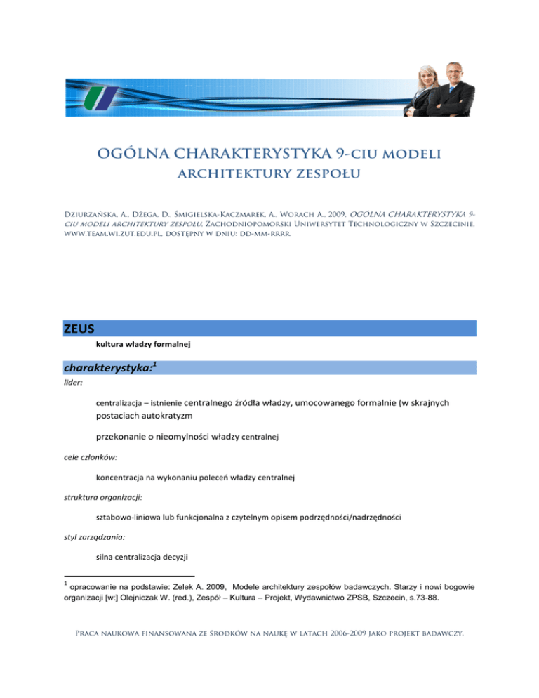 OGÓLNA CHARAKTERYSTYKA 9-ciu 9 modeli architektury zespołu Dziurzańska, A., Dżega, D., Śmigielska Śmigielska-Kaczmarek, A., Worach A., 2009, OGÓLNA CHARAKTERYSTYKA 99 ciu modeli architektury zespołu, Zachodniopomorski Uniwersytet Technologiczny w Szczecinie, Szczecinie www.team.wi.zut.edu.pl, dostępny w dniu: dd-mm-rrrr. dd ZEUS kultura władzy formalnej charakterystyka:1 lider: centralizacja – istnienie centralnego źródła władzy, umocowanego formalnie (w skrajnych postaciach autokratyzm przekonanie o nieomylności władzy centralnej cele członków: koncentracja na wykonaniu poleceń władzy centralnej struktura organizacji: sztabowo-liniowa liniowa lub funkcjonalna z czytelnym opisem podrzędności/nadrzędności styl zarządzania: silna centralizacja decyzji 1 opracowanie na podstawie: Zelek A. 2009, Modele architektury zespołów badawczych. Starzy i nowi bogowie organizacji [w:] Olejniczak W. (red.), Zespół – Kultura – Projekt, Wydawnictwo ZPSB, Szczecin, s.73-88. s.73 Praca naukowa finansowana ze środków na naukę w latach 2006-2009 2006 jako projekt badawczy. OGÓLNA CHARAKTERYSTYKA 9-ciu modeli architektury zespołu AGNIESZKA Dziurzańska, DOROTA Dżega, ANNA Śmigielska-KaczmareK, ANNA Worach Zachodniopomorski Uniwersytet Technologiczny w Szczecinie Wydział Informatyki komunikacja: jednostronna – typ nakazowo-rozdzielczy, przewaga jednostronnej komunikacji decyzje: podejmowane centralnie dystrybucja zasobów: centralna podział nagród: system nagród i kar w ręku władzy centralnej (uznaniowość) motywacja: niekoniecznie czytelny system motywacyjny sukces: czynnikiem decydującym jest jakość władzy centralnej kreatywność: ograniczona zagrożenia: inne: wiara w jednostkę nie w grupę reaktywność na zmiany uzależniona od wrażliwości władzy centralnej archetyp mitologiczny: „Zeus, gdy osiągnął wiek dorosły, postanowił przejąć władzę i zemścić się na swoim ojcu. Po zwycięskiej wojnie, gdy już przepędzono Kronosa, rodzeństwo podzieliło się władzą, losując dziedziny, którymi mieli odtąd rządzić. Zeusowi przypadło niebo i zwierzchnictwo nad innymi bogami. Zeus był bardzo "kochliwy. Jego przygody z różnymi "ziemiankami" powodowały gniew Hery, co doprowadzało do różnych tragicznych wydarzeń. Zeus chcąc ukryć swoje miłosne przygody, bardzo często przybierał postacie zwierzęce, np. byka czy łabędzia. Występuje również we wszystkich mitach zawierających kłótnie pomiędzy bogami. Głównym atrybutem Zeusa jest piorun. Najczęściej przedstawiano go jako siedzącego na tronie z piorunami w ręku. Jego 2 świętym drzewem był dąb, a zwierzęciem orzeł.” 2 opracowanie na podstawie: pl.wikipedia.org Strona | 2 Dziurzańska, a., Dżega, D., Śmigielska-Kaczmarek, A., Worach A., 2009, OGÓLNA CHARAKTERYSTYKA 9ciu modeli architektury zespołu, Zachodniopomorski Uniwersytet Technologiczny w Szczecinie, www.team.wi.zut.edu.pl, dostępny w dniu: dd-mm-rrrr. OGÓLNA CHARAKTERYSTYKA 9-ciu modeli architektury zespołu AGNIESZKA Dziurzańska, DOROTA Dżega, ANNA Śmigielska-KaczmareK, ANNA Worach Zachodniopomorski Uniwersytet Technologiczny w Szczecinie Wydział Informatyki APOLLO kultura roli/funkcji charakterystyka:3 członkowie: zakres władzy, kompetencji wynika bezpośrednio ze stanowiska struktura organizacji: logiczna, racjonalna, formalna , funkcjonalna z czytelnym opisem ról/funkcji i ich zakresem kompetencji i obowiązków o pozycji decyduje rola formalna styl zarządzania: silne umocowanie władzy w funkcjach komunikacja: komunikacja sformalizowana/zbiurokratyzowana – wynikająca ze struktury organizacyjnej kontrola: koordynacja i kontrola poprzez procedury operacyjne opisujące role/funkcje podział zadań: specjalizacja i podział pracy funkcje i specjalizacje jako filary organizacji specjalizacja ważniejsza od innowacyjności i kosztów reakcja na zmiany: opór i opóźnienia kreatywność: ograniczona zagrożenia: skłonność do biurokracji 3 opracowanie na podstawie: Zelek A. 2009, Modele architektury zespołów badawczych. Starzy i nowi bogowie organizacji [w:] Olejniczak W. (red.), Zespół – Kultura – Projekt, Wydawnictwo ZPSB, Szczecin, s.73-88. Strona | 3 Dziurzańska, a., Dżega, D., Śmigielska-Kaczmarek, A., Worach A., 2009, OGÓLNA CHARAKTERYSTYKA 9ciu modeli architektury zespołu, Zachodniopomorski Uniwersytet Technologiczny w Szczecinie, www.team.wi.zut.edu.pl, dostępny w dniu: dd-mm-rrrr. OGÓLNA CHARAKTERYSTYKA 9-ciu modeli architektury zespołu AGNIESZKA Dziurzańska, DOROTA Dżega, ANNA Śmigielska-KaczmareK, ANNA Worach Zachodniopomorski Uniwersytet Technologiczny w Szczecinie Wydział Informatyki archetyp mitologiczny: „Apollo uważany za boga piękna, światła, słońca, życia, śmierci, muzyki, wróżb, prawdy, prawa, porządku, patrona sztuki i poezji, przewodnika muz. W rzeczywistości bóstwo o szerokich, często sprzecznych, kompetencjach. Bóg gwałtownej śmierci, jednocześnie solarny i chtoniczny. Zabijając węża-smoka Pytona (lub Delfyne, będącego hipostazą pierwotnej Magna Mater), strzegącego bramy do tajemnej wiedzy ukrytej pod/w ziemią/i, przejmuje władzę nad wyrocznią w Delfach (gr. delfys macica). Zabójstwo Pytona, podobnie jak zabójstwo Wrytry przez Indrę, było wielkim, bohaterskim czynem, ale i przekleństwem, z którego należało się oczyścić. Ustanowił więc igrzyska pytyjskie, zszedł też do podziemia. Stał się przekaźnikiem boskich (Zeusowych) wyroków, szczególnie w sprawie obrzędów oczyszczenia po zbrodni zabójstwa. Oddala (apotropaios) i oczyszcza (katharsios) od zła (zbrodni mordu), które sam wywołał. Łuk i lira, którymi posługuje się Apollo, mogą być interpretowane jako narzędzia przeciwstawne (mordu i oczyszczenia). Może być to również w rzeczywistości 4 jedno, najbardziej pierwotne, instrumentum – symbol władzy nad życiem i śmiercią oraz wiedzy.” 4 opracowanie na podstawie: pl.wikipedia