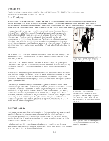 Policja 997 Źródło: http://www.gazeta.policja.pl/997/archiwum-1/2009/numer-56-112009/47126,Lzy-Krystyny.html Wygenerowano: Czwartek, 2 marca 2017, 00:28 Łzy Krystyny Dzieciństwo Krystyny trwało krótko. Pierwsze łzy małej Krysi i jej młodszego braciszka osuszali pocałunkami kochający rodzice. Potem przyszła wojna, która już na początku zabrała trzyipółletniej dziewczynce ojca, a kilka lat potem matkę… Sześćdziesiąt lat później Krystyna Brydowska mogła z satysfakcją stanąć nad grobem ojca w Miednoje. To ona koordynowała prace związane z budową Polskich Cmentarzy Wojennych w Katyniu, Charkowie i Miednoje. I znowu popłynęły łzy… –Ojca pamiętam jak przez mgłę – mówi Krystyna Brydowska, wiceprezes Zarządu Federacji Rodzin Katyńskich, członek Zarządu Warszawskiego Stowarzyszenia Rodzina Policyjna 1939, na co dzień pracująca w Radzie Ochrony Pamięci Walk i Męczeństwa. – Pamiętam wielkie pakowanie do olbrzymich kufrów, gdy opuszczaliśmy w 1939 r. dom w Szereszowie. Pamiętam, że próbowałam do tych sakwojaży wcisnąć jedną z moich lalek wraz z ubrankami, aby też mogła z nami jechać. Bardzo byłam do moich lalek przywiązana, to były „moje dzieci”. Pamiętam, jak ojciec nachylił się, ucałował nas i powiedział – „To już jadę”. Nigdy więcej go nie zobaczyłam. (...) We wrześniu 1939 r. nastąpiło gwałtowne rozstanie. Janina Miszczak z dwójką dzieci: trzyipółletnią Krysią i półtorarocznym Januszem przeniosła się do Brześcia, gdzie mieszkała jej rodzina. – Jeszcze w 1939 r. mama dostała z więzienia w Brześciu gryps, że ojca złapano – wspomina pani Krystyna. – Znam to z opowieści rodzinnych. Mama zrobiła paczkę, zaniosła do więzienia, a tam jej powiedziano, że ojciec „wyjechał w nieznanym kierunku”. Rodzinna idylla - lipiec 1938r. Pani Krystyna pod czułą opieką rodziców Po miesiącach niepewności przyszła kartka z obozu w Ostaszkowie. Feliks Miszczak pisał, żeby się o niego nie martwić, że tęskni, jest w niewoli i ma nadzieję na rychłe spotkanie. Był początek 1940 r. Pani Miszczakowa szybko odpisała. Gdy Sowieci potwierdzili w ten sposób miejsce pobytu rodziny, w mieszkaniu babci pani Krystyny zjawili się enkawudziści. – Szczęśliwym trafem mama była wtedy ze mną gdzieś w mieście – mówi córka przedwojennego policjanta. – Rodzina mojej matki to sybiracy, babunia 17 lat spędziła na zesłaniu. Wiedzieli, o co chodzi. W domu był jeszcze mój brat. Siostra mamy powiedziała, że to jej dziecko. Babunia załatwiła nam przewodników i ja z mamą po drabinach przerzucanych między krami przeszłyśmy na drugą stronę Bugu. Pamiętam, że bardzo ryczałam, że zatykano mi buzię kostkami cukru. Mój braciszek był za mały na taką przeprawę. Został, jako dziecko mojej cioci, siostry mamy, po sowieckiej stronie rzeki. Potem, gdy zmieniał się front, wracałyśmy. W 1943 r. mama zabrała z nami mojego brata. Krystyna Brydowska z dokumentem potwierdzającym nadanie przez prezydenta Medalu Niepodległości ojcu w 1938 r. Feliks Miszczak vel Miszczuk służył w Policji Państwowej od 1922 r. (...) CMENTARZ DLA OJCA Pani Krystyna rosła w patriotycznej atmosferze. W domu słuchało się „wywrotowych rozgłośni”. Babcia nie ustawała w poszukiwaniach zięcia. Dzieci w oficjalnych dokumentach podawały, że był urzędnikiem samorządowym. Starały się o rentę po ojcu, bez efektu. W urzędzie wystawiono akt zgonu, który informował, że Feliks Miszczak zmarł… 9 maja 1945 r.! – Jakaś nadzieja się tliła – mówi Krystyna Brydowska. – Łudziliśmy się, że może wyszedł z Armią Andersa, ale przecież dałby znać… Ciężko było wychowywać się i bez ojca, i bez matki. Dobrze, że mieliśmy babunię. (...) Pani Krystyna zawsze obecna jest na uroczystościach rocznicowych przy obelisku przed KGP Na początku lat 90. dostała z PCK kartkę, że ojciec został zamordowany 20 kwietnia 1940 r. w Kalininie (Twerze). – Ta wiadomość zrobiła na mnie piorunujące wrażenie – pani Krystyna nie kryje wzruszenia. – Wewnętrznie zamarłam. Nie było już odwołania. Teraz wiadomo było już na pewno… I znowu popłynęły łzy. (...) Feliks Miszczak, podobnie jak 6295 jeńców obozu w Ostaszkowie, ma już godne miejsce spoczynku. Polski Cmentarz Wojenny w Miednoje został uroczyście otwarty 2 września 2000 r. Postanowieniem z 5 października 2007 r. prezydent RP mianował st. przod. Feliksa Miszczaka na stopień aspiranta (pierwszy stopień oficerski w PP). 29 września br. w ramach ogólnopolskiej akcji „Katyń… ocalić od zapomnienia” Feliks Miszczak otrzymał swój dąb pamięci przy Zespole Szkół Transportowo‑Komunikacyjnych im. Tadeusza Kościuszki w Lublinie. Teraz stanie się częścią zbiorowej pamięci uczniów i absolwentów tej szkoły. Paweł Ostaszewski zdj. autor i z archiwum Krystyny Brydowskiej Jest to fragment artykułu. Całość w tradycyjnej, drukowanej wersji miesięcznika „Policja 997”. Dęby pamięci Dąb poświęcony asp. Feliksowi Miszczakowi to 1245. drzewko upamiętniające ofiarę zbrodni katyńskiej. W połowie października br. w całej Polsce było już takich dębów 1529. Do akcji rozpoczętej przez Stowarzyszenie PARAFIADA oraz Urząd Miasta i Gminy Radzymin włączają się szkoły, organizacje społeczne, kluby sportowe, towarzystwa miłośników miast, instytucje samorządowe. Program „Katyń… ocalić od zapomnienia” zakłada posadzenie 21 473 dębów na siedemdziesięciolecie zbrodni katyńskiej, przypadające w przyszłym roku. Jedno drzewo upamiętnia jednego człowieka zgładzonego przez Sowietów w zbrodni katyńskiej. Akcja została objęta honorowym patronatem prezydenta RP. Na stronie www.parafiada.pl w zakładce „Katyń… ocalić od zapomnienia” znajdują się wszelkie informacje dla chętnych, którzy chcą uczcić pamięć polskich oficerów, policjantów i pog
