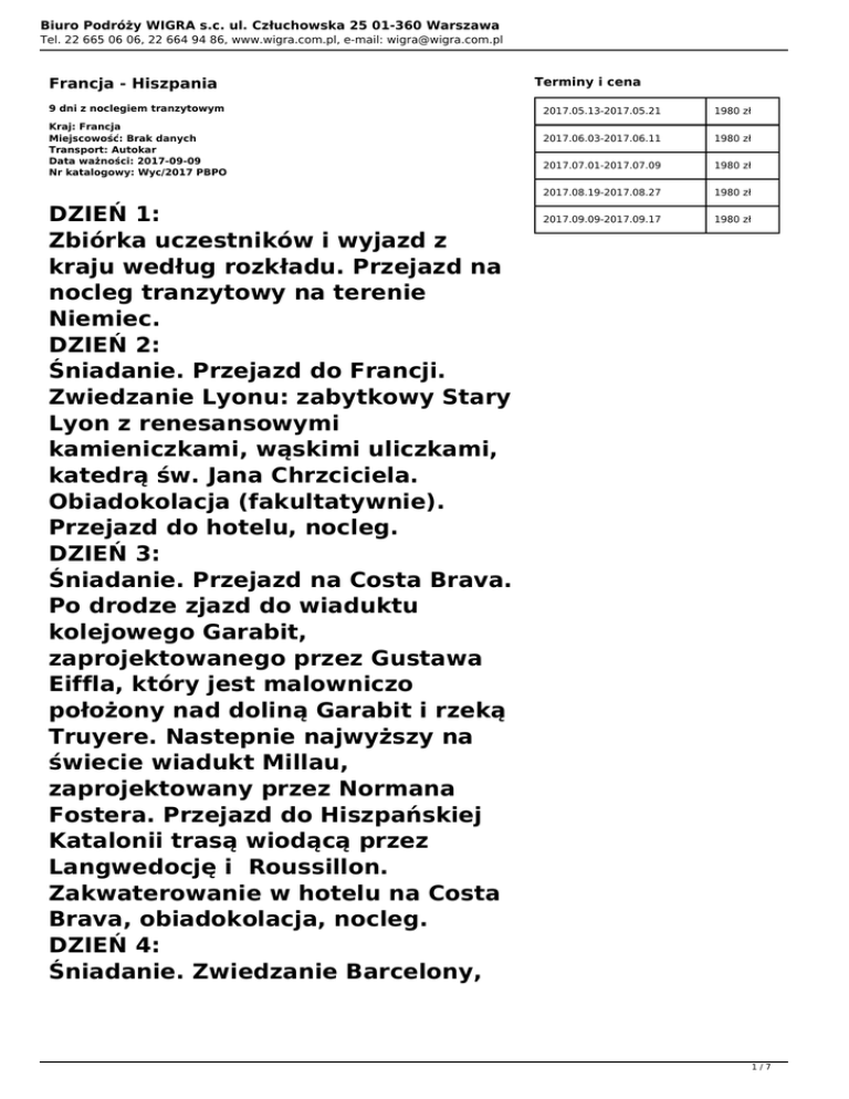 Biuro Podróży WIGRA s.c. ul. Człuchowska 25 01-360 Warszawa Tel. 22 665 06 06, 22 664 94 86, www.wigra.com.pl, e-mail: [email protected] Francja - Hiszpania 9 dni z noclegiem tranzytowym Kraj: Francja Miejscowość: Brak danych Transport: Autokar Data ważności: 2017-09-09 Nr katalogowy: Wyc/2017 PBPO DZIEŃ 1: Zbiórka uczestników i wyjazd z kraju według rozkładu. Przejazd na nocleg tranzytowy na terenie Niemiec. DZIEŃ 2: Śniadanie. Przejazd do Francji. Zwiedzanie Lyonu: zabytkowy Stary Lyon z renesansowymi kamieniczkami, wąskimi uliczkami, katedrą św. Jana Chrzciciela. Obiadokolacja (fakultatywnie). Przejazd do hotelu, nocleg. DZIEŃ 3: Śniadanie. Przejazd na Costa Brava. Po drodze zjazd do wiaduktu kolejowego Garabit, zaprojektowanego przez Gustawa Eiffla, który jest malowniczo położony nad doliną Garabit i rzeką Truyere. Nastepnie najwyższy na świecie wiadukt Millau, zaprojektowany przez Normana Fostera. Przejazd do Hiszpańskiej Katalonii trasą wiodącą przez Langwedocję i Roussillon. Zakwaterowanie w hotelu na Costa Brava, obiadokolacja, nocleg. DZIEŃ 4: Śniadanie. Zwiedzanie Barcelony, Terminy i cena 2017.05.13-2017.05.21 1980 zł 2017.06.03-2017.06.11 1980 zł 2017.07.01-2017.07.09 1980 zł 2017.08.19-2017.08.27 1980 zł 2017.09.09-2017.09.17 1980 zł 1/7 Biuro Podróży WIGRA s.c. ul. Człuchowska 25 01-360 Warszawa Tel. 22 665 06 06, 22 664 94 86, www.wigra.com.pl, e-mail: [email protected] stolicy Katalonii: świątynia Sagrada Familia – dzieło życia słynnego architekta Antonio Gaudiego, następnie park Guel również zaprojektowany przez Antonio Gaudiego. Wjazd na wzgórze Montjuic, wizyta na stadionie FC Barcelona Camp Nou. Wizyta na starym mieście, spacer po jego sercu - Barri Gótic, czyli dzielnicy gotyckiej z wąskimi uliczkami, ozdobionymi zabytkowymi kamienicami. Następnie słynna ulica Rambla, pełna kawiarenek, restauracji i sklepów, która prowadzi do portu z pomnikiem Kolumba. Powrót do hotelu, obiadokolacja, nocleg. DZIEŃ 5: Śniadanie. Wykwaterowanie z hotelu. Przejazd do Montserrat – zwiedzanie słynnego klasztoru z figurą Czarnej Madonny. Następnie przejazd do Figueres, zwiedzanie muzeum Salvadora Dali, jednego z najczęściej odwiedzanych muzeów Hiszpanii. Przejazd do Pont du Gard – trójpoziomowego akweduktu z 19 r. p.n.e., obiadokolacja (fakultatywnie), zakwaterowanie w hotelu w okolicy Avignon, nocleg. DZIEŃ 6: Śniadanie. Zwiedzanie Prowansji: region Camargue, słynący z licznych rozlewisk, które są siedliskiem setek gatunków ptaków, m. in. 2/7 Biuro Podróży WIGRA s.c. ul. Człuchowska 25 01-360 Warszawa Tel. 22 665 06 06, 22 664 94 86, www.wigra.com.pl, e-mail: [email protected] różowych flamingów. Spacer po malowniczej, rybackiej wiosce Saintes-Maries-de-la-Mer, w której mnóstwo sklepików oferuje najróżniejsze artykuły regionalne. Wycieczka statkiem po delcie Rodanu. Krótkie zwiedzanie Arles, miasta, które słynie z zabytków z czasów rzymskich: teatr z I w., amfiteatr z II w. mieszczący 26 tys. widzów, katedra świętego Trofima. Przejazd do Avignon – jednego z najbardziej fascynujących miast południa Francji, otoczonego potężnymi murami obronnymi, nad którymi króluje ogromny Pałac Papieży. Zwiedzanie pałacu, katedry Notre Dame, spacer po ogrodach papieskich oraz wizyta na moście św. Bénezeta z XII wieku. Obiadokolacja (fakultatywnie), powrót do hotelu, nocleg. DZIEŃ 7: Śniadanie. Wyjazd w stronę Lazurowego Wybrzeża. Po drodze przejazd wzdłuż Massif de l’Estérel, nadmorskiej drogi wśród czerwonych skał porfirowych. Przejazd do Monaco, zwiedzanie tego malowniczego Księstwa: Pałac Książęcy, katedra, Muzeum Oceanografii oraz wizyta w Monte Carlo. Przejazd do Cannes, spacer Aleją Gwiazd, Bulwarem La Croisette przy pałacu Festiwali Filmowych, obiadokolacja 3/7 Biuro Podróży WIGRA s.c. ul. Człuchowska 25 01-360 Warszawa Tel. 22 665 06 06, 22 664 94 86, www.wigra.com.pl, e-mail: [email protected] (fakultatywnie). Zakwaterowanie w hotelu, nocleg. DZIEŃ 8: Śniadanie. Przejazd do Nicei, stolicy Lazurowego Wybrzeża, gwarnego miasta pełnego artystów, milionerów i arystokracji. Spacer Promenadą Anglików ze słynnymi hotelami-pałacami m.in. Negresco i Meridien, targ kwiatowy, wzgórze Le Chateau. Chwila odpoczynku na plaży. W godzinach popołudniowych wyjazd na obiadokolację (fakultatywnie) i nocleg na terenie Niemiec. DZIEŃ 9: Śniadanie. Powrót do poszczególnych miejscowości w kraju. Program wycieczki jest ramowy. Kolejność zwiedzania może ulec zmianie. ZAREZERWUJ JUŻ DZIŚ, TEL 22 665 06 06, 22 664 94 86 DOPŁATY OPCJONALNE: Dopłata do pokoju 1-os. 690 zł Dopłata do 5 obiadokolacji 360 zł CENA IMPREZY OBEJMUJE: - przejazd autokarem (klimatyzacja, dvd, barek, wc) - 8 noclegów w hotelach**/*** w pokojach 2 - osobowych. z łazienką, 4/7 Biuro Podróży WIGRA s.c. ul. Człuchowska 25 01-360 Warszawa Tel. 22 665 06 06, 22 664 94 86, www.wigra.com.pl, e-mail: [email protected] - 8 śniadań, 2 obiadokolacje - program turystyczny - opiekę pilota - ubezpieczenie SIGNAL IDUNA (KL 10.000 EUR, NNW 15.000 PLN, bagaż 1.000 PLN) DODATKOWO PŁATNE: - pakiet do realizacji programu: 95 EUR (rezerwacje i wstępy do zwiedzanych obiektów, usługi przewodnickie, rejs po delcie Rodanu, zestaw słuchawkowy Tour Guide) płatny pilotowi wycieczki WAŻNE INFORMACJE: 1. Wycieczki będą realizowane w zależności od ilości uczestników w grupie: wygodnymi autokarami lub wygodnymi busami. 2. Niektóre połączenia krajowe mogą być realizowane innymi środkami transportu niż autokar (bus, samochód osobowy, autokar liniowy, pociąg). Trasy antenowe obsługiwane są bez pilota. 3. Wyjazd *antenkowy za dopłatą z wybranego miasta organizowany przy minimum 6 os. wsiadających. W przypadku braku wymaganego min. 6 osób PBP OLSZTYN ma prawo anulować wyjazd z danej miejscowości. Anulacja wyjazdu nie upoważnia do bezkosztowej rezygnacji z wycieczki. W takim przypad
