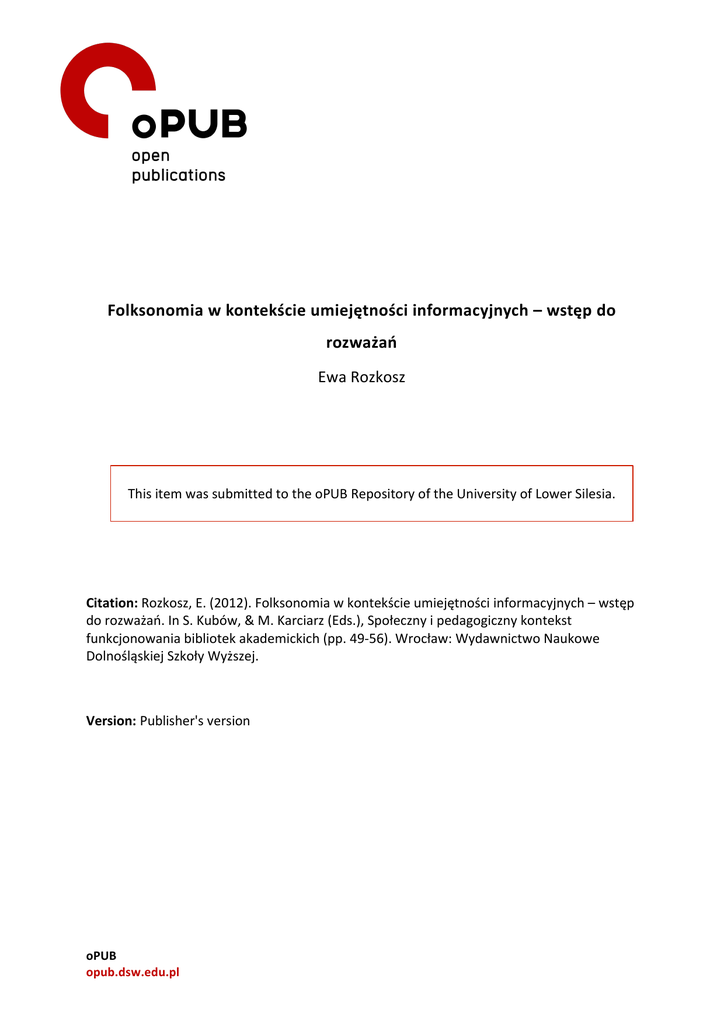 $ ! ! ! ! ! ! ! ! Folksonomia*w*kontekście"umiejętności"informacyjnych"–!wstęp&do& rozważań% Ewa$Rozkosz$ ! ! ! This$item$was$submitted$to$the$oPUB$Repository$of$the$University$of$Lower$Silesia.$ ! ! $ Citation:%Rozkosz,$E.$(2012).$Folksonomia$w$kontekście$umiejętności$informacyjnych$–$wstęp$ do$rozważań.$In$S.$Kubów,$&$M.$Karciarz$(Eds.),$Społeczny$i$pedagogiczny$kontekst$ funkcjonowania$bibliotek$akademickich$(pp.$49Q56).$Wrocław:$Wydawnictwo$Naukowe$ Dolnośląskiej$Szkoły$Wyższej.$ $ Version:$Publisher's$version$ $ $ $ $ $ $ oPUB% opub.dsw.edu.pl% Społeczny i pedagogiczny kontekst funkcjonowania bibliotek akademickich INSTYTUCJE Ewa Rozkosz Dolnośląska Szkoła Wyższa Folksonomia w kontekście umiejętności informacyjnych – wstęp do rozważań Abstrakt:Systemyorganizującezasobyinformacyjne,jakimisąkatalogibiblioteczne,konstruowanesązmyśląoodbiorcy.Indeksowanie,służąceuporządkowaniuchaosuwzbiorzezgromadzonychmetainformacji,odbywasięprzypomocy wyspecjalizowanychnarzędzi,jakimisąjęzykiinformacyjno-wyszukiwawcze.WPolsceczynnośćtaopierasięprzede wszystkimnadwóchjęzykach:JHPBNorazJHPKABA.Kontrolasłownictwa,będącadomenąprzytoczonychnarzędzi, zapewnić ma efektywność w procesie wyszukiwania. Wykorzystanie leksyki zaczerpniętej z języka naturalnego dajemożliwośćprowadzeniaposzukiwańprzezosobynieposiadająceodpowiedniegoprzygotowaniateoretycznego.Owi niespecjaliścikonstruująinstrukcjewyszukiwawczewsposóbniemetodyczny,nieznajązasadwyodrębnianiatematu,budowyrozwiniętychhasełprzedmiotowych.Ajednak,rozwijanaodnajmłodszychlatkompetencja,jakąjestumiejętność kategoryzacjiobiektówwprzestrzeni,awefekcietworzeniawłasnychetykietdlawyodrębnionychkategorii,pozwalana odnajdywanieźródełrelewantnych.Kompetencjataodpowiadaźródłosłowowipojęciafolksonomia.Termintenwyrasta ze-przestrzeni,awięcświatawirtualnego,uruchomionegowrazzrozpowszechnieniemglobalnejsieciInternet.Stosowanydlaopisaniaczynnościnadawaniaetykiet,tzw.tagówdlaobiektówcyfrowychwinternetowychserwisachspołecznościowych.Wniniejszymreferaciepostanowionozaadaptowaćpojęciefolksonomiinapotrzebyopisaniamechanizmu poruszaniasięużytkownikówpobibliotecznychsystemachinformacyjno-wyszukiwawczych. Słowakluczowe:folksonomia,językiinformacyjno-wyszukiwawcze,użytkownicyinformacji Otóż nie istnieje „informacja w ogóle”. Nie dość też jej adresata. Informacja istnieje tylko ze względu na pewien zbiór, w obrębie którego dokonuje się wyboru. StanisławLem, Summa Technologiae Wstęp Na polu postrzegania funkcjonuje pewien filozoficzny trywializm, jakim jest stwierdzenie, żeotaczającynasświatanalizowaćmożnanawieluróżnychpoziomach.Tennajbardziejnamacalny z nich dotyczy materialnego wymiaru przestrzeni, wobec której można stosować takie określenia jakdługość,szerokość,głębokośćczymasa.Percepcjainnychpłaszczyznrzeczywistościwymaga przejścianawyższypoziomabstrakcji,naktórymmaterialneobiektyuzyskująformęnowejjakości, formęsymboliczną.Jednąztakichpłaszczyznjestjęzyk,instrument,któryodróżniaczłowiekaod przedstawicieli innych gatunków. Za pomocą języka tworzone są rozmaite komunikaty, następuje nawiązywanierelacji,budowaniespołeczeństw.Światjęzykastanowiswoistepreludiumdoświata informacji,określanegoteżmianeminfosfery.Informacyjnywymiarrzeczywistościczęstoutożsamianyjestzeświatemcyfrowym;wistocieposiadajednakznacznieszerszekonotacje.Dodystrybucji obiektów w infosferze wykorzystywane były i są różne materiały: poczynając od muszelek, 49 Społeczny i pedagogiczny kontekst funkcjonowania bibliotek akademickich INSTYTUCJE sznurkówczyglinianychtabliczek,napapierze,dyskuoptycznymczytelebimachkończąc.Punktem centralnyminfosferyjestczłowiek,awięcwytwórca,posiadacz,dystrybutor,krytykiodbiorcainformacji.Właściwestudiumtejprzestrzenizapewniaczłowiekowizespółkompetencjiinformacyjnych. Wyposażonywznajomośćregułuporządkowaniazasobówwsystemachagregującychinformacje, jakrównieżumiejętnośćposługiwaniasięnarzędziamidostępu,eksplorujejąwsposóbefektywny. Osobatakaokreślanajestwliteraturzeanglojęzycznejjakoinformation literate1,awięcczłowiek odznaczającysiępiśmiennością informacyjną.Napiedestaleniniejszejpiśmiennościstoiumiejętność formułowaniapytań.Ograniczającprzestrzeńinfosferydosystemuinformacyjno-wyszukiwawczego nowoczesnejbiblioteki,umiejętnośćtasprowadzaćsiębędziedokonstruowaniakwerendwpisywanychwokniedialogowymkatalogubibliotecznego. Pomiędzy charakterystyką wyszukiwawczą a kwerendami użytkowników Jeślibyspersonifikowaćmechanizmwyszukiwawczykatalogubibliotecznego,tomożnapowiedzieć,żerozmowamiędzyużytkownikiemasystememprzypominaograniczonądohasełkomunikacjędwojgaosób,posługującychsiętymsamymjęzykiemnarodowym,aleinnągwarą.Mimo podobieństwa,niezawszepojęcia,którezastosujejednazestron,będązrozumiałedladrugiejstrony dialogu. Kwerenda:sposóbnauczania „0”wynikówwyszukiwania Rys.1.Sytuacjakomunikacjawdialoguużytkownikazkatalogiembibliotecznym(opracowaniewłasne) Rekordy bibliograficzne, będące reprezentacjami fizycznych jednostek bibliotecznych, zawierająinformacjeotreścidokumentów,wyrażonewjednymzjęzykówinformacyjno-wyszukiwawczych.Najczęściejwykorzystywanesądotegocelujęzykiokontrolowanymzasobieleksykalnym. WBiblioteceDolnośląskiejSzkołyWyższejweWrocławiucharakterystykatreściowasporządzonajestzapomocą: • JHPKABA2, Chanlin,L.IChang,C.(2003).Web-BasedLibraryInstructionforPromotingInformationSkills.Journal of Instructional Psychology, 30(4),Źródło:http://www.questia.com/reader/printPaginator/741[15.04.2009]. 2 JęzykHasełPrzedmiotowychKABA(KatalogiAutomatyczneBibliotekAkademickich). 1 50 Społeczny i pedagogiczny kontekst funkcjonowania bibliotek akademickich INSTYTUCJE • lokalnegojęzykhasełprzedmiotowych,opartegonaJHPBN3, • skróconychsymboliUKD4. Naiwnościąbyłobysądzić,iżużytkownicykataloguzastosująwproc