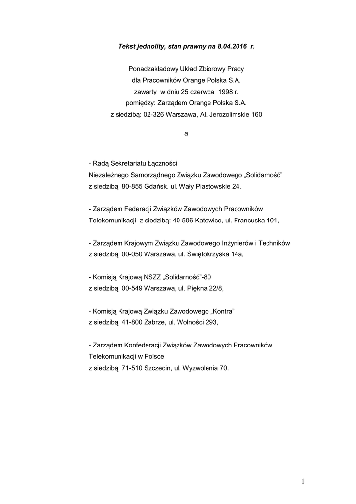Tekst jednolity, stan prawny na 8.04.2016 r. Ponadzakładowy Układ Zbiorowy Pracy dla Pracowników Orange Polska S.A. zawarty w dniu 25 czerwca 1998 r. pomiędzy: Zarządem Orange Polska S.A. z siedzibą: 02-326 Warszawa, Al. Jerozolimskie 160 a - Radą Sekretariatu Łączności Niezależnego Samorządnego Związku Zawodowego „Solidarność” z siedzibą: 80-855 Gdańsk, ul. Wały Piastowskie 24, - Zarządem Federacji Związków Zawodowych Pracowników Telekomunikacji z siedzibą: 40-506 Katowice, ul. Francuska 101, - Zarządem Krajowym Związku Zawodowego Inżynierów i Techników z siedzibą: 00-050 Warszawa, ul. Świętokrzyska 14a, - Komisją Krajową NSZZ „Solidarność”-80 z siedzibą: 00-549 Warszawa, ul. Piękna 22/8, - Komisją Krajową Związku Zawodowego „Kontra” z siedzibą: 41-800 Zabrze, ul. Wolności 293, - Zarządem Konfederacji Związków Zawodowych Pracowników Telekomunikacji w Polsce z siedzibą: 71-510 Szczecin, ul. Wyzwolenia 70. 1 PONADZAKŁADOWY UKŁAD ZBIOROWY PRACY DLA PRACOWNIKÓW Orange Polska S.A. Preambuła Rozdział I. Postanowienia wstępne Rozdział II. Zasady zatrudniania pracowników i rozwiązywania z nimi stosunków pracy Rozdział III. Czas pracy Rozdział IV. Urlopy pracownicze Rozdział V. Zakaz konkurencji Rozdział VI Zasady wynagradzania i przyznawania innych świadczeń związanych z pracą Rozdział VII. Bezpieczeństwo i higiena pracy Rozdział VIII. Szkolenie pracowników Rozdział IX. Działalność socjalna. Rozdział X. Wzajemne zobowiązania stosowaniem. stron Układu związane z jego zawarciem i Rozdział XI. Zasady współdziałania związków zawodowych ze Spółką Rozdział XII. Postanowienia końcowe 2 Preambuła Strony zawierając niniejszy Ponadzakładowy Układ Zbiorowy Pracy dla Pracowników Orange Polska S.A. dążą do stworzenia optymalnych warunków umożliwiających ochronę praw i interesów pracowników oraz zaspokojenie ich potrzeb przy jednoczesnym uwzględnieniu możliwości ekonomicznych oraz warunków funkcjonowania i rozwoju Orange Polska S.A. Ustanowione w Układzie unormowania i wzajemne zobowiązania jego Stron służyć powinny zbudowaniu ustroju pracy w Orange Polska S.A. opartego na zasadzie zaufania i współdziałania pomiędzy Spółką i pracownikami oraz reprezentującymi ich związkami zawodowymi, a także rozstrzygania kwestii spornych przy zastosowaniu niekonfrontacyjnych procedur, zwłaszcza negocjacji, pojednastwa i rozjemstwa. Mając powyższe na względzie Strony Ponadzakładowego Układu Zbiorowego Pracy dla Pracowników Orange Polska S.A. skoncentrowały się na ustanowieniu w nim efektywnego i sprawiedliwego systemu wynagradzania i nagradzania pracowników, a także optymalnych warunków ich pracy. Dla zapewnienia realizacji tych celów Strony Ponadzakładowego Układu Zbiorowego Pracy dla Pracowników Orange Polska S.A. będą wspierać oraz zgadzają się na: funkcjonowanie Orange Polska S.A., zapewniające osiąganie wysokiego poziomu jakości jej usług, produktywności i konkurencyjności poprzez ustawiczne wprowadzanie odpowiednich technologii i systemów organizacji pracy, w celu utrzymania jej wysokiej pozycji na rynku telekomunikacyjnym, natychmiastową reakcję na zmiany zachodzące na rynku telekomunikacyjnym i w nowoczesnych technologiach, w celu jak najszybszego wykorzystania płynących z tego tytułu korzyści dla Orange Polska S.A. i zatrudnionych w niej pracowników, uruchomienie bezpośrednich kanałów przepływu informacji między zakładem i pracownikami, będących przedmiotem wspólnego zainteresowania, stałe podnoszenie kwalifikacji zawodowych pracowników. Przedstawione wyżej cele Ponadzakładowego Układu Zbiorowego Pracy dla Pracowników Orange Polska S.A. będą brane pod uwagę w procesie jego stosowania i wyjaśniania. Dla bezkonfliktowego realizowania Ponadzakładowego Układu Zbiorowego Pracy dla Pracowników Orange Polska S.A., jego Strony przyjęły na siebie zobowiązania dotyczące oceny jego funkcjonowania i przestrzegania, wzajemnego informowania się o sytuacji ekonomicznej, socjalnej i zawodowej podmiotów objętych tym Układem oraz dokonywania jego interpretacji. 3 Rozdział I. Postanowienia wstępne § 1. 1. Ponadzakładowy Układ Zbiorowy Pracy dla Pracowników Orange Polska S.A. ma zastosowanie we wszystkich jednostkach organizacyjnych Spółki. 2. skreślony. § 2. 1. Zakresem Ponadzakładowego Układu Zbiorowego Pracy dla Pracowników Orange Polska S.A. objęci są: 1) pracownicy Orange Polska S.A. z wyłączeniem pracowników zatrudnionych na stanowiskach wymienionych w załączniku nr 1 do Układu, 2) członkowie rodzin pracowników w zakresie uregulowanym w niniejszym Układzie, 3) byli pracownicy - emeryci i renciści, którzy nabyli uprawnienia do świadczeń emerytalno-rentowych w Orange Polska S.A. oraz p.j.o. Polska Poczta, Telegraf i Telefon, jeżeli byli objęci opieką socjalną przez OPL. przed wejściem w życie Układu - w zakresie regulowanym Układem. 2. Liczba pracowników zatrudnionych na stanowiskach wymienionych w załączniku nr 1 do Układu, w pkt. 2-7, nie będzie przekraczała 1000 osób. 3. Do pracowników zatrudnionych na stanowiskach, o których mowa w ust.2, mają zastosowanie postanowienia dotyczące nagród specjalnych zawarte w załączniku nr 2 do Układu. 4. Do pracowników zatrudnionych na stanowiskach dyrektorów sprzedaży w obszarach nie mają zastosowania postanowienia części A Załącznika Nr 2 do Układu. § 3. Ponadzakładowy Układ Zbiorowy Pracy dla Pracowników Orange Polska S.A. zawarty zostaje na czas nie określony. § 4. W sytuacjach, w których na mocy przepisów ustawy istnieje obowiązek podjęcia i prowadzenia rokowań, zostaną one podjęte w ciągu 30 dni od chwili wystąpienia z inicjatywą ich podjęcia. § 5. Ilekroć w Ponadzakładowym Układzie Zbiorowym Pracy dla Pracowników Orange Polska S.A. jest mowa o: 1) członkach rodziny pracownika - oznacza to małżonka oraz innyc