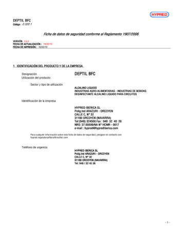 DEPTIL BFC Código : 0 320 1 Ficha de datos de seguridad conforme al Reglamento 1907/2006 VERSIÓN 3.5.0 FECHA DE ACTUALIZACIÓN : 16/03/10 FECHA DE IMPRESIÓN : 16/03/10 1 IDENTIFICACIÓN DEL PRODUCTO Y DE LA EMPRESA Designación Utilización del producto DEPTIL BFC Sector y tipo de utilización ALCALINO LIQUIDO INDUSTRIAS AGRO-ALIMENTARIAS - INDUSTRIAS DE BEBIDAS DESINFECTANTE ALCALINO LIQUIDO PARA CIRCUITOS Identificación de la empresa HYPRED IBERICA SL Polig.Ind ARAZURI - ORCOYEN CALLE C, N° 32 31160 ORCOYEN (NAVARRA) Tel:(948) 324500 Fax : 948324026 NRS: 37.00599/NA N° HCMR - 0017 e-mail : [email protected] Para cualquier información sobre esta ficha de datos de seguridad, póngase en contacto con: [email protected] Teléfono de urgencia HYPRED IBERICA SL Polig.Ind ARAZURI - ORCOYEN CALLE C, N° 32 31160 ORCOYEN (NAVARRA) Tel: 948 / 32 45 36 -1- DEPTIL BFC Código : 0 320 1 Ficha de datos de seguridad conforme al Reglamento 1907/2006 VERSIÓN 3.5.0 FECHA DE ACTUALIZACIÓN : 16/03/10 FECHA DE IMPRESIÓN : 16/03/10 2 IDENTIFICACIÓN DE LOS PELIGROS El producto está considerado como una preparación peligrosa según la Directiva 1999/45/EC. Símbolo(s) de peligro(s) : C: CORROSIVO, N: PELIGROSO PARA EL MEDIO AMBIENTE Riesgos principales : Provoca quemaduras graves. Riesgos para el medio ambiente : Muy tóxico para los organismos acuáticos. 3 COMPOSICIÓN / INFORMACIÓN SOBRE LOS COMPONENTES NATURALEZA QUÍMICA DEL PRODUCTO : ALCALINO LIQUIDO a - Sustancia(s) que contribuye(n) a los peligros : 2% <= Diaminopropillaurilamina < 5% b - Otra(s) sustancia(s) peligrosa(s) de acuerdo con la Directiva 1999/45/CE : 5% <= Sal de sodio del ácido etileno diamina tetracético < 15% c - Sustancias no incluidas en los puntos a y b, para las que existe límite de exposición en el lugar de trabajo : No concierne Sustancia(s) / Número(s) de CAS/ Número(s )EINECS : Sal de sodio del ácido etileno diamina tetracético / 64-02-8 / 200-573-9 Diaminopropillaurilamina / 2372-82-9 / 219-145-8 Símbolo(s)- Frase(s) R : Sal de sodio del ácido etileno diamina tetracético : Xn, R22;R38;R41 Diaminopropillaurilamina : C;N, R34;R48/22;R50 4 PRIMEROS AUXILIOS Contacto con la piel : Quítese immediatamente la ropa manchada o salpicada. Lavar inmediatamente y abundantemente con agua durante 15 minutos por lo menos. Consultar un dermatólogo. Contacto con los ojos : Aclarar inmediatamente y abundantamente con un ligero chorro de agua durante 15 minutos por lo menos, manteniendo los párpados bien abiertos. Consultar inmediatamente un oftalmólogo incluso en ausencia de lesiones aparentes. -2- DEPTIL BFC Código : 0 320 1 Ficha de datos de seguridad conforme al Reglamento 1907/2006 VERSIÓN 3.5.0 FECHA DE ACTUALIZACIÓN : 16/03/10 FECHA DE IMPRESIÓN : 16/03/10 Ingestión : Enjuagarse la boca. No provocar el vómito. Llamar al médico. Inhalación : Llevar al aire fresco. 5 MEDIDAS DE LUCHA CONTRA INCENDIOS Riesgos particulares : DEPTIL BFC es ininflamable. Medios de extinción recomendados : Agua pulverizada, espuma o nieve carbónica. Medios de extinción que se deben evitar : Ninguna que sepamos. Medidas de protección : Portar un aparato respiratorio autónomo y una combinación de protección. 6 MEDIDAS EN CASO DE VERTIDO ACCIDENTAL Precauciones personales : Respetar las medidas de protección mencionadas a la sección 5. Respetar las medidas de protección mencionadas a la sección 8. Precauciones para la protección del medio ambiente : Intervención limitada al personal cualificado. No verter el producto puro directamente en el desagüe o en el entorno. Método(s) de limpieza : Pequeño derrame : Bombear en una reserva de secorro. Gran derrame : Balizar, hacer un dique por medio de un absorbente inerte y bombear a un depósito de socorro. 7 MANIPULACIÓN Y ALMACENAMIENTO Manipulación : Quítese immediatamente la ropa manchada o salpicada. Evitar las proyecciones que el transcurso de la utilización. Evitar el contacto con los acidos fuentes y los oxidantes. -3- DEPTIL BFC Código : 0 320 1 Ficha de datos de seguridad conforme al Reglamento 1907/2006 VERSIÓN 3.5.0 FECHA DE ACTUALIZACIÓN : 16/03/10 FECHA DE IMPRESIÓN : 16/03/10 Almacenamiento : Dejar preferentemente en el envase de origen. Mantener el envase cerrado. Materiales de envase o de dosificación : Polietileno de alta densidad. -4- DEPTIL BFC Código : 0 320 1 Ficha de datos de seguridad conforme al Reglamento 1907/2006 VERSIÓN 3.5.0 FECHA DE ACTUALIZACIÓN : 16/03/10 FECHA DE IMPRESIÓN : 16/03/10 8 CONTROL DE LA EXPOSICIÓN / PROTECCIÓN PERSONAL Valores limite de la exposición : No disponible Equipo de protección individual : Protección de la manos : Llevar guantes de protección con resistancia química. Protección de ojos / cara : Llevar gafas de protección. Protección de la piel y cuerpo : Llevar botas y una ropa de protección con resistencia química. Medidas de higiene especificas : Ducha y fuente ocular en las proximidades de los lugares de trabajo. Después de cada uso, lavar sistemáticamente los equipos de protección individual. 9 PROPRIEDADES F ÍSICAS Y QU ÍMICAS Estado físico : Líquido límpido Color : Incoloro Olor : Característica Punto de congelación : 0 °C Punto de inflamación : No aplicable Solubilidad : Soluble en agua pH puro : 12,5+/- 0,5 pH a 10 gr/l: 10,6+/- 0,5 Densidad : 1,05+/- 0,01 g/cm3 10 ESTABILIDAD Y REACTIVIDAD Reaccion(es) peligrosa(s) : Evitar el contacto con los acidos fuentes y los oxidantes. -5- DEPTIL BFC Código : 0 320 1 Ficha de datos de seguridad conforme al Reglamento 1907/2006 VERSIÓN 3.5.0 FECHA DE ACTUALIZACIÓN : 16/03/10 FECHA DE IMPRESIÓN : 16/03/10 Condicion(es) que deben evitarse : Ninguna que se sepa. Materia(s) que deben evitarse : Acidos fuentes y los oxidantes. Producto(s) de descomposición peligroso(s) : Ninguna que se sepa en condiciones normales de empleo. Estas indicaciones se facilitan para la preparación concentrada. La aplicación de la preparación en forma 