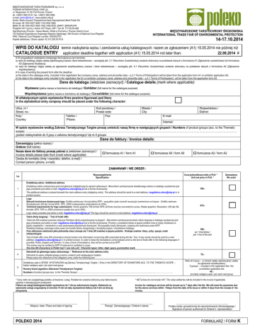MIĘDZYNARODOWE TARGI POZNAŃSKIE sp. z o. o. POZNAŃ INTERNATIONAL FAIR Ltd. ul. Głogowska 14, 60-734 Poznań, Poland tel. +48/61/ 869 23 61; fax. +48/61/ 869 2966 e-mail: [email protected] ; www.poleko.mtp.pl Konto / Bank account: Powszechna Kasa Oszczędności Bank Polski SA Nr konta: 38 1020 4027 0000 1102 0424 2962 IBAN: PL 46 1020 4027 0000 1402 1092 9075, SWIFT: BPKOPLPW Podatnik VAT czynny / Active VAT Payer, NIP / Tax ID: 777-00-00-488 Sąd Rejonowy Poznań – Nowe Miasto i Wilda w Poznaniu / Poznan District Court VIII Wydział Gospodarczy Krajowego Rejestru Sądowego / 8th Division of National Court Register KRS / National Court Register number: 0000202703 Kapitał zakładowy / Share capital: 42 310 200,00 PLN MIĘDZYNARODOWE TARGI OCHRONY ŚRODOWISKA INTERNATIONAL TRADE FAIR OF ENVIRONMENTAL PROTECTION 14-17.10.2014 WPIS DO KATALOGU termin nadsyłania wpisu i zamówienia usług katalogowych: razem ze zgłoszeniem (A1) 15.05.2014 nie później niŜ CATALOGUE ENTRY application deadline together with application (A1) 15.05.2014 not later than: 22.08.2014 # # W przypadkach nadesłania niniejszego formularza po tym terminie: a) wpis do katalogu objęty opłatą rejestracyjną (nazwa i dane teleadresowe – szczegóły pkt. 3.1 Warunków Uczestnictwa) zostanie dokonany na podstawie danych z formularza A1 (Zgłoszenie uczestnictwa) lub formularza A0 (Zgłoszenie Wystawcy) b) wpis do katalogu objęty opłatą za zgłoszenie współwystawcy (nazwa i dane teleadresowe – szczegóły pkt. 4.1 Warunków Uczestnictwa) zostanie dokonany na podstawie danych z formularza A2 (Zgłoszenie współwystawcy). # In case of sending the present form after the deadline: a) the data in the catalogue entry, included in the registration fee (company name, address and phone/fax data – p.3.1 Terms of Participation) will be taken from the application form A1 or exhibitor application A0, b) the data in the catalogue entry included in the registration fee for co-exhibitor (company name, address and phone/fax data – p.4.1 Terms of Participation) will be taken from the application form A2. Dane do katalogu (właściwe zaznaczyć) / Catalogue details (mark where applicable): Wystawca (pełna nazwa w brzmieniu do katalogu) / Exhibitor (full name for the catalogue purpose): Wspólwystawca (pełna nazwa w brzmieniu do katalogu) / Co-exhibitor (full name for the catalogue purpose): W alfabetycznym spisie wystawców firma powinna figurować pod literą: In the alphabetical entry company should be placed under the following character: Ulica, nr / Street, no.: Kraj / Country: Telefon / Phone: Kod pocztowy / Postal code: Fax: Miasto / City: Województwo / District: E-mail: Internet: W spisie wystawców według Zakresu Tematycznego Targów proszę umieścić naszą firmę w następujących grupach / Numbers of product groups (acc. to the Thematic scope): .....................................................................................................…………………………………………………………………………………………………………………………… (podać maksymalnie do 5 grup z zakresu tematycznego)/ Up to 5 groups Dane do faktury / Invoice details: Zamawiający (pełna nazwa) / Orderer (full name): Nasze dane do faktury proszę pobrać z (właściwe zaznaczyć) / Invoice details please take from (mark where applicable): Osoba do kontaktu (imię i nazwisko, telefon, e-mail) / Contact person (phone, e-mail): formularza A1 / form A1 formularza A0 / form A0 formularza A2 / form A2 ZAMAWIAMY / WE ORDER : Lp. Wyszczególnienie Specification 1. Dodatkowy adres / Additional address Dodatkowy adres umieszczany jest pod głównym (obligatoryjnym) wpisem adresowym. Warunkiem zamieszczenia dodatkowego adresu w katalogu wystawców jest jego przesłanie pod adres e-mail: [email protected] lub w formie drukowanej. The additional address is placed beneath the main address entry (obligatory entry). The address should be send to e-mail address: [email protected] or in printed version. 169,- 2. Logo Warunki techniczne dostarczania logo: Grafika wektorowa: format plików EPS – wszystkie uŜyte czcionki muszą być zamienione na krzywe. Grafika rastrowa: Rozdzielczość 300 dpi, format EPS, TIFF, JPEG (maksymalna utrata jakości do 20%). Technical requirements for logo submissions: Vector graphics: File format: EPS; all fonts must be converted to curves. Raster graphics: Resolution: 300 dpi; file formats: EPS, TIFF or JPEG (maximum quality loss up to 20%). Logo naleŜy przesłać pod adres e-mail: [email protected]/ The logo should be send to e-mail address: [email protected] 579,- 3. Tekst oferty targowej / Text of trade offer Tekst (do 600 znaków) powinien dotyczyć Państwa oferty prezentowanej na targach. Warunkiem zamieszczenia tekstu oferty targowej w katalogu wystawców jest jego przesłanie pod adres e-mail: [email protected] lub w formie drukowanej. Prosimy o przesłanie tekstu w języku polskim oraz w miarę moŜliwości w języku angielskim i niemieckim w celu zachowania poprawności tłumaczeń. W przypadku braku tłumaczeń, zostaną one wykonane przez MTP. Redakcja katalogu zastrzega sobie prawo do korekty tekstu niezgodnego z tematyką targów i charakterem katalogu. Przy obliczaniu naleŜności jako jednostkę miary stosuje się 1 linię (60 znaków) w języku polskim. Rodzaje znaków: litery, cyfry, spacje, znaki interpunkcyjne. Text of trade offer (max 600 characters) should contain only information concerning offer presented during the fair. Text in key words should be send to e-mail address: [email protected] or in printed version. In order to keep the translations correct please send us the text of trade offer in the following languages if possible: Polish, English and German. In case of lack of translations, they will be carried out by MTP. The entries may be verified by MTP if irrelevant to exhibition’s scope. One line (60 characters) in Polish text = one rate