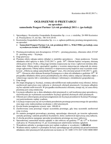 Kozienice dnia 08.02.2017 r. OGŁOSZENIE O PRZETARGU na sprzedaż: samochodu Peugeot Partner 1,6 rok produkcji 2011 r. (po kolizji) 1. Sprzedający: Kozienicka Gospodarka Komunalna Sp. z o.o. z siedzibą: 26-900 Kozienice ul. Przemysłowa 15, tel./fax. /48/ 614-24-03. 2. Kozienicka Gospodarka Komunalna Sp. z o. o. ogłasza publiczny przetarg nieograniczony, na sprzedaż: Samochód Peugeot Partner 1,6, rok produkcji 2011 r., WKZ 99RJ, po kolizji, cena wywoławcza brutto 13.530,00 zł. 3. Przetarg prowadzony jest dwuetapowo: ETAP I – przetarg pisemny, zbieranie ofert; ETAP II - przetarg ustny – licytacja. 4. Etap pierwszy: a) Pisemne oferty zakupu należy składać w siedzibie sprzedawcy - biuro podawcze. Termin składania ofert upływa w dniu 23.02.2017 r. godz. 1000. Oferent będzie związany złożoną ofertą przez okres 14 dni, a bieg tego terminu rozpoczyna się wraz z upływem terminu składania ofert. Ofertę należy sporządzić zgodnie z wzorem stanowiącym załącznik do niniejszego ogłoszenia. Ofertę należy umieścić w nieprzezroczystej kopercie oraz wyraźnie oznakować: „Oferta na zakup samochodu Peugeot” oraz „Nie otwierać przed 23.02.2017 r. godz. 1005”. Otwarcia ofert dokona Komisja Przetargowa w dniu ich składania o godzinie 1005. W przypadku składania oferty przez przedsiębiorcę do oferty należy załączyć aktualny odpis z właściwego rejestru lub z centralnej ewidencji i informacji o działalności gospodarczej. 5. Etap drugi: a) Do etapu drugiego tj. licytacji, zostaną zakwalifikowani maksymalnie trzej oferenci, którzy zaoferowali najwyższe ceny nabycia w złożonych ofertach pisemnych. Licytacja odbędzie się bez udziału osób trzecich. W przypadku nieobecności oferenta, uznaje się, że cena oferty pisemnej jest ceną ostateczną. b) Licytacja odbędzie się w dniu składania ofert pisemnych w sali konferencyjnej sprzedawcy, niezwłocznie po wyłonieniu uczestników licytacji spośród złożonych ofert pisemnych. c) Oferent jest zobowiązany przed przystąpieniem do licytacji przedstawić Komisji Przetargowej potwierdzenie wpłaty wadium. d) Licytacja rozpoczyna się od wywołania przedmiotu przetargu przeznaczonego do sprzedaży oraz jego ceny maksymalnej uzyskanej z ofert pisemnych. e) Kwota brutto postąpienia wynosi: min. 100,00 zł. f) Zaoferowana cena przestaje wiązać uczestnika przetargu, gdy inny uczestnik zaoferował cenę wyższą. g) Po ustaniu postąpień prowadzący przetarg, uprzedzając obecnych, po trzecim ogłoszeniu zamyka przetarg i udziela przybicia licytantowi, który zaoferował najwyższą cenę nabycia. h) Z chwilą przybicia następuje sprzedaż przedmiotu przetargu na rzecz nabywcy. 6. Sprzedawany samochód można oglądać w dni robocze od godziny 700 do 1500 w Kozienicach przy ul. Przemysłowej 15, po wcześniejszym umówieniu terminu oględzin. 7. Warunkiem udziału w postępowaniu jest wpłata wadium w wysokości: 1.400,00 zł. 8. Wadium należy wpłacić w pieniądzu do kasy sprzedającego nie później niż przed terminem składania ofert pisemnych lub przelewem na konto nr: 81 1600 1374 1837 6383 8000 0005 z dopiskiem „WADIUM – PEUGEOT” nie później niż do dnia 22.02.2017 r.. Za skuteczność operacji finansowo-bankowych odpowiada oferent. 9. Wadium złożone przez oferentów, których oferty nie zostaną przyjęte, zostanie zwrócone bezpośrednio po dokonaniu wyboru oferty, a oferentowi, którego oferta została przyjęta (zaoferował najwyższą cenę) zostanie zarachowane na poczet ceny nabycia. 10. Wadium przepada na rzecz sprzedawcy, jeżeli oferent, którego oferta zostanie przyjęta, uchyla się od zawarcia umowy – nie wpłacił ceny nabycia w wymaganym terminie. 11. Sprzedawca wybierze oferenta, który zaoferował najwyższą cenę za przedmiot sprzedaży. Nabywca jest obowiązany zapłacić cenę nabycia niezwłocznie lub w terminie nie dłuższym niż 14 dni kalendarzowych od przetargu. Nabywca, który w wymaganym terminie nie uiści ceny nabycia, traci prawa nabycia oraz złożone wadium. 12. Uczestnikom przetargu nie przysługuje prawo domagania się zwrotu kosztów poniesionych w związku z uczestnictwem w postępowaniu przetargowym. 13. Wydanie przedmiotu sprzedaży nabywcy nastąpi niezwłocznie po zapłaceniu ceny brutto nabycia. 14. Sprzedający zastrzega sobie prawo unieważnienia przetargu bez podania przyczyny. 15. Dodatkowych informacji w sprawie przetargu udzielają: a) Andrzej Wołos – w sprawach technicznych tel. /48/ 614-24-03, 698-633-493, b) Dariusz Brzozowski – w sprawach formalnych tel. /48/ 614-60-84, 698-633-490. Prezes Zarządu – Robert Wojcieszek